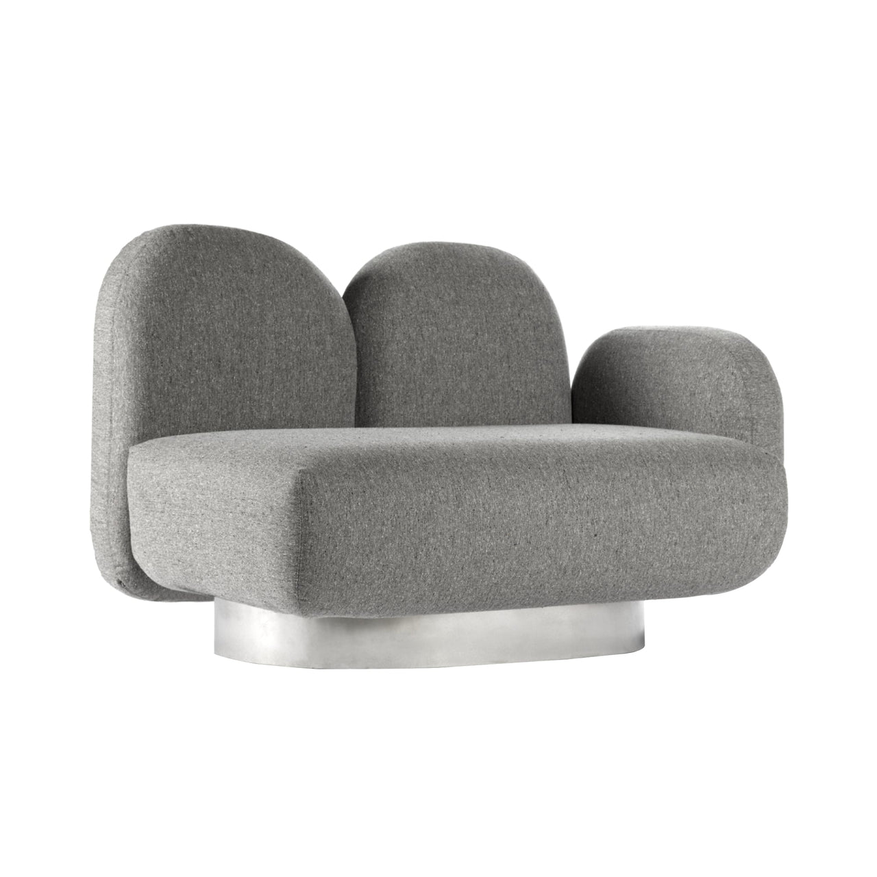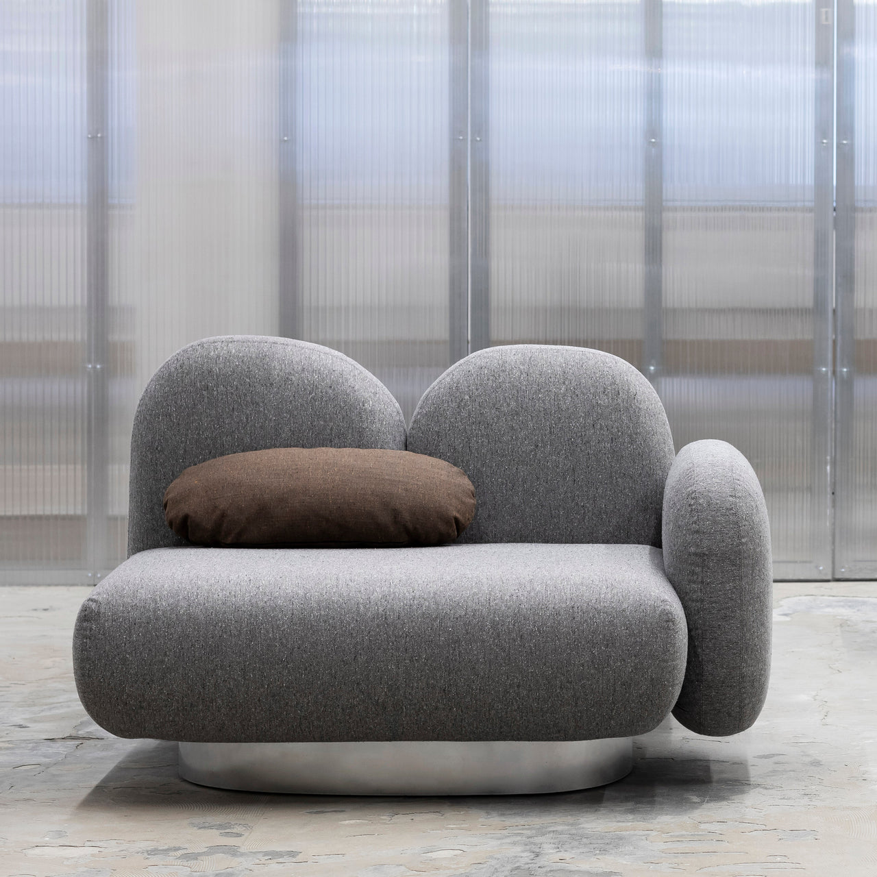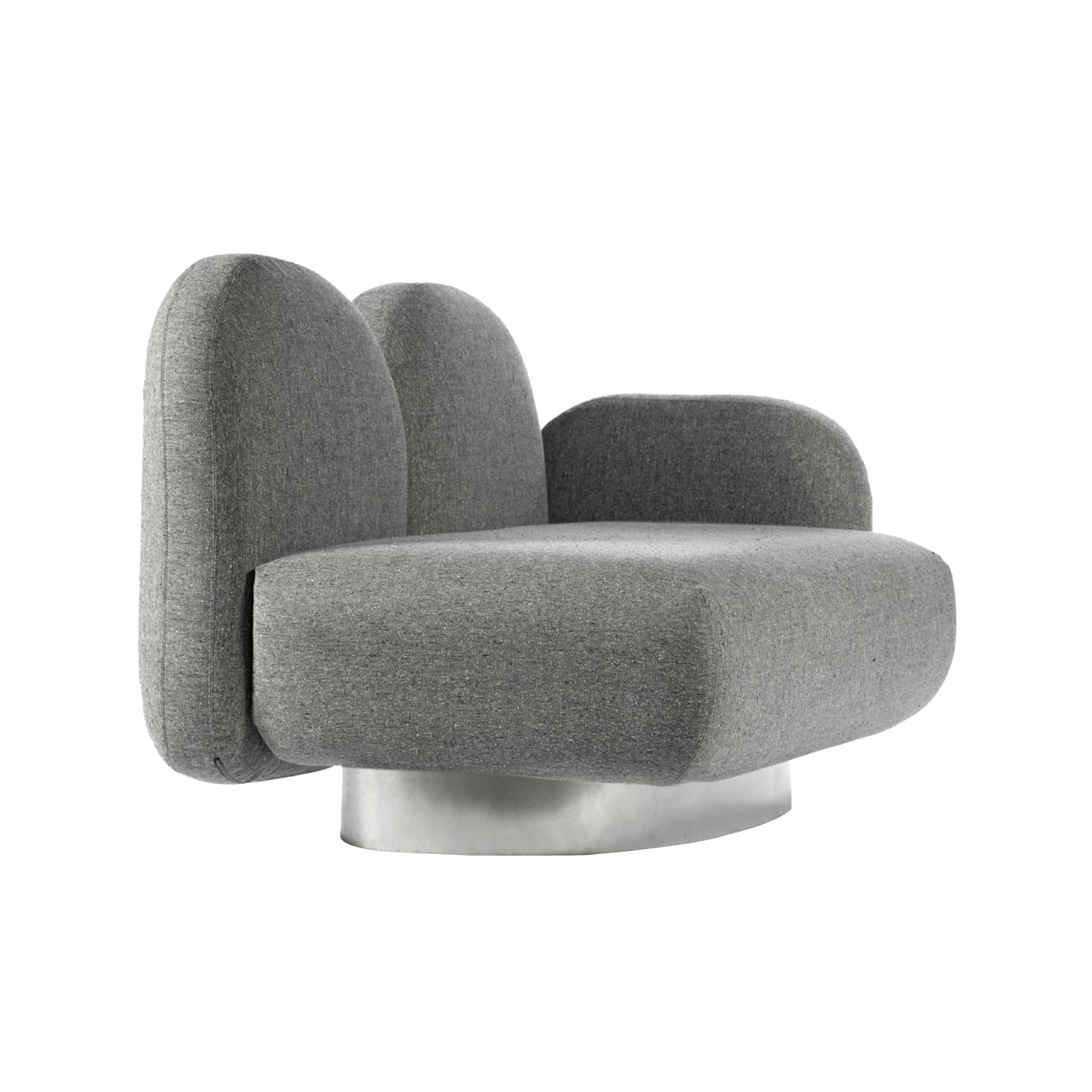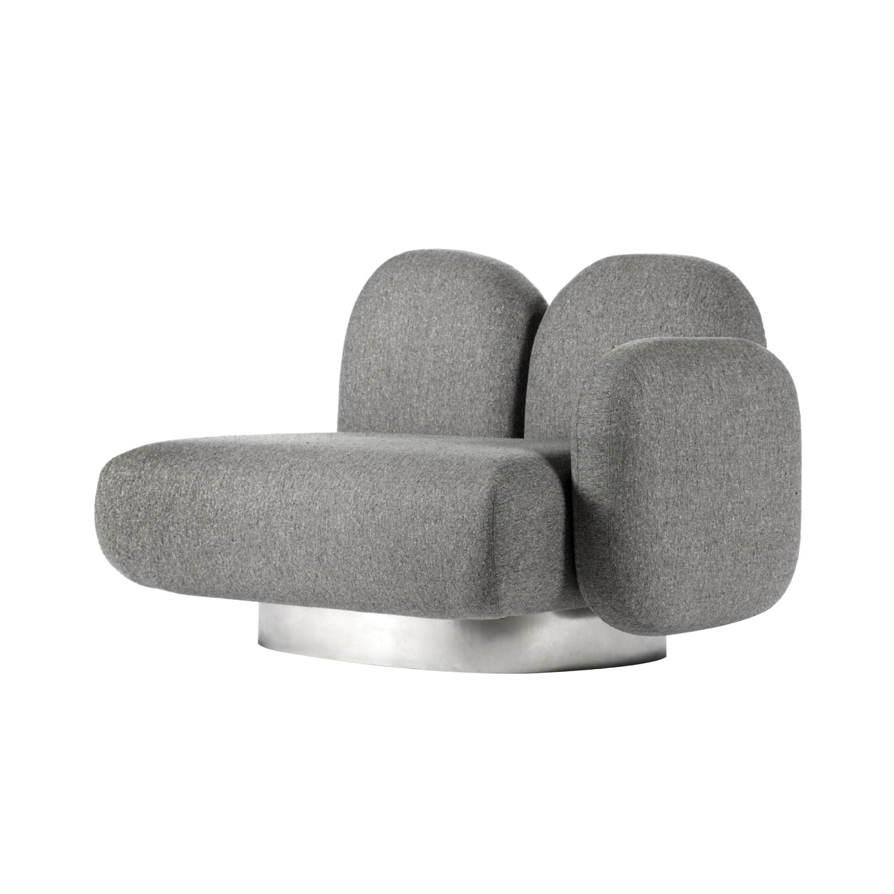A single-seater makes a versatile addition to Assemble, the organically rounded seating collection by Destroyers/Builders for Valerie Objects. In configurations with the 2-seat unit, corner module and ottoman, the foam-fill sofa adapts to suit any space. Suggested by the shape of weathered stones, the curved cushioning is neither too firm nor too soft. With armless, single-arm and twin-arm options and a choice of upholstery, it also features a recessed wood base clad in natural aluminum.