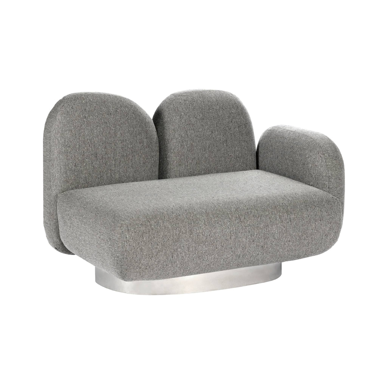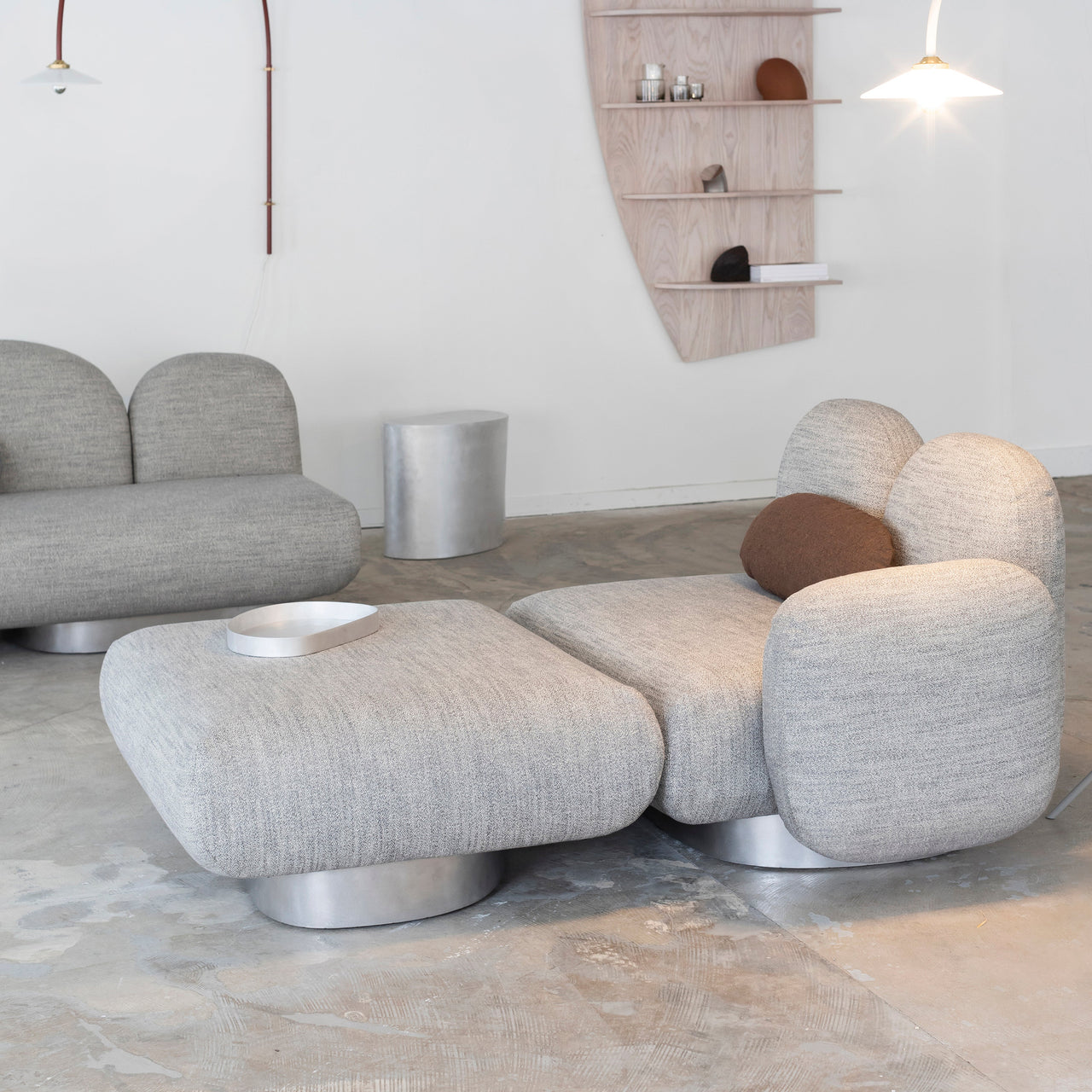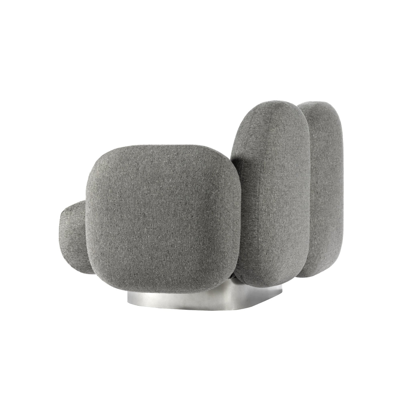 A single-seater makes a versatile addition to Assemble, the organically rounded seating collection by Destroyers/Builders for Valerie Objects. In configurations with the 2-seat unit, corner module and ottoman, the foam-fill sofa adapts to suit any space. Suggested by the shape of weathered stones, the curved cushioning is neither too firm nor too soft. With armless, single-arm and twin-arm options and a choice of upholstery, it also features a recessed wood base clad in natural aluminum.