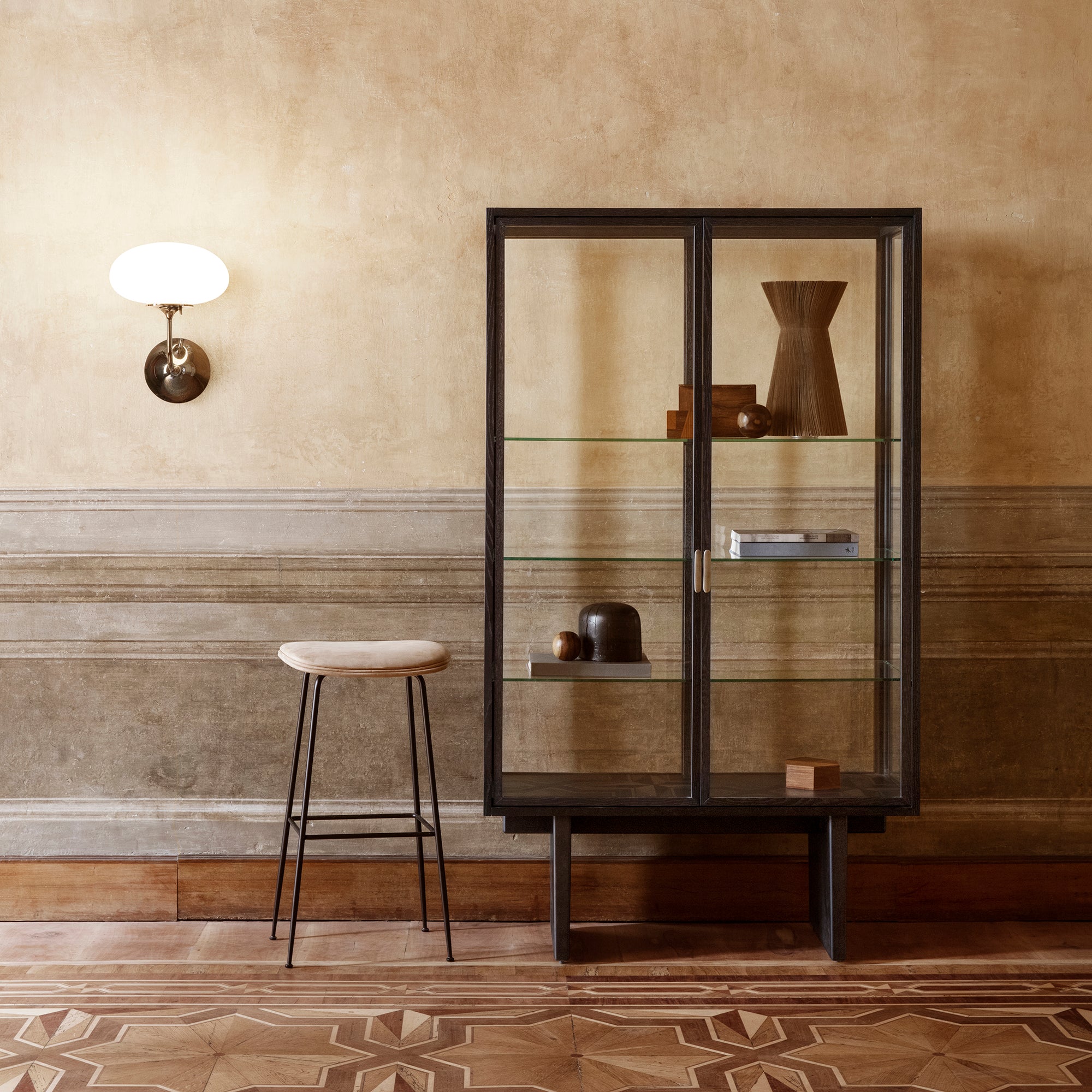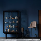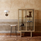 With clean lines, pure symmetry and tonal restraint, Private Vitrine makes a commanding cabinet for the bedroom, lounge or kitchen (not to mention hospitality spaces and hotels). Its brown-black or light oak stained veneer structure encloses a tall glass case, recessed into the frame to create depth and featuring 3 glass display shelves. Space Copenhagen drew lightly from Japanese antiques in characteristic joinery design details and fine touches like grain-matched veneers.