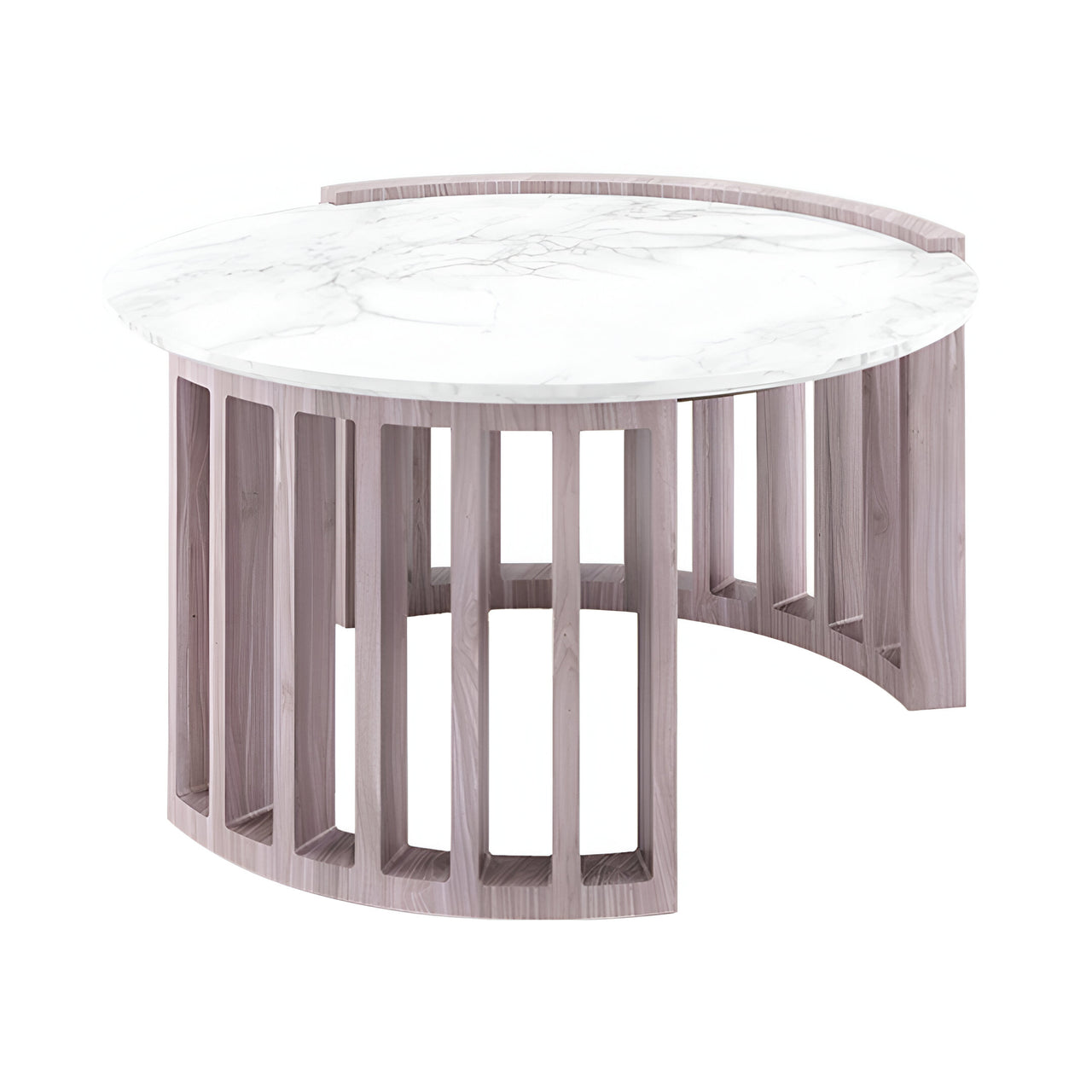 The Stellar Works Eclipse Coffee Table is a sculptural piece designed by William Gray. It features a single stone tabletop supported by an intricately notched wood base, creating a dynamic structure that plays with positive and negative space. This design allows for unique visual effects as the table reveals different angles depending on the viewer’s perspective. Available in oak and walnut finishes.