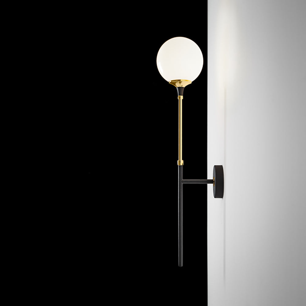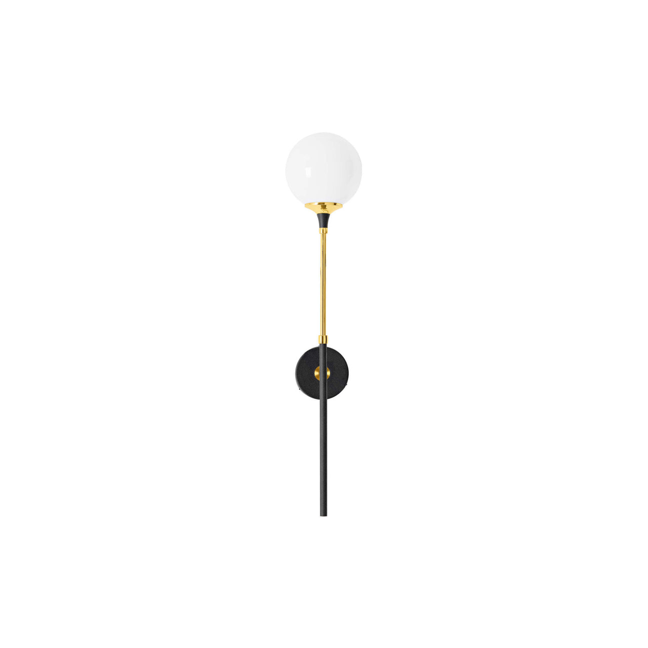 The Galassia Wall Sconce by Stilnovo, designed in 1959, captures 1950s charm with its brass structure featuring galvanic gilding and a white triplex blown glass sphere. The single-bulb and the combination of brass and glass gives it a timeless, refined look.