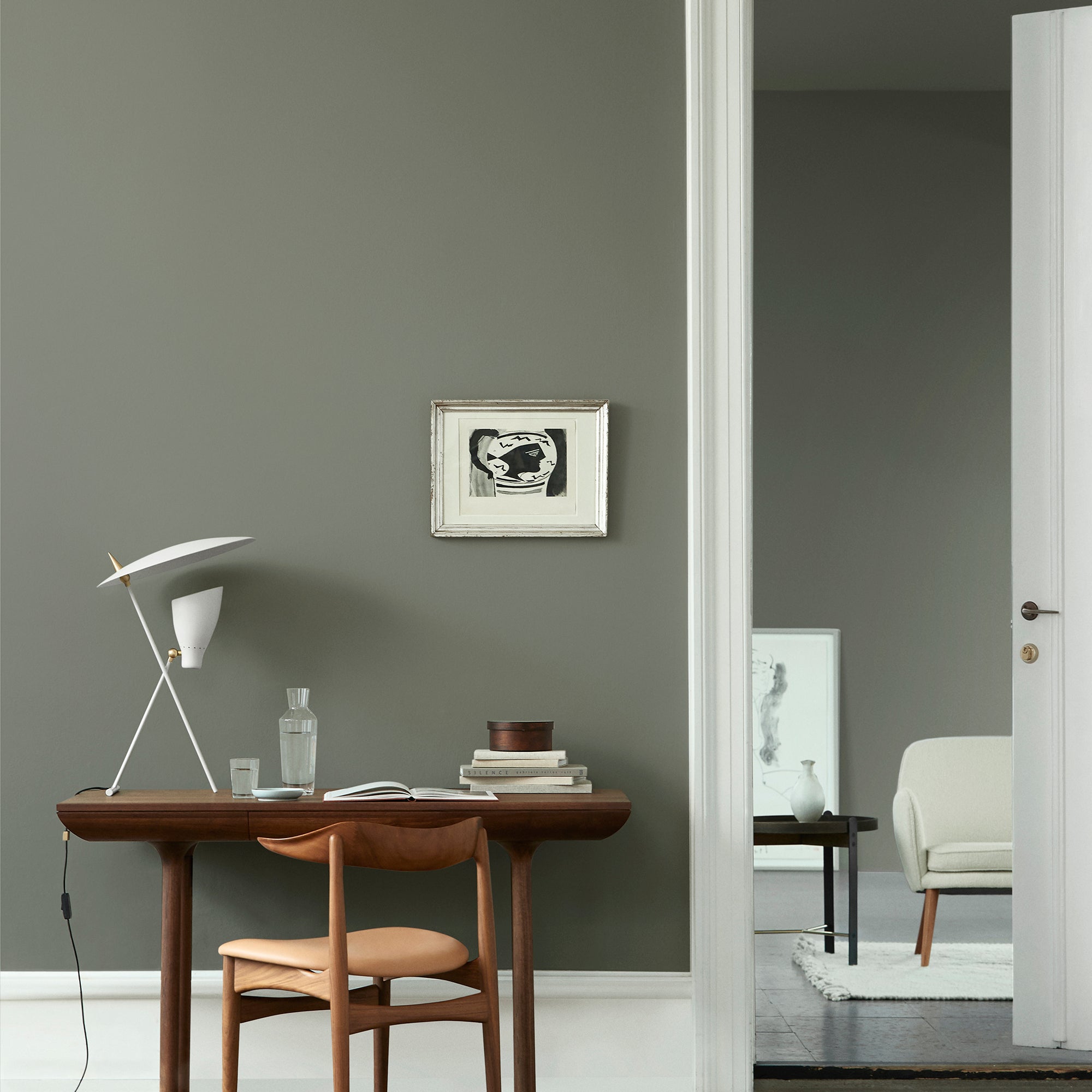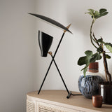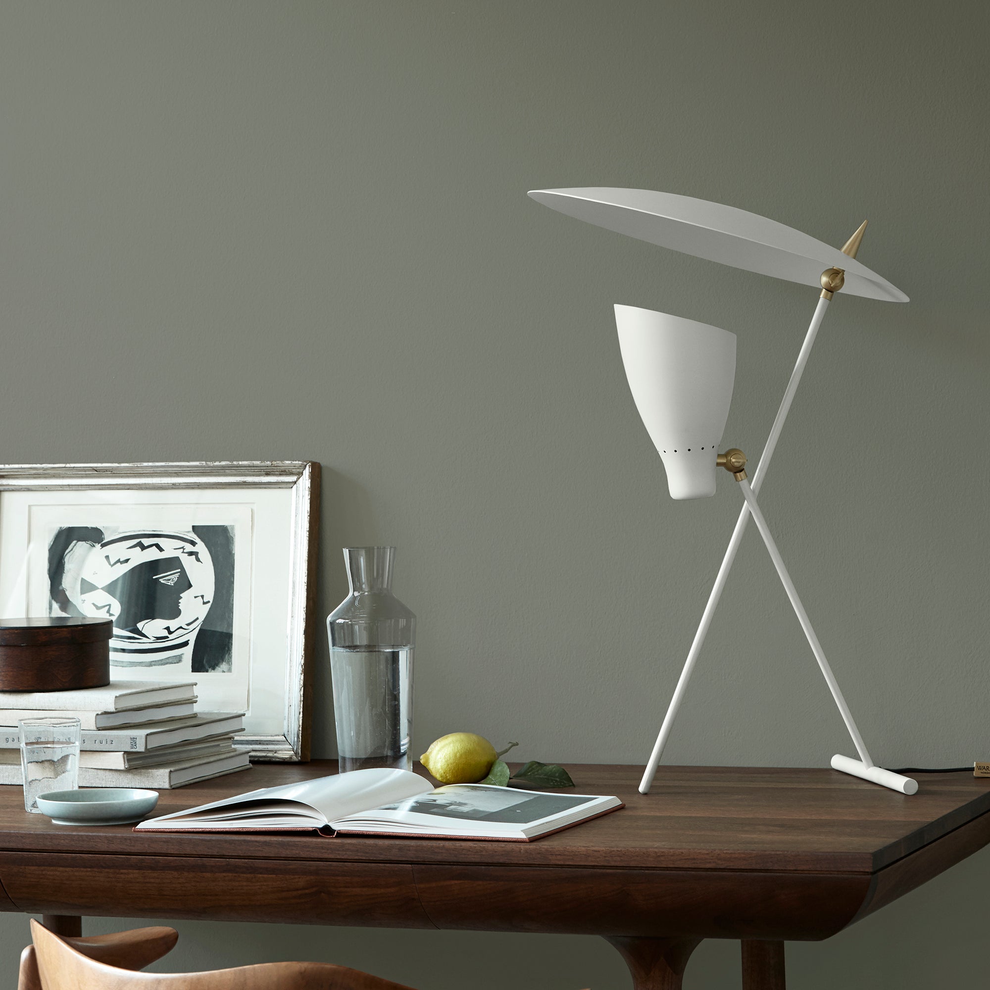 The Silhouette Table Lamp features an asymmetrical design with a reclining, slanted shade that reflects light from the upward-facing source against the wide metal shade, creating a soft, ambient glow. Crafted from lacquered steel with solid brass details, it is available in Pure Cashmere, Black Noir, and Warm White.