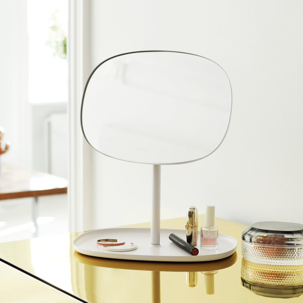 Spanish designer Javier Moreno rethinks the vanity mirror from all sides in this curved catchall for Norman Copenhagen. Glass mirror can be turned up, down and rotated 360 degrees. Organically shaped mirrored top is reflected in the base, ideal for jewelry, make-up and whatnots. The overall softness is underscored by the matte powder-coat finish. Position it on a table near the front door for keys and a last look before heading out.