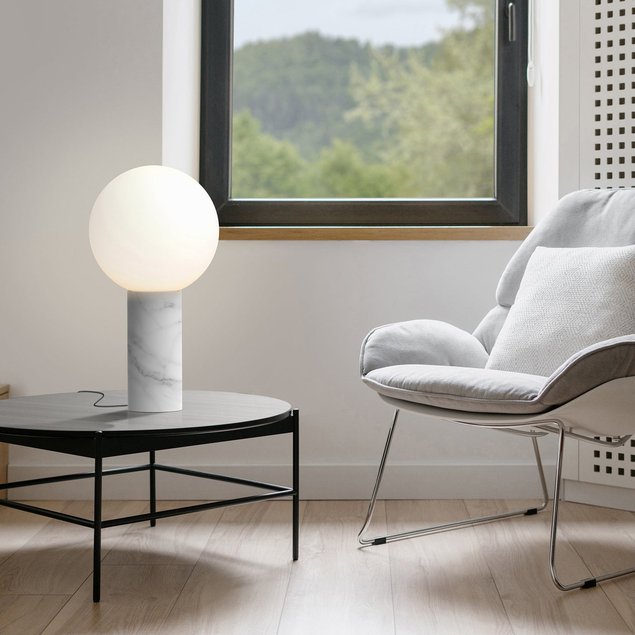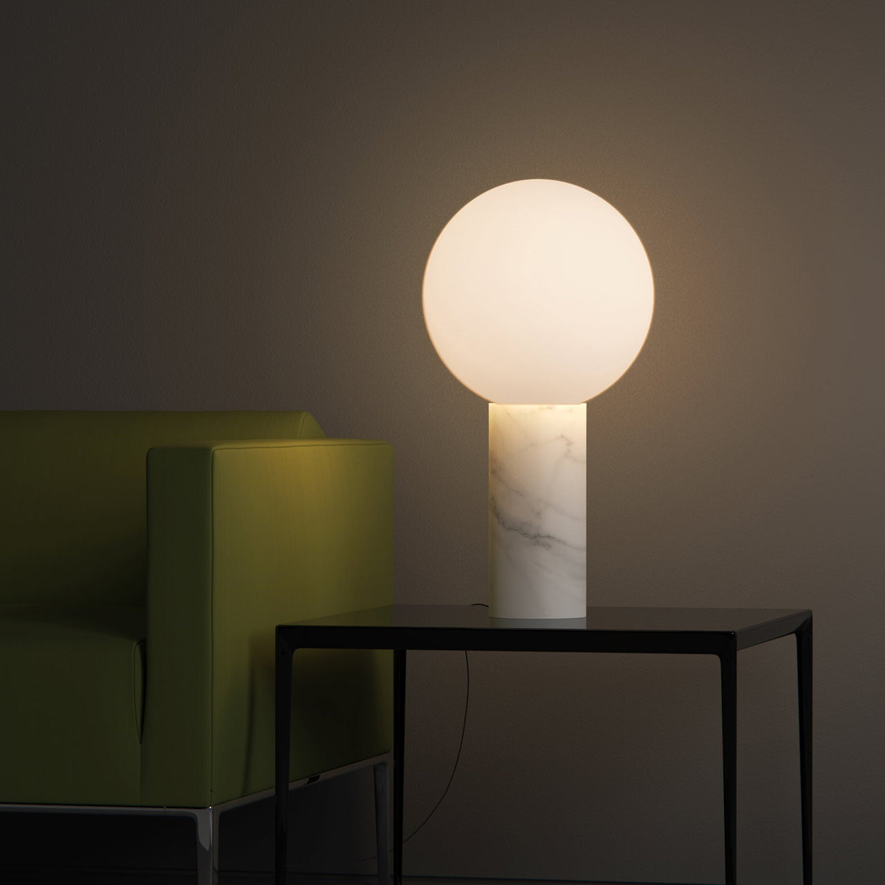 Chic and sculptural, Pilar features a stately column in luxurious marble topped with a substantial globe light in a refined play on an iconic silhouette. Offered with either a Carrara white and Marquina black marble base and frosted opal glass sphere, the geometric proportions bring out the character of its nuanced materials. With warm ambient illumination suitable for a range of spaces, Pablo's table lamp also features an inline full–range dimmer to select any desired light setting.