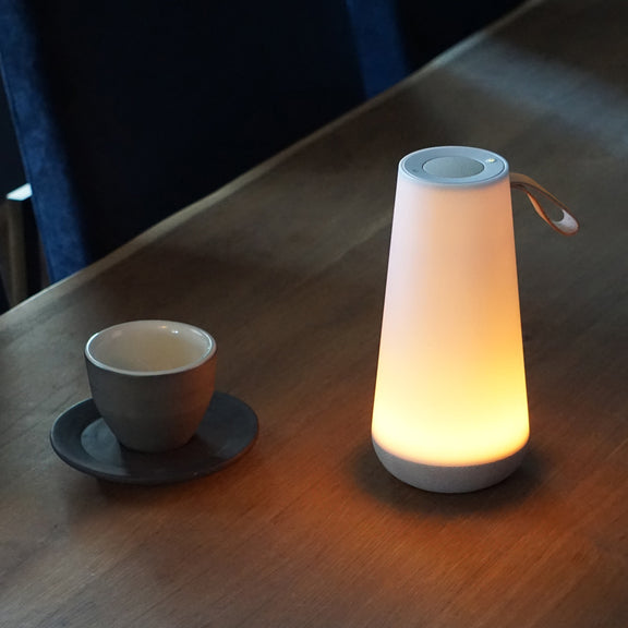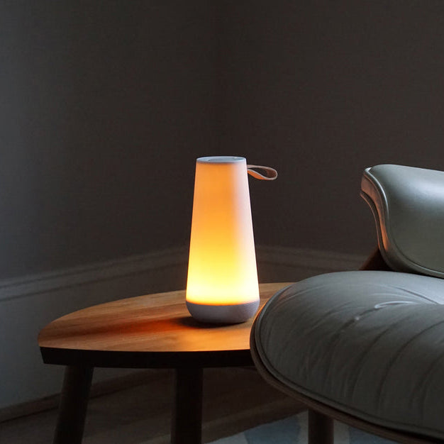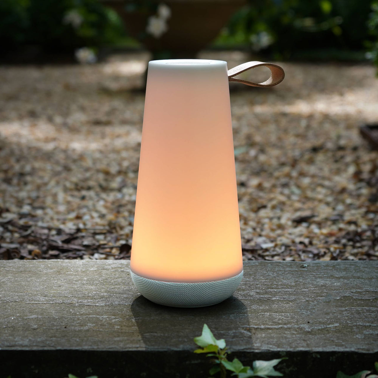 Taking light and music on the go is even easier with the mini version of Pablo's portable lantern UMA. It fuses state-of-the-art LED technology with 360° high-fidelity surround sound and even allows for a rockin' shindig with a "party mode" feature that allows up to 24 units to be paired via Bluetooth. Touch-sensitive volume control and 2 soft-light settings help set the perfect mood—and volume and music selection can also be managed from any mobile device. With up to 20 hours of wireless play per charge, UMA has a handy attached leather carrying handle and comes with a canvas travel bag.
