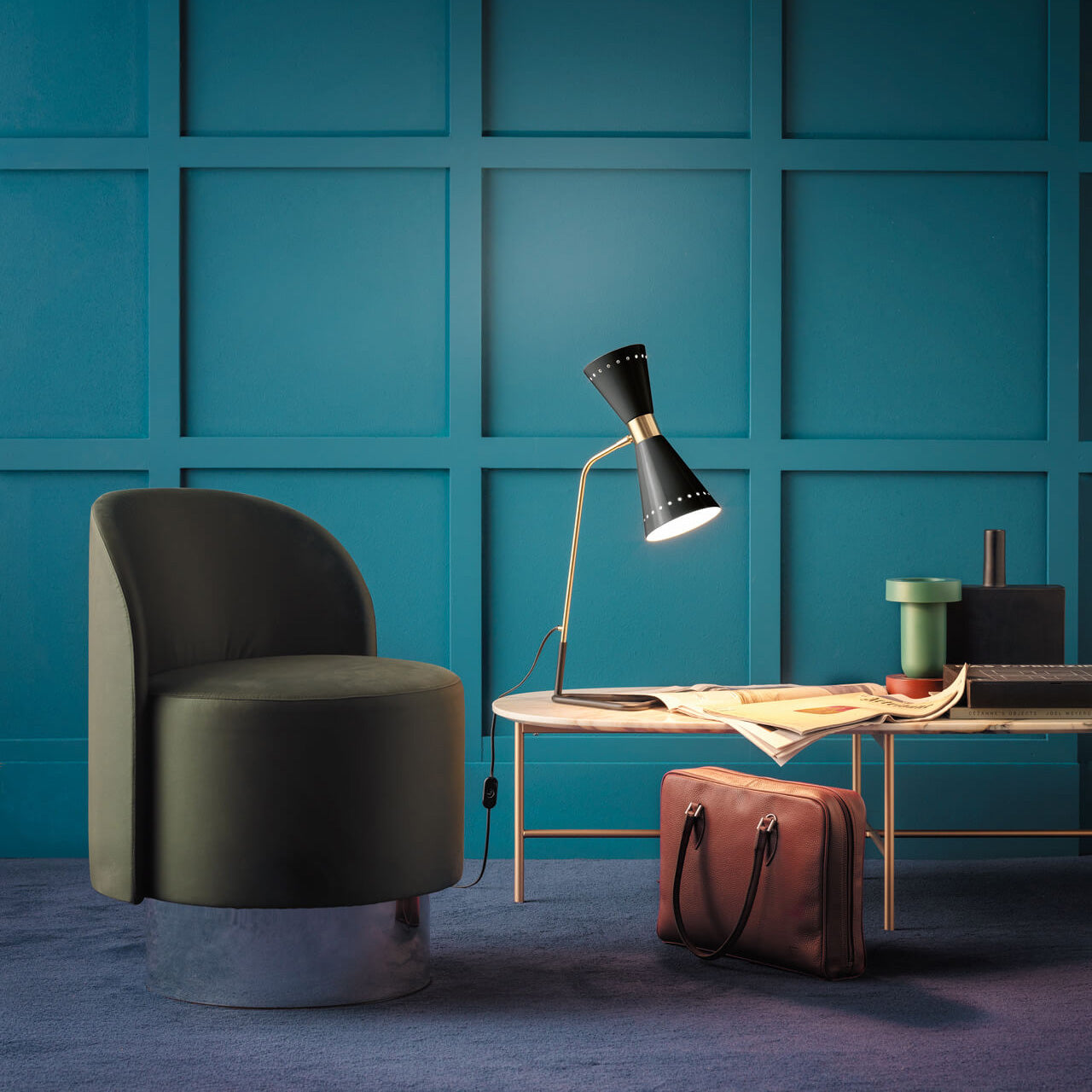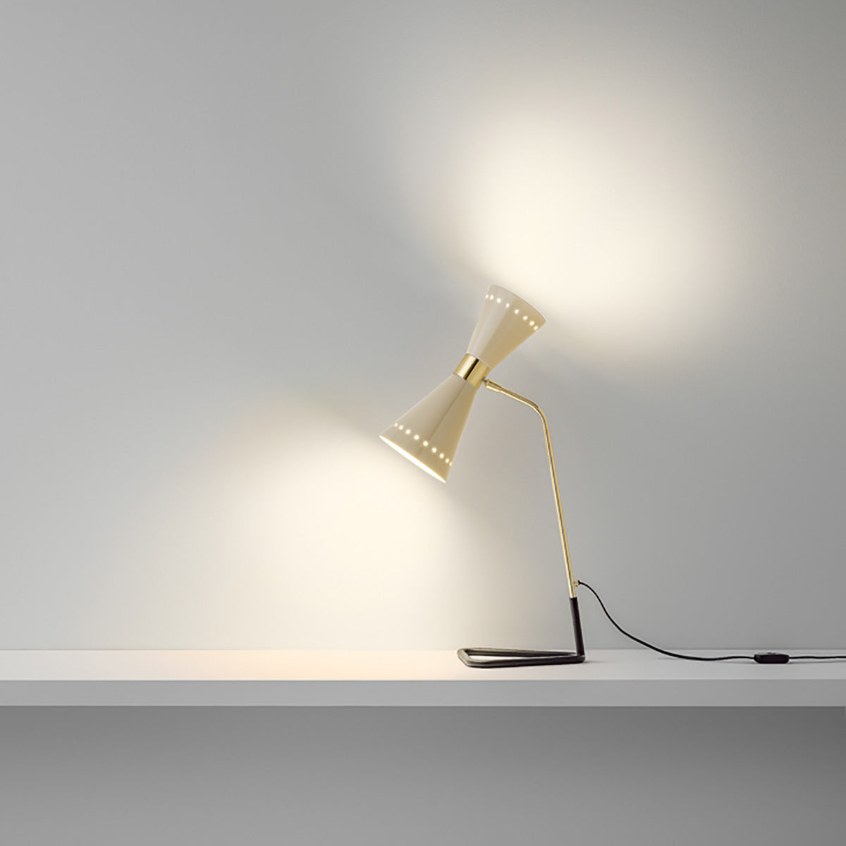 The Megafono Table Lamp by Stilnovo is an iconic 1950s design that provides both direct and indirect light. It features a double-cone, adjustable lampshade available in either ivory or glossy black, paired with a brass stem that has been finished with galvanic gilding for a refined touch.