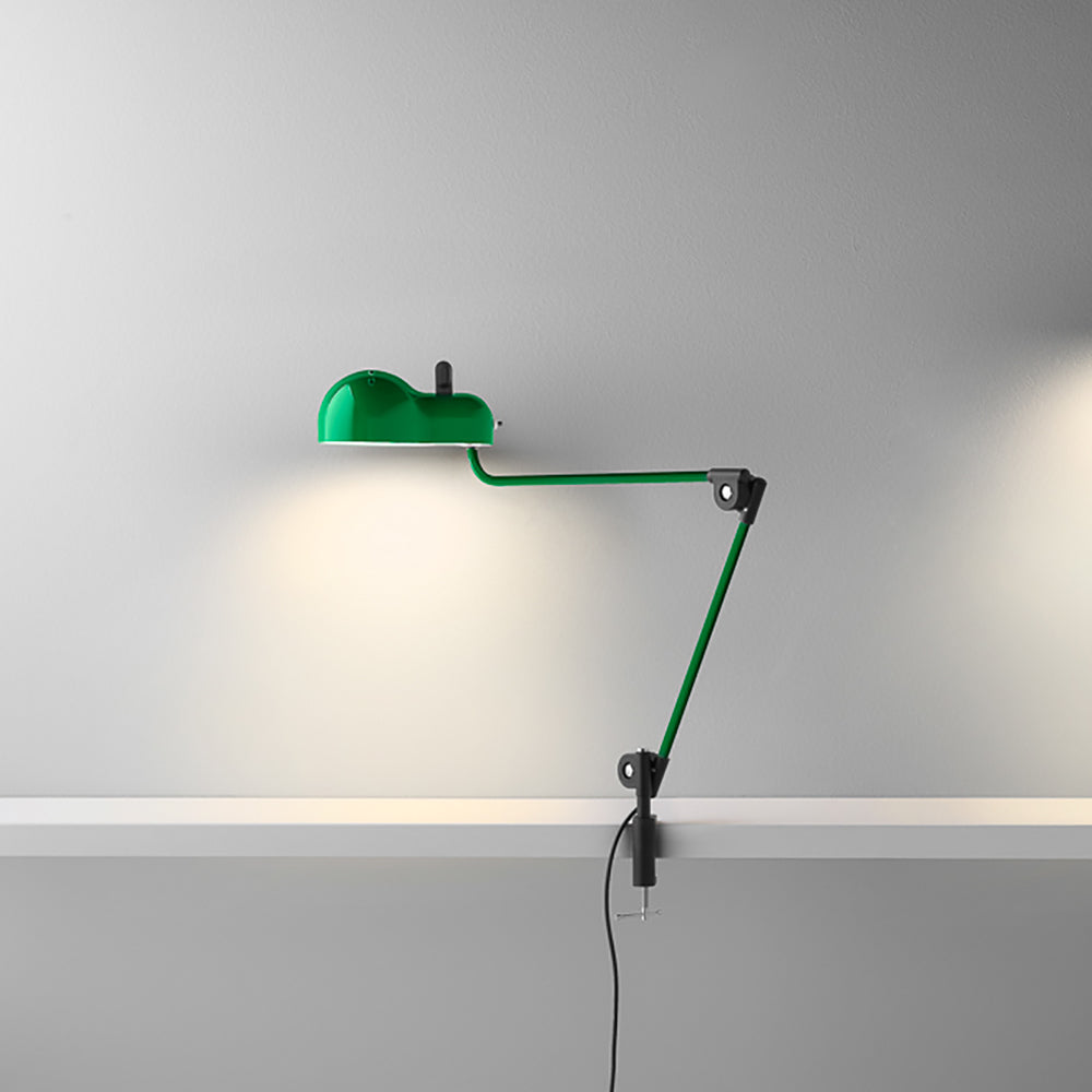 The Topo Table Lamp with clamp, designed by Joe Colombo in 1970, is inspired by automotive elements, featuring slits on its metal shell reminiscent of 1960s sports car vents. Its lampshade is shaped to fit a classic E27 bulb, while jointed metal arms and the adjustable clamp made of painted aluminum, providing flexibility in positioning. The lamp is available in finishes like glossy white, black, green, chrome, or iconic red. A black, heat-insulating handle enables easy adjustment.