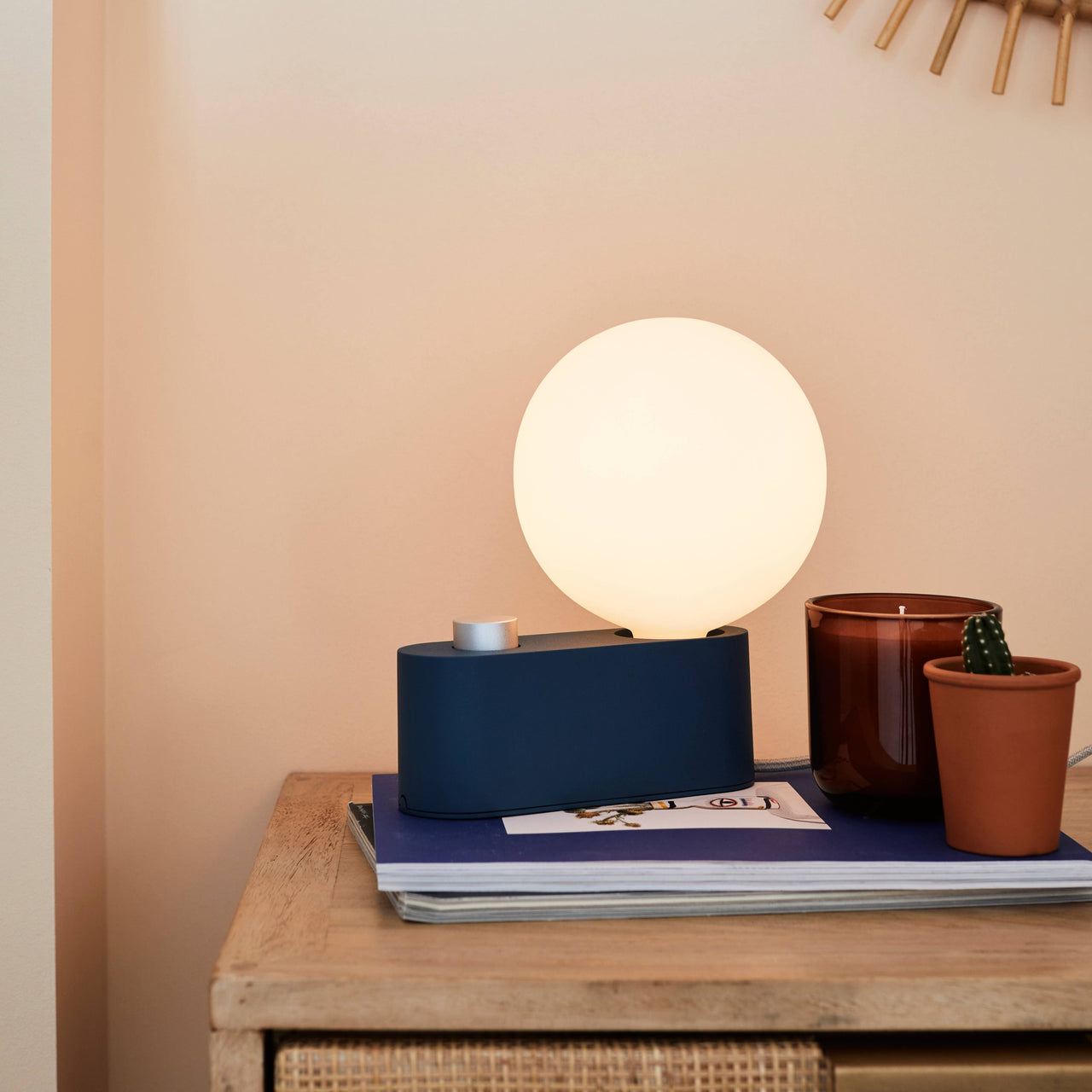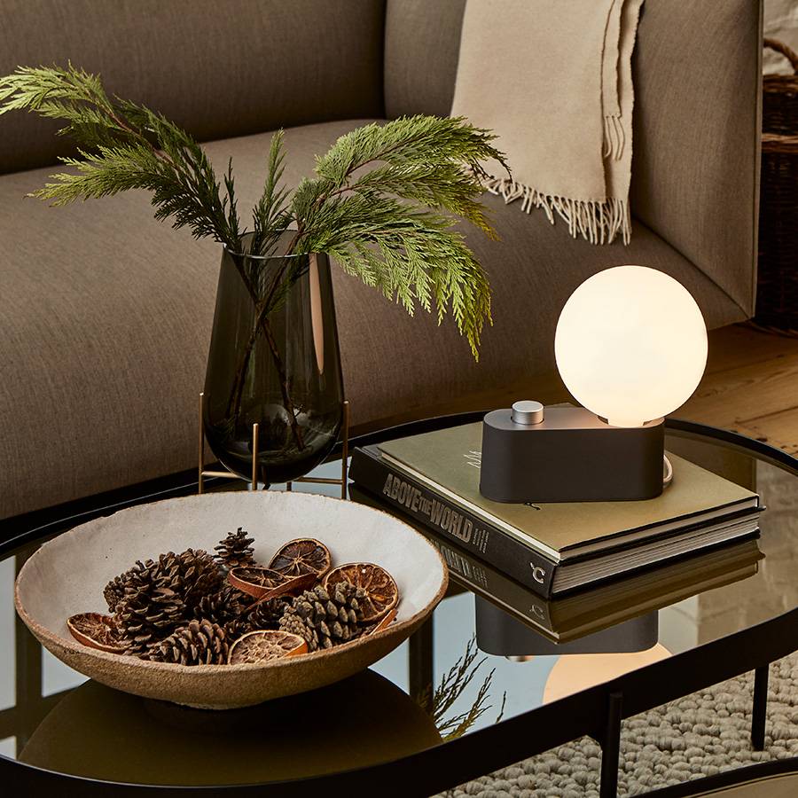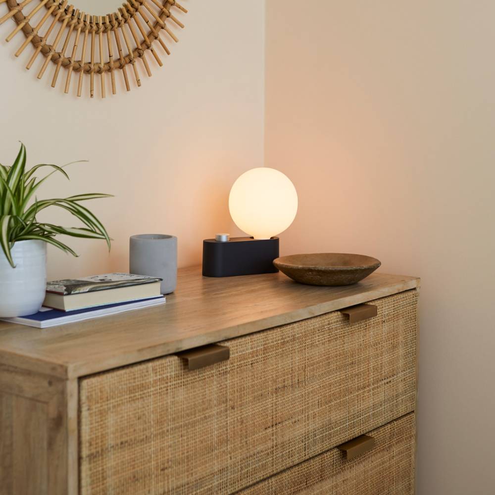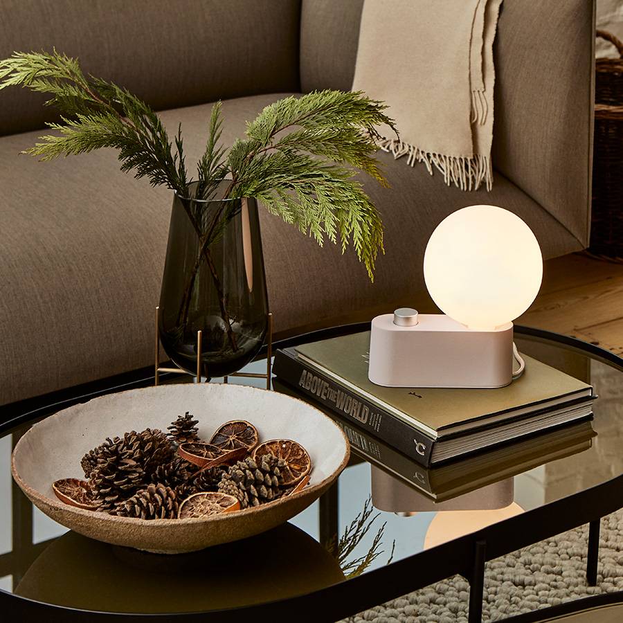 As either a table lamp or wall sconce, versatile Alumina offers multiple display options. Fashioned from lightweight aluminum, it’s finished in a range of subtle hues, including a muted pink called Blossom. The lamp is paired with the matte-porcelain Sphere IV LED bulb, featuring London maker Tala’s own Dim to Warm technology.