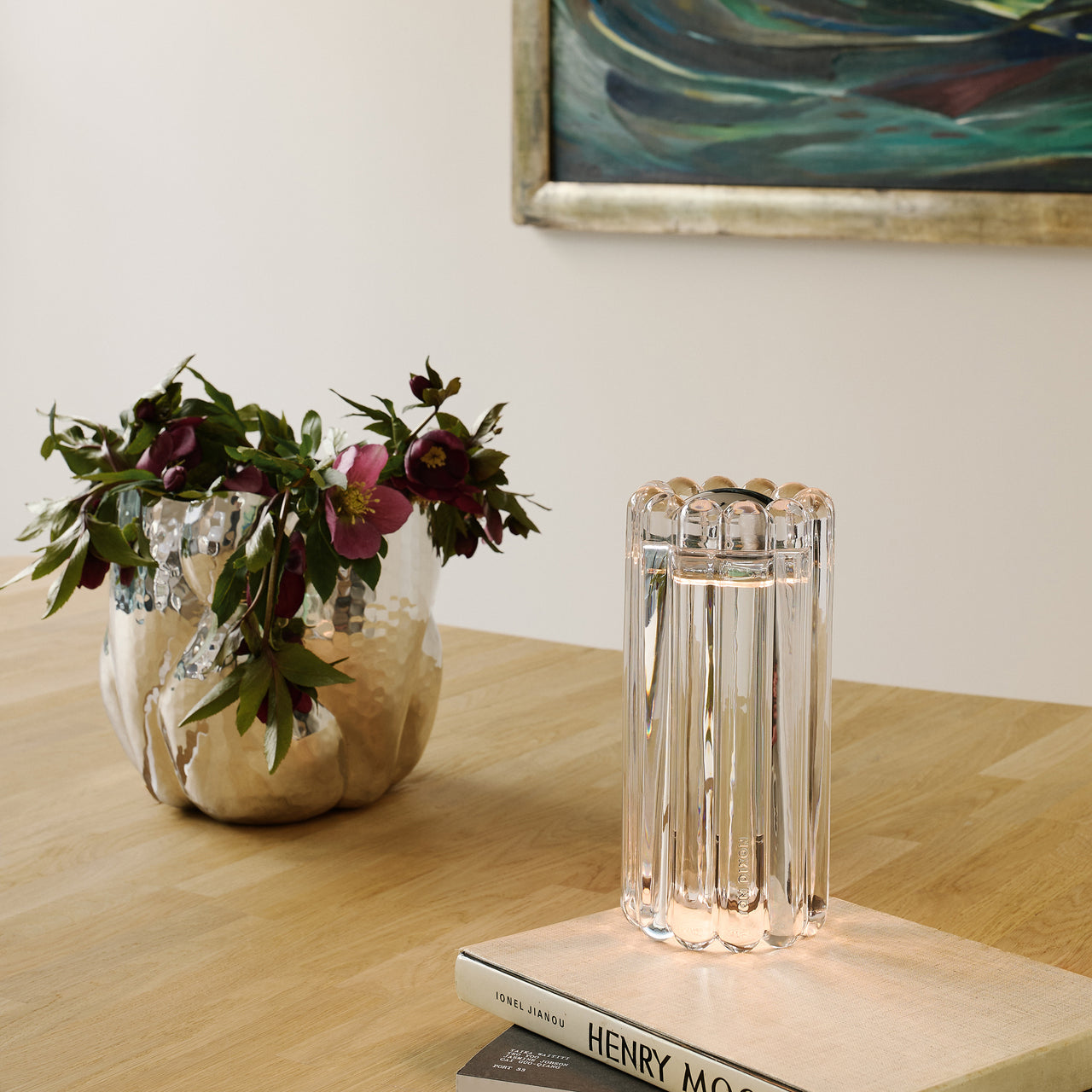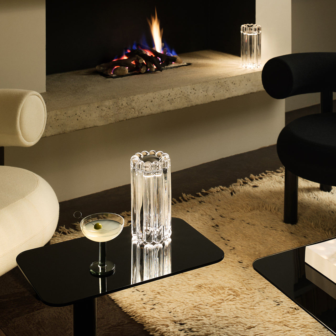 Made from thick, pressed glass with a ribbed surface, this table light diffuses illumination to create linear patterns. The integrated 2700K LED ring provides warm lighting, and its IP45 rating makes it suitable for indoor and outdoor use.