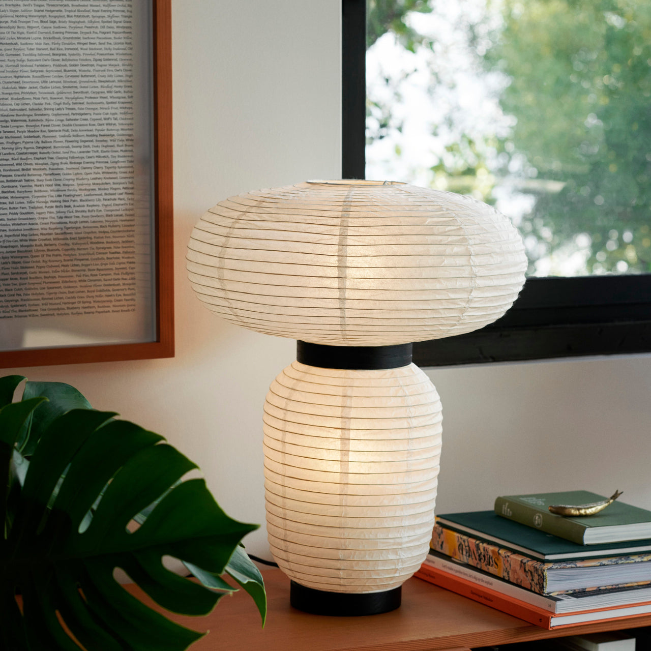 Formakami's rounded shapes are crafted in ivory white rice paper with black lacquered-ash accents and make for an impressive table lamp in Jaime Hayon's lighting series for &Tradition. By turns Asian-inspired and Scandinavian-influenced, the fusion of different aspects of those cultures evolves into a singular eye-catching design. The result is a glow of ambient light emanating from a slightly mysterious form that, even switched off, adds a notable visual interest to a room.
