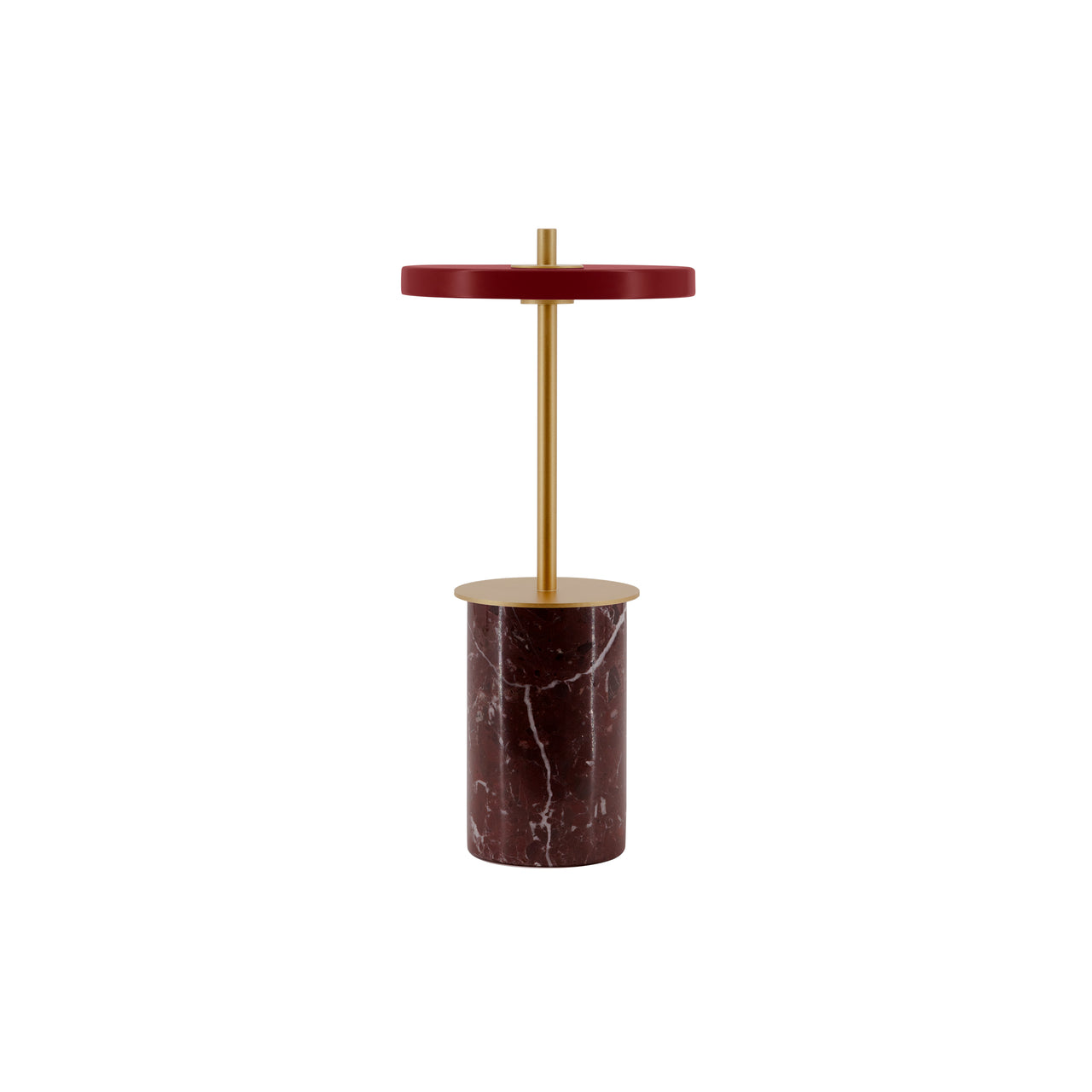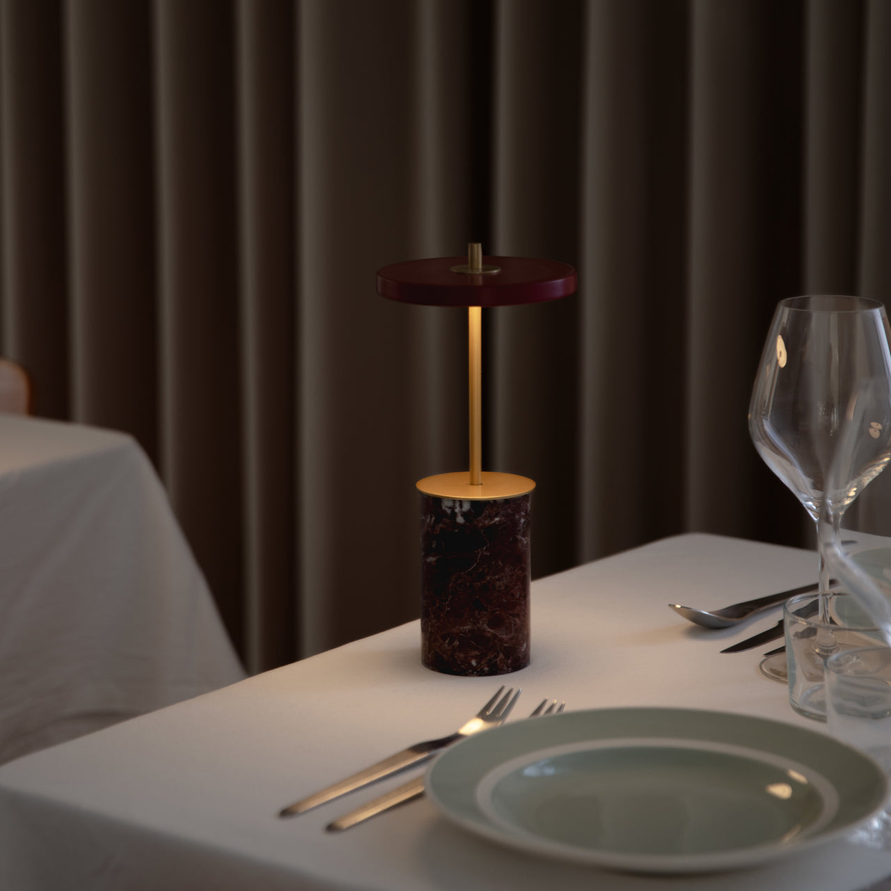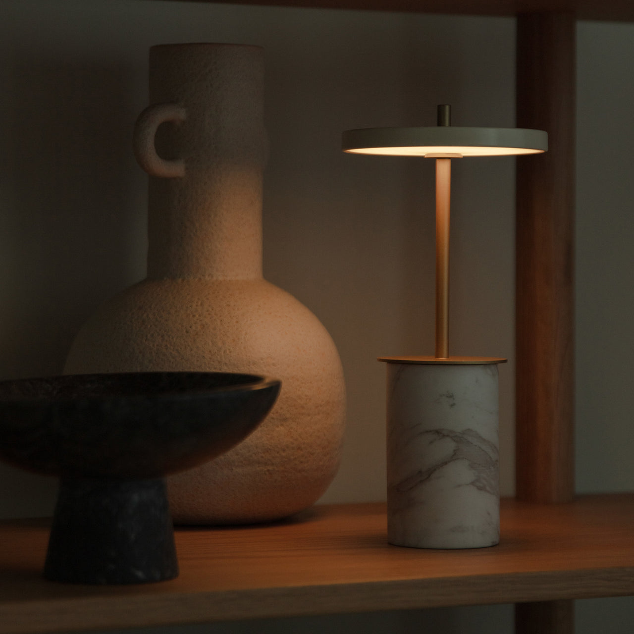The Asteria Move Mini is a compact, portable lamp crafted to provide ambient lighting for cozy settings. Its clean design pairs with an interchangeable solid marble base, introducing a touch of classic style. The lamp features four adjustable light levels, easily controlled with a simple touch on its base. Charging is effortless—just place the lamp on the included charging plate.