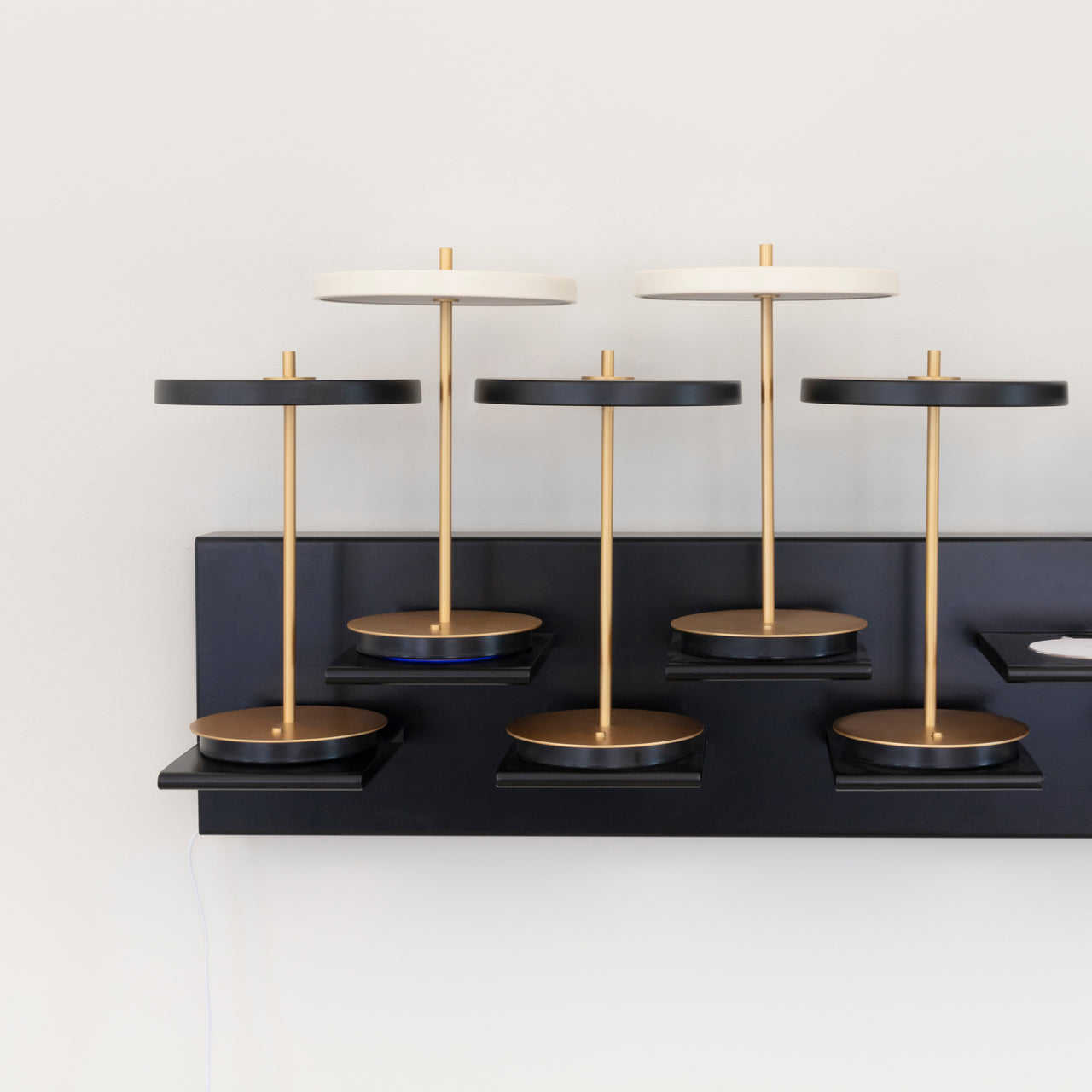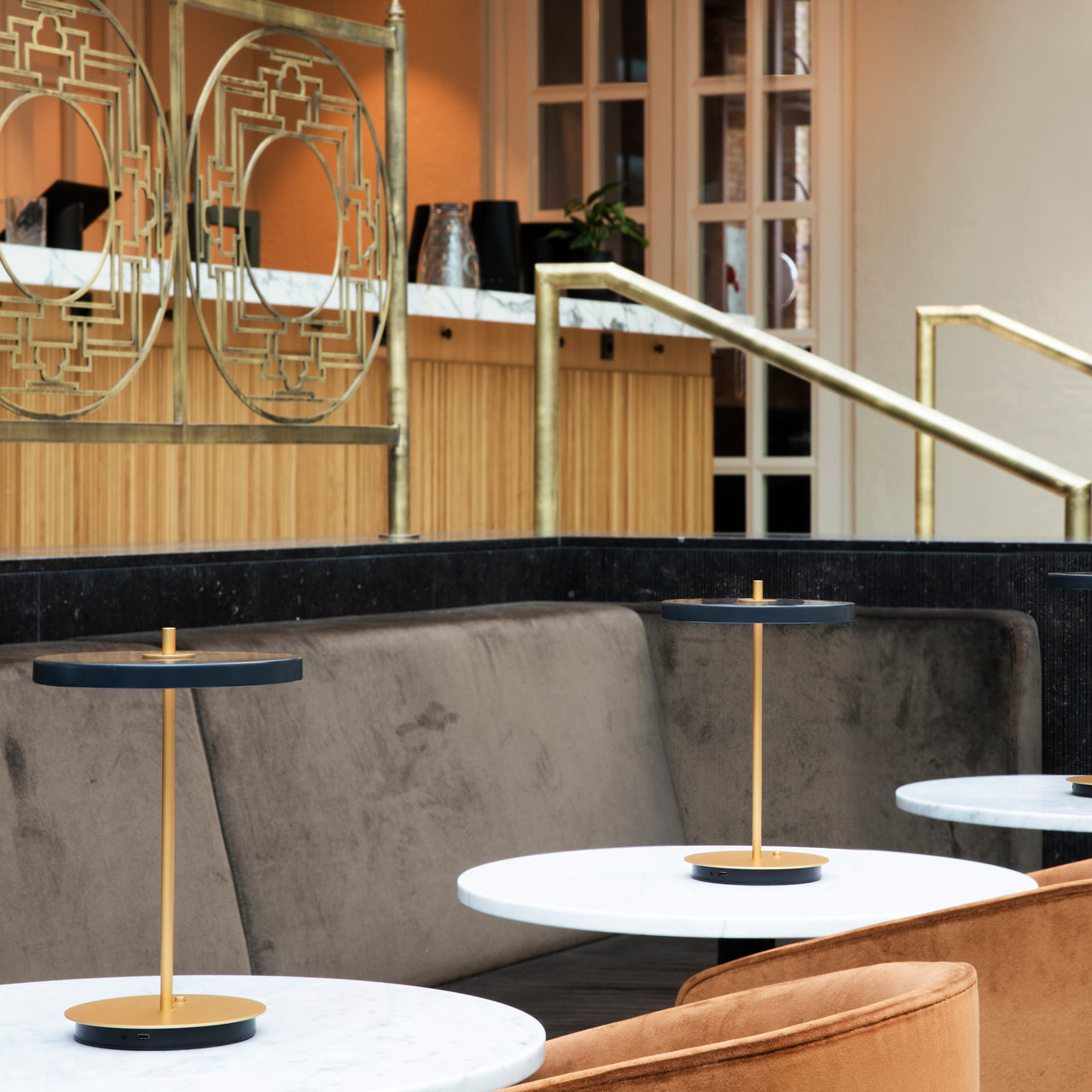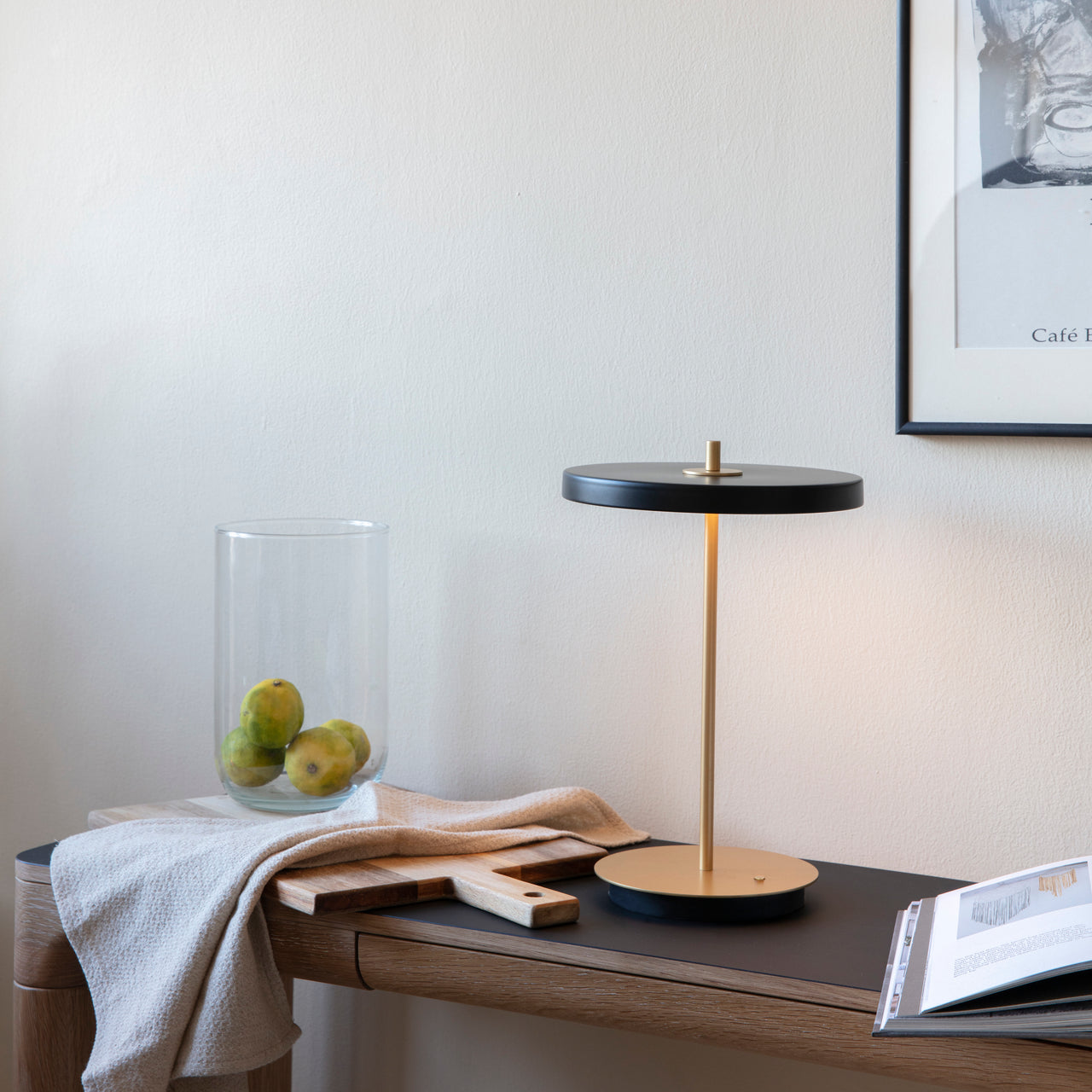The cordless Asteria Move Portable Lamp features a built-in custom LED light with a soft white diffuser, ensuring glare-free illumination. Crafted from aluminum with a brass stem, the lamp has four adjustable light intensity levels to suit various needs. Its battery lasts up to 35 hours and charges easily via any Qi charging unit or the included USB cable. Available in 11 colors, the Asteria Move's compact size and portability provide versatile lighting for any location.