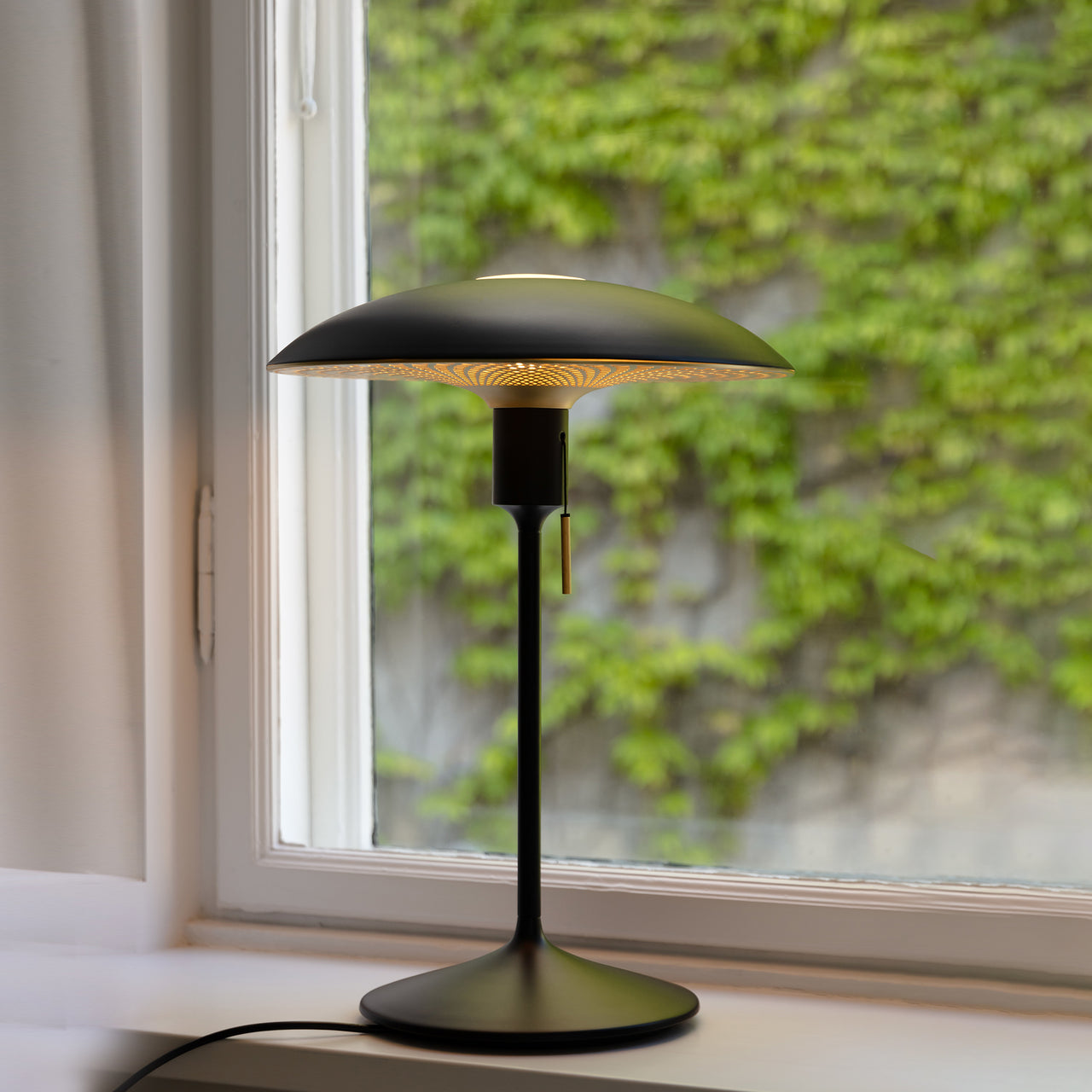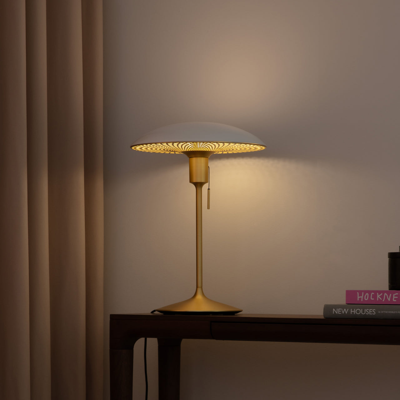 The Manta Ray Table Lamp showcases a sculptural powder-coated steel shade that directs light both downward and upward through its opal glass center. The curved metal screen reveals a detailed brass pattern underneath, producing a striking light effect. Designed by Anders Klem, this lamp is available in black and white finishes.
