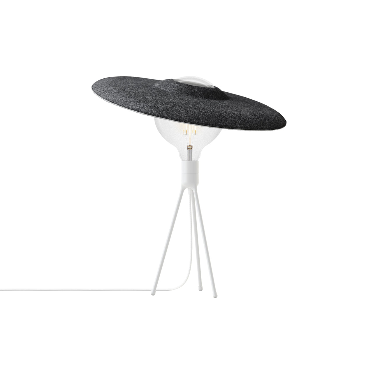 Designer Sřren Ravn Christensen tips the balance by pairing a tripod table base with Umages lamp with a tiltable felt topper. Shade's grey felt disc fits over the oversized LED light bulb and can be angled to aim the illumination in any direction while also shielding from unwanted glare. The classic 3-legged metal base makes a clean-lined accompaniment in matte black or white powder coat.
