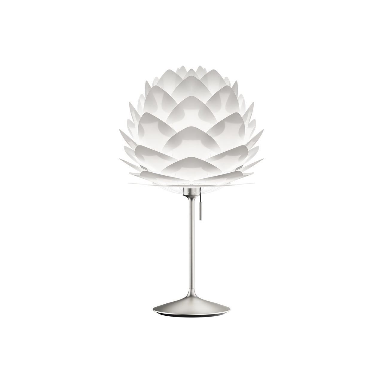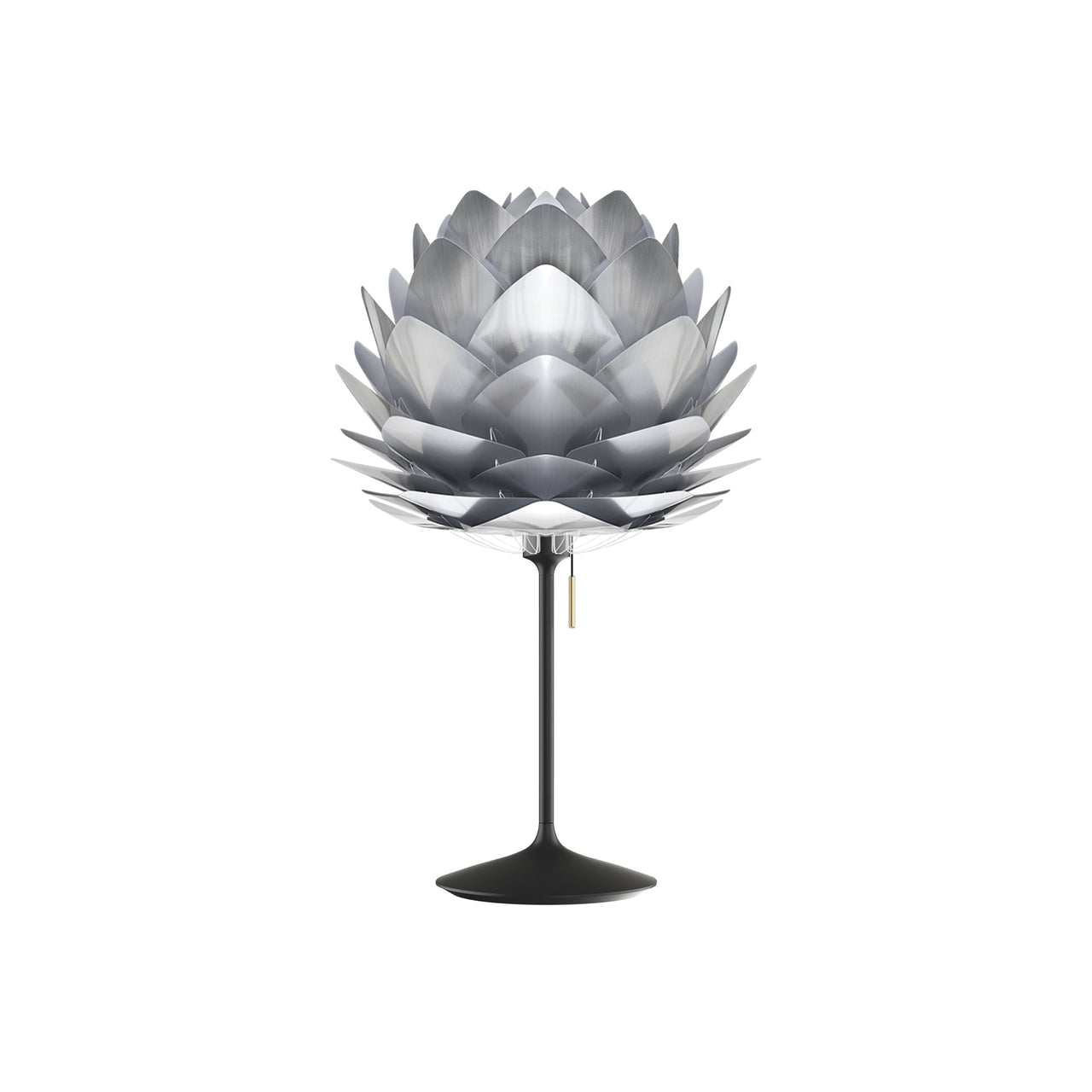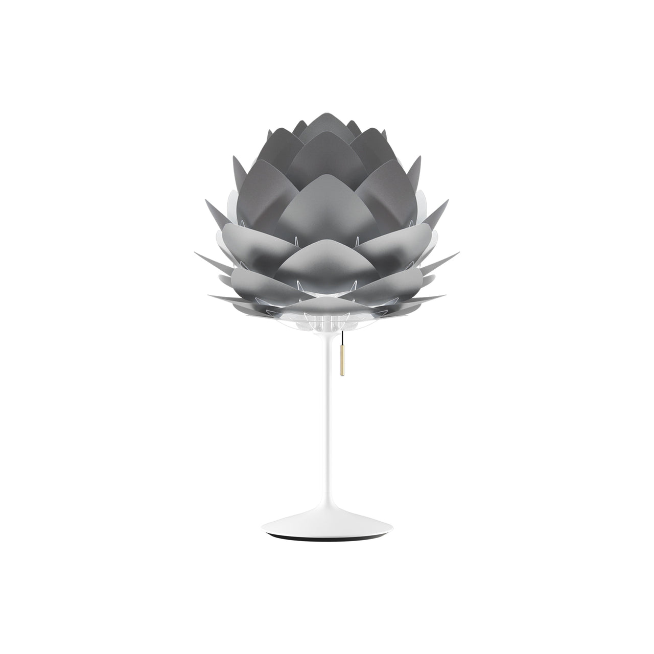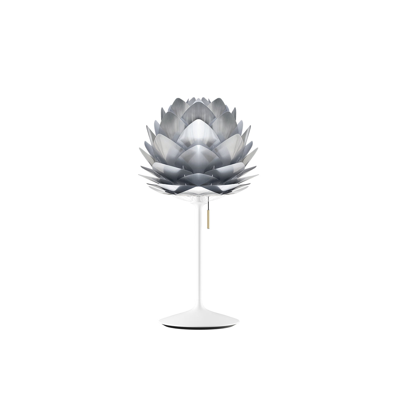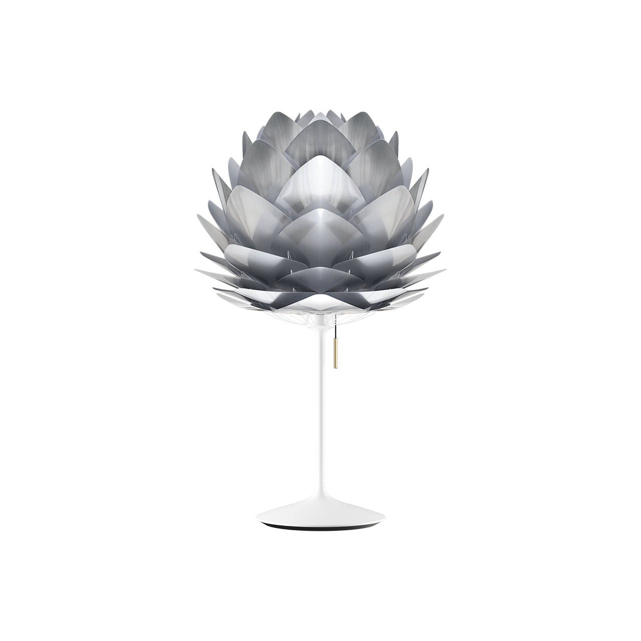 Perched on a slender metal base inspired by a champagne flute, Silvia makes a striking table lamp and offers the added convenience of USB charging for mobile devices even when the light is turned off. Designer Sřren Ravn Christensen's layered metal shade radiates warm, glare-free LED illumination via its unfolding layers, in a choice of rich metallics or crisp white or grey. Available in both the versatile medium size and a charming mini, the budding light complements base options in white, black, brushed steel or brushed brass