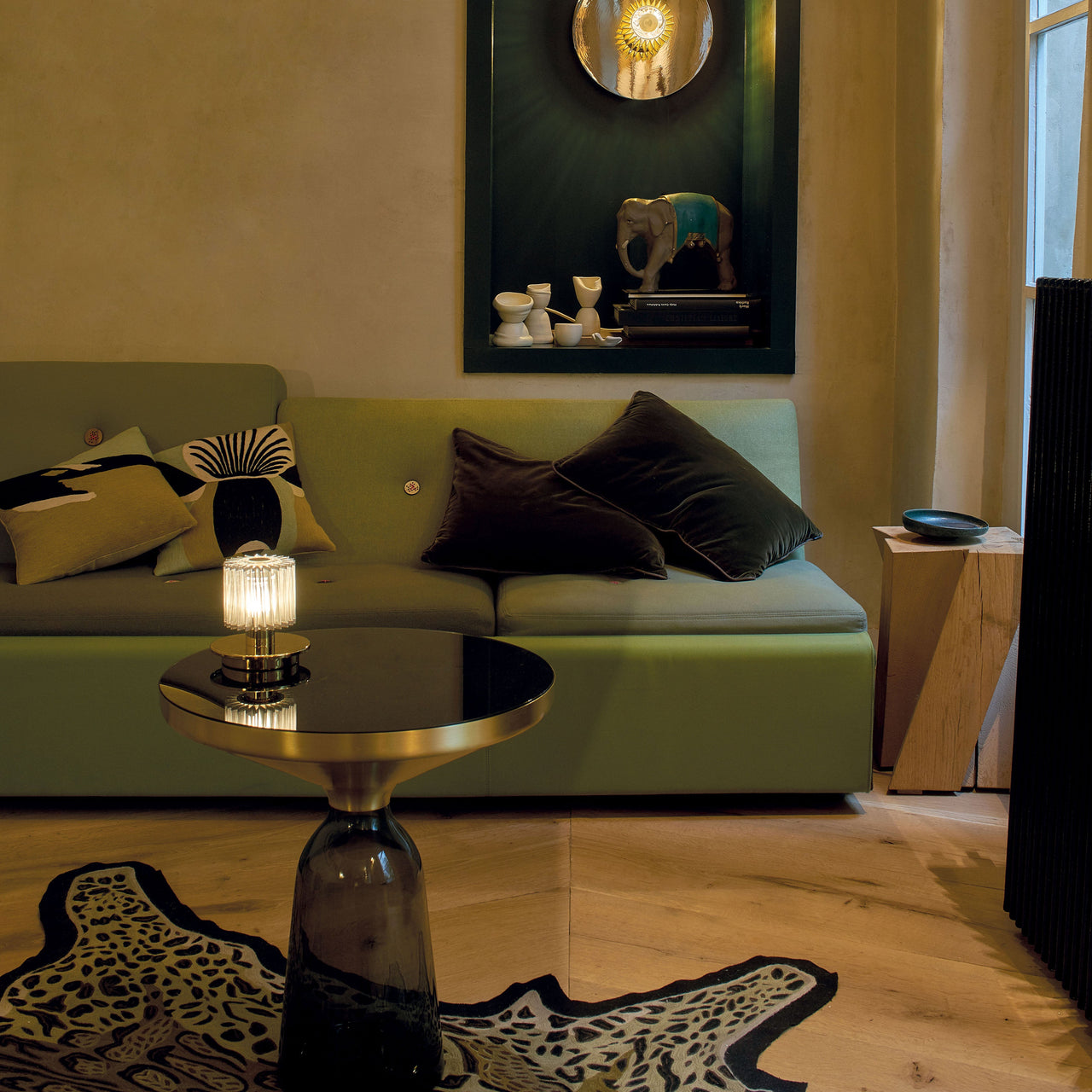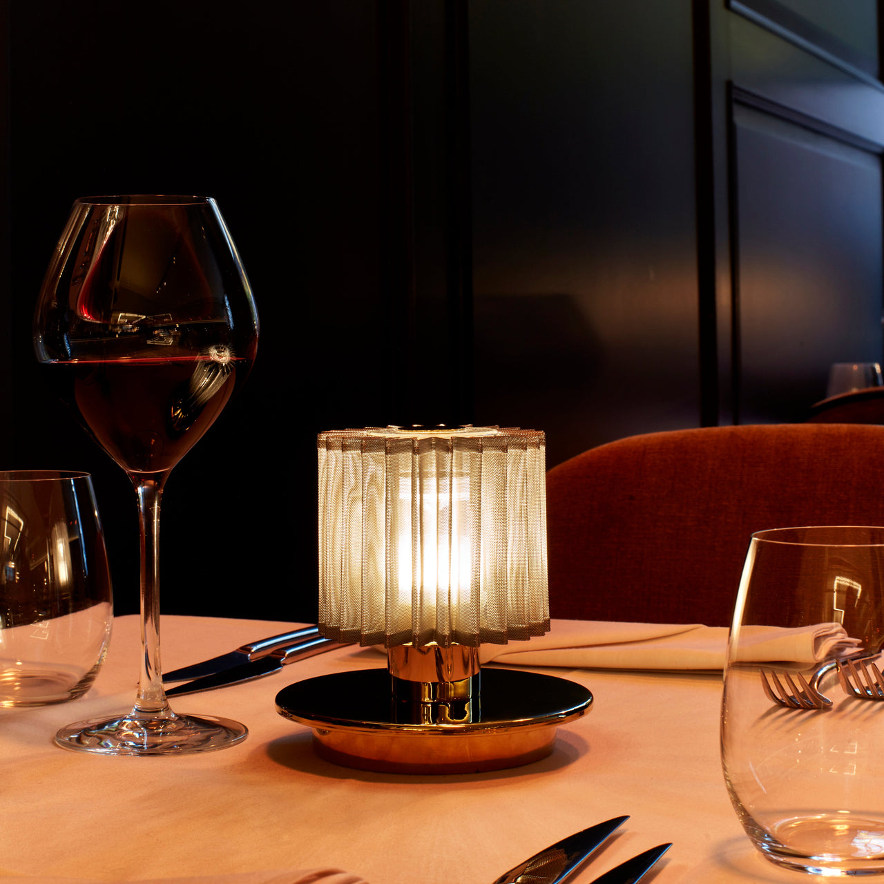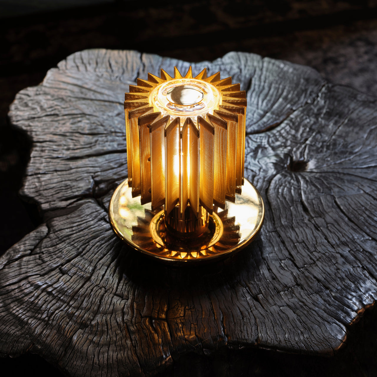 Cordless and portable, In The Sun's battery-operated table version features a 5-position switch for ascending levels of light. Architect-designers Dominique Perrault and Gaëlle Lauriot-Prévos upend the order of the series' characteristic elements, with the gleaming metal plate at the base and the diffuser with its integrated LED placed above. In gleaming metallic in homage to France's Louis XIV aka the Sun King, it's perfect on a low surface, a sideboard or even on the dining table. Easily recharged via the included Micro-USB-C cable for 9 to 17 hours of use depending on intensity.