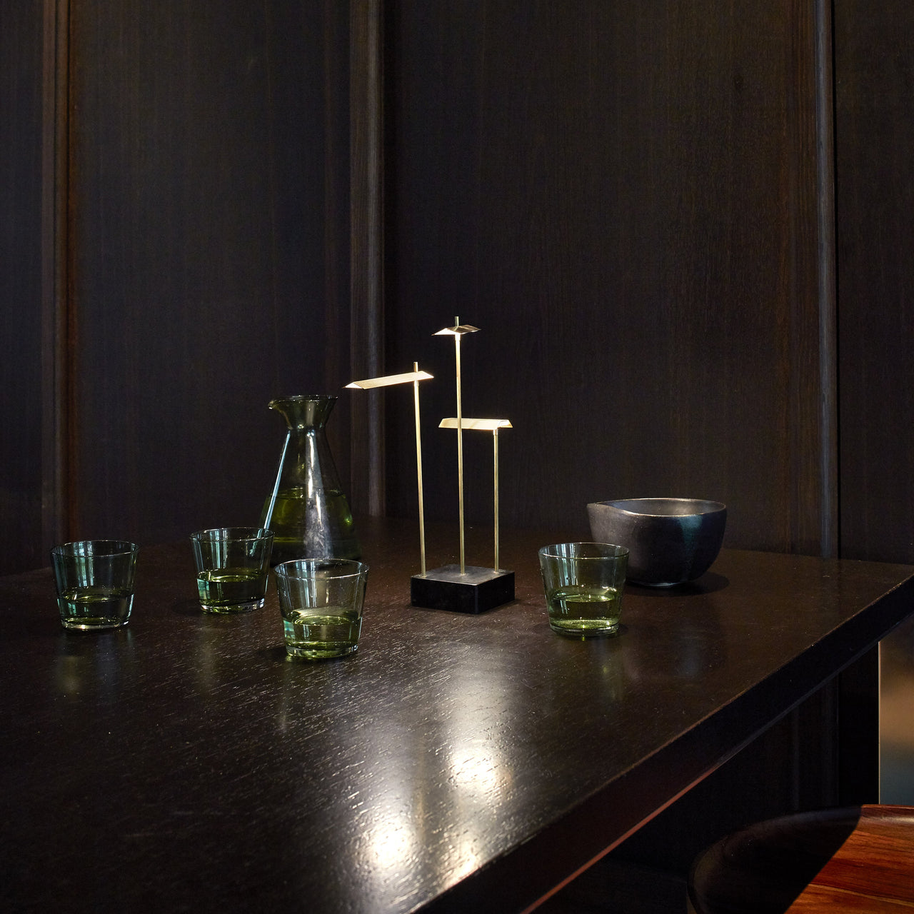 His mesmerizing table lamp takes an architectural form in his oft-preferred medium of solid brass wire, anchored with a black metal base. Lit by small LEDs, it spreads warm illumination anywhere since it’s also completely mobile and powered by a rechargeable battery.