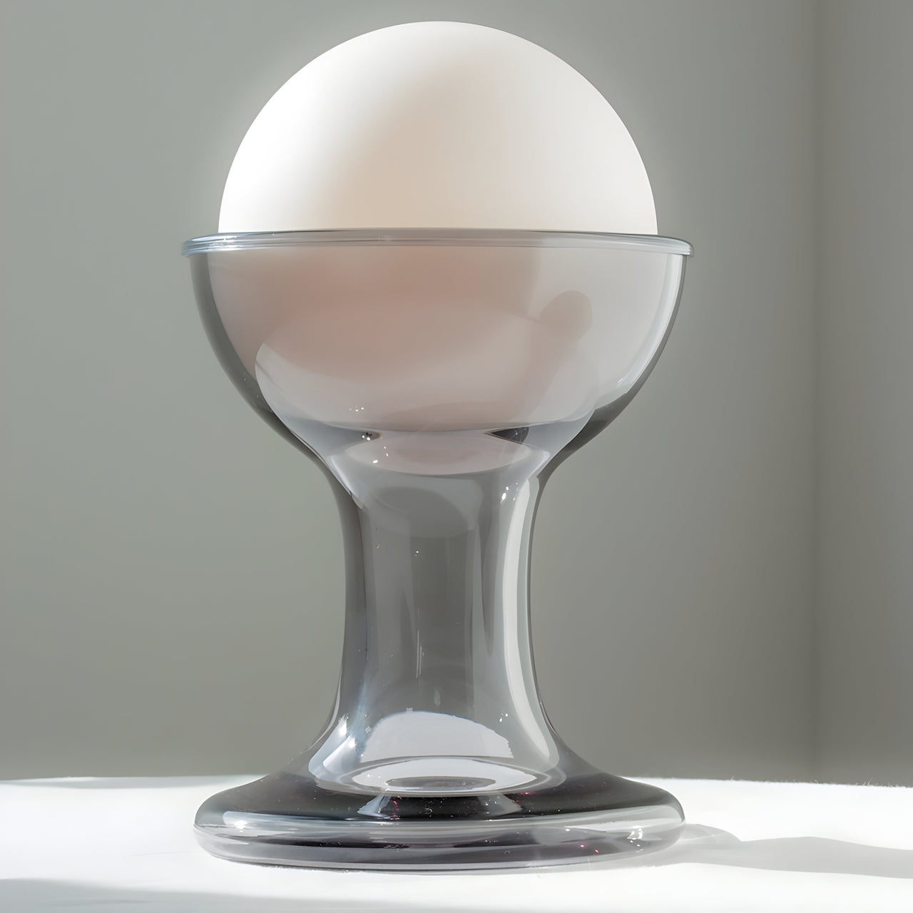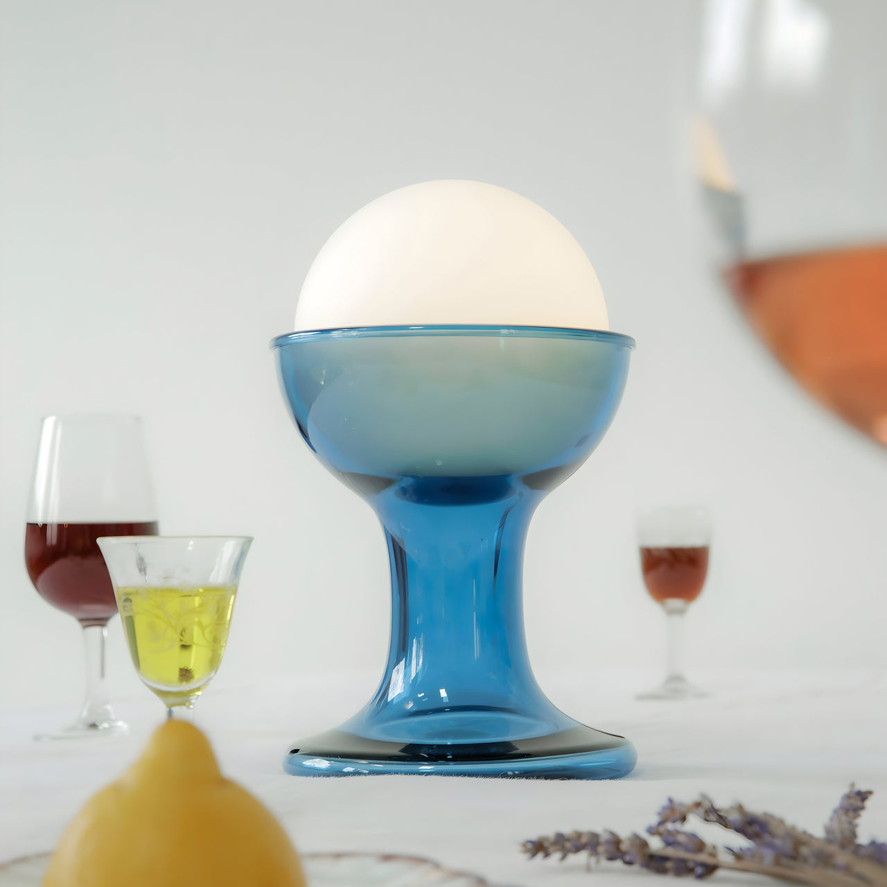 This portable lamp features a mouth-blown glass base supporting an opaline orb that emits a soft, ambient glow. The integrated LED bulb includes a three-step dimmer and is powered by a built-in battery, providing 8–10 hours of use per charge. Charging is managed through a magnetic USB-C cable that connects directly to the orb. Originally designed with influences from Space Age and Art Deco styles, the lamp has been updated for modern settings. It is available in Azure, Mint, Smoke, and Spritz finishes.