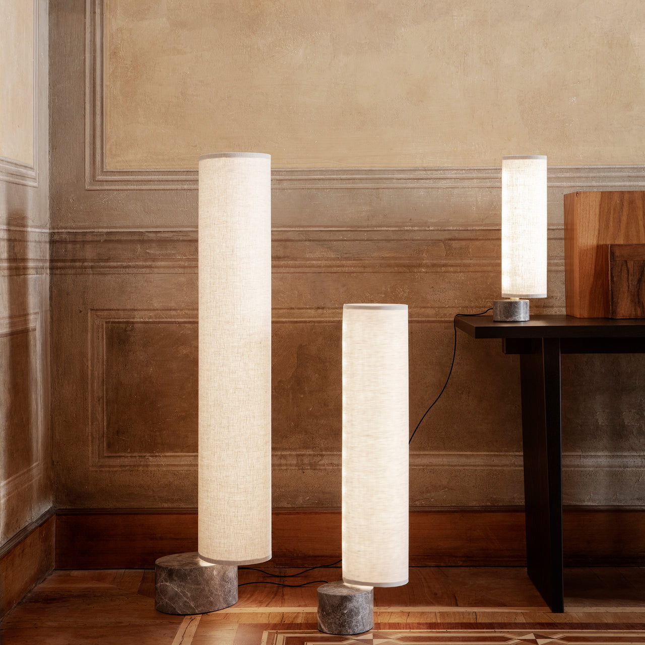 The smallest Unbound brings its warm LED glow to spaces as small as a console or bedside table but brings the same mesmerizing rotation as its taller siblings. Space Copenhagen pairs a luxe marble base with a vertical fabric shade, both in the same teardrop shape and then sets the lighted column in circular motion via a carefully engineered ball joint. Aligning completely only once every 360-degree turn, Unbound is as much a sculptural element in a room as a functional source of light.
