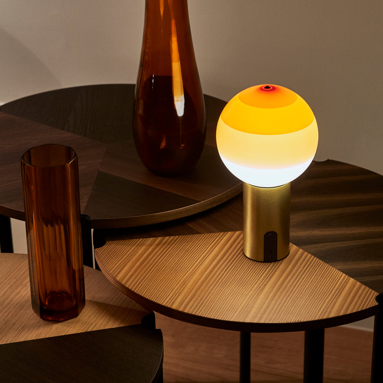 Barcelona designer Jordi Canudas takes his multihued Dipping Collection on the go with this portable version. Powered by a rechargeable battery concealed in the metal base—and available in brass or graphite—it also includes a 3-stop dimmer switch. The signature hand-blown glass sphere in glossy white is layered with hand-painted color gradations so each lamp is totally unique.