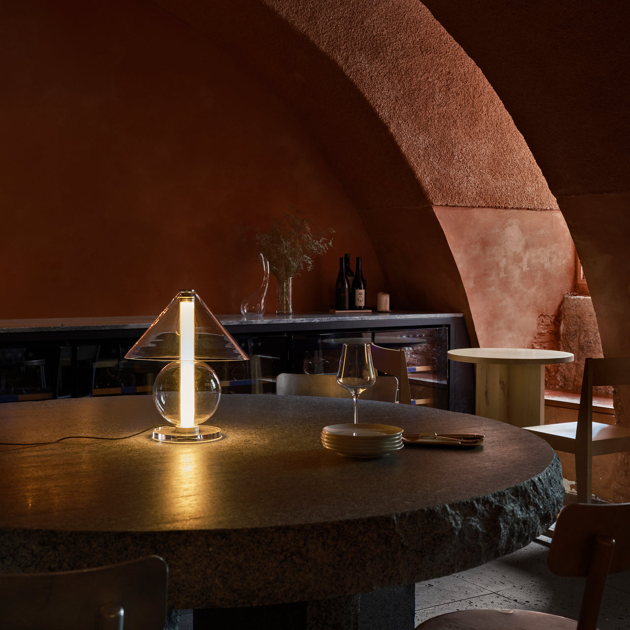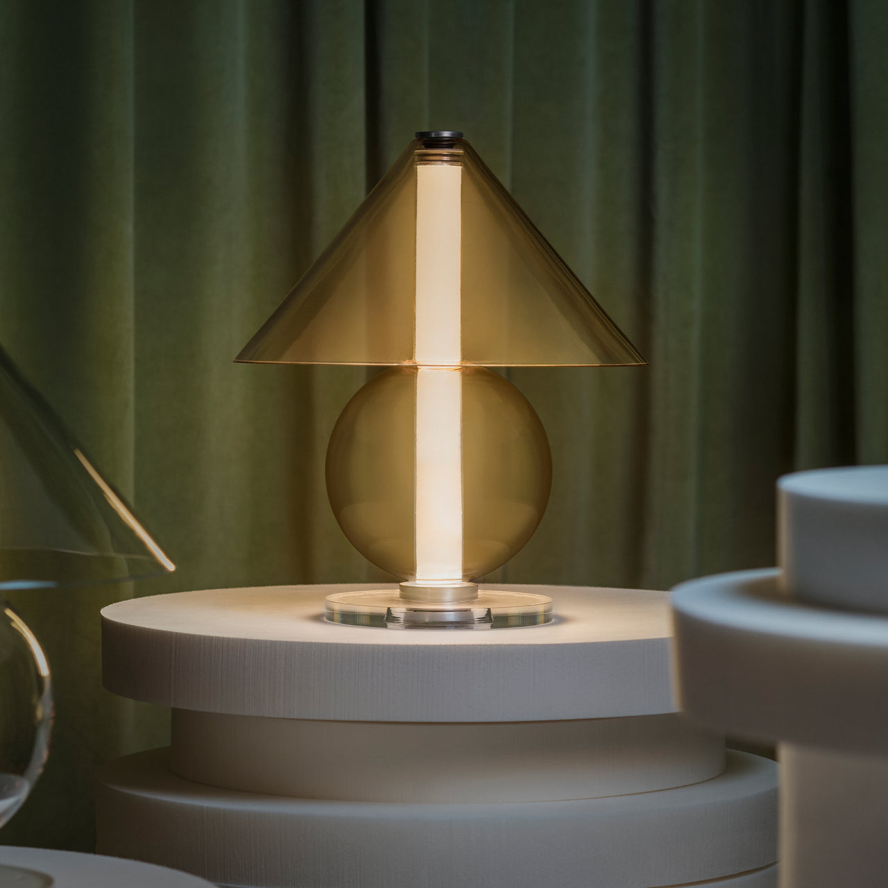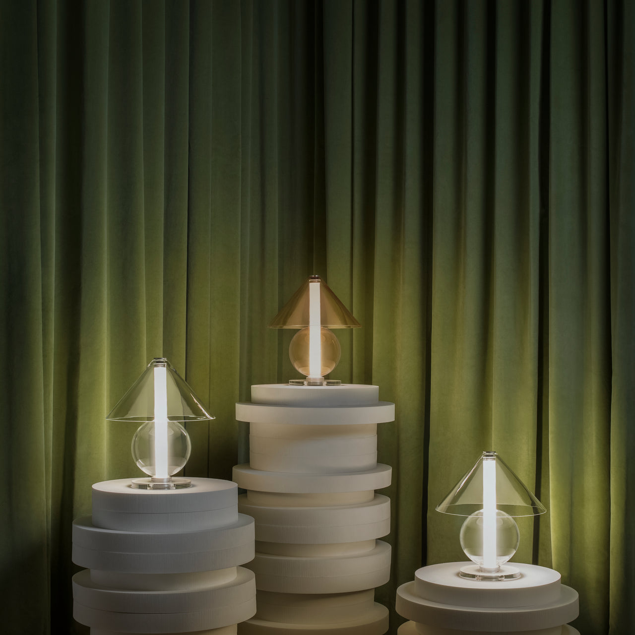 The Marset Fragile Table Lamp, designed by Jaume Ramírez, combines traditional and current design elements. It features a clear glass structure that highlights the light bulb, casting a soft, ambient light. This lamp blends geometric shapes—a cone, sphere, and cylinder—to create a minimalist yet impactful design that enhances any space. Its use of glass stresses simplicity and transparency, making it a subtle addition to various environments