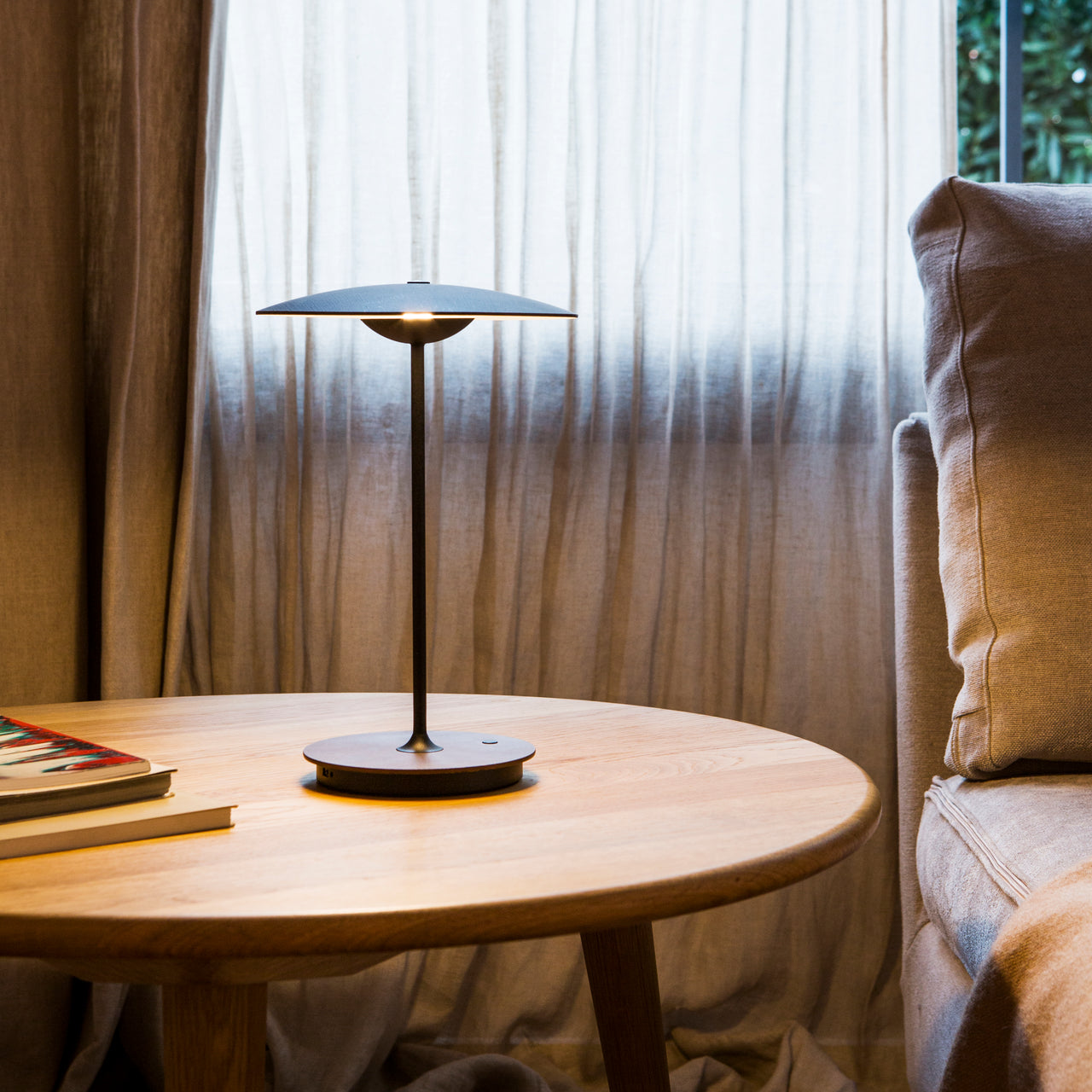 Thanks to a rechargeable lithium-ion battery, the portable table version of LED Ginger allows for cord-free, spur-of-the-moment lighting to go anywhere. Joan Gaspar's sleek signature lamp for Barcelona's Marset comes in a choice of its characteristic wenge or oak molded laminate or gleaming brass variations that suit a range of environs. With an integrated LED, the lamp features a 3-step dimmer that provides 5 to 20 hours of illumination on-the-go.