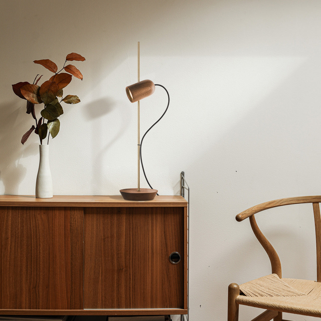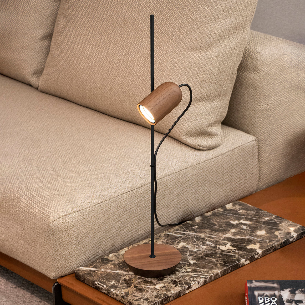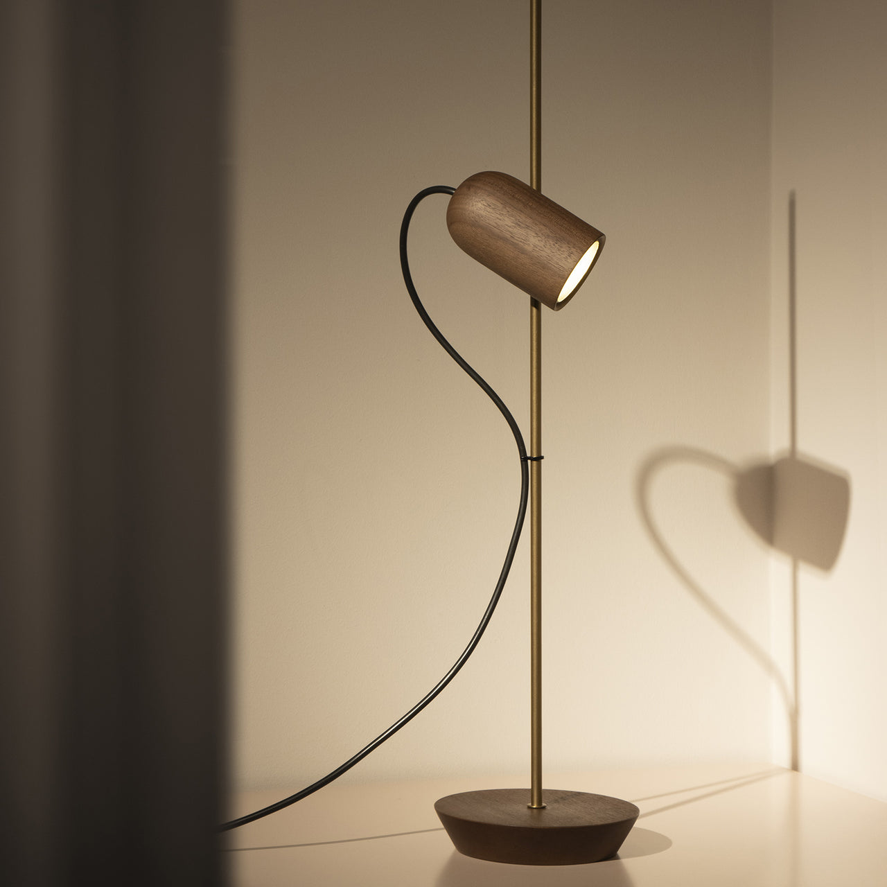 The Onfa Table Lamp combines a metal body in brass or graphite finish with a spotlight and base crafted from walnut, oak, or black ash wood, highlighting the light's natural warmth. An innovative magnetic mechanism allows easy adjustment of the light's direction.