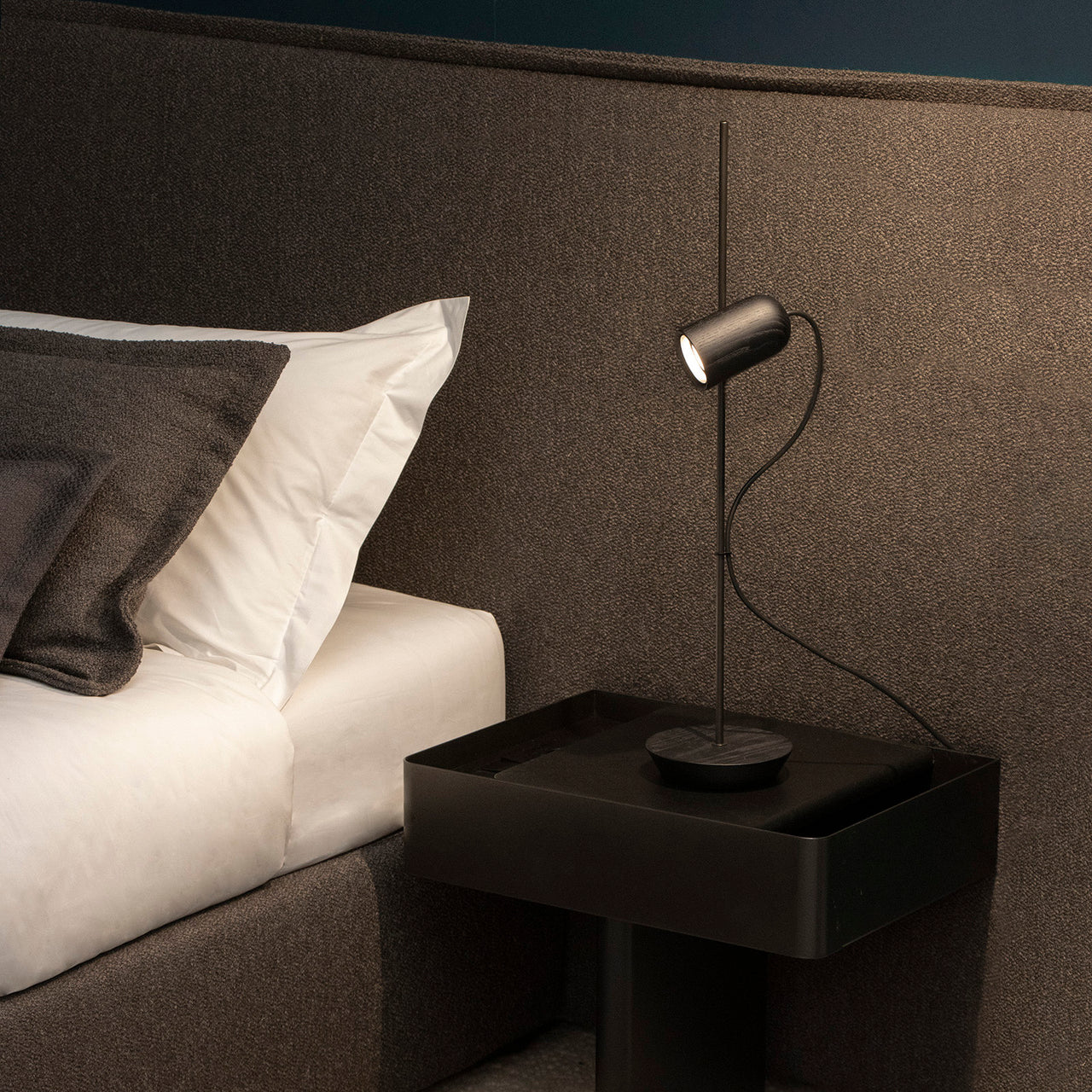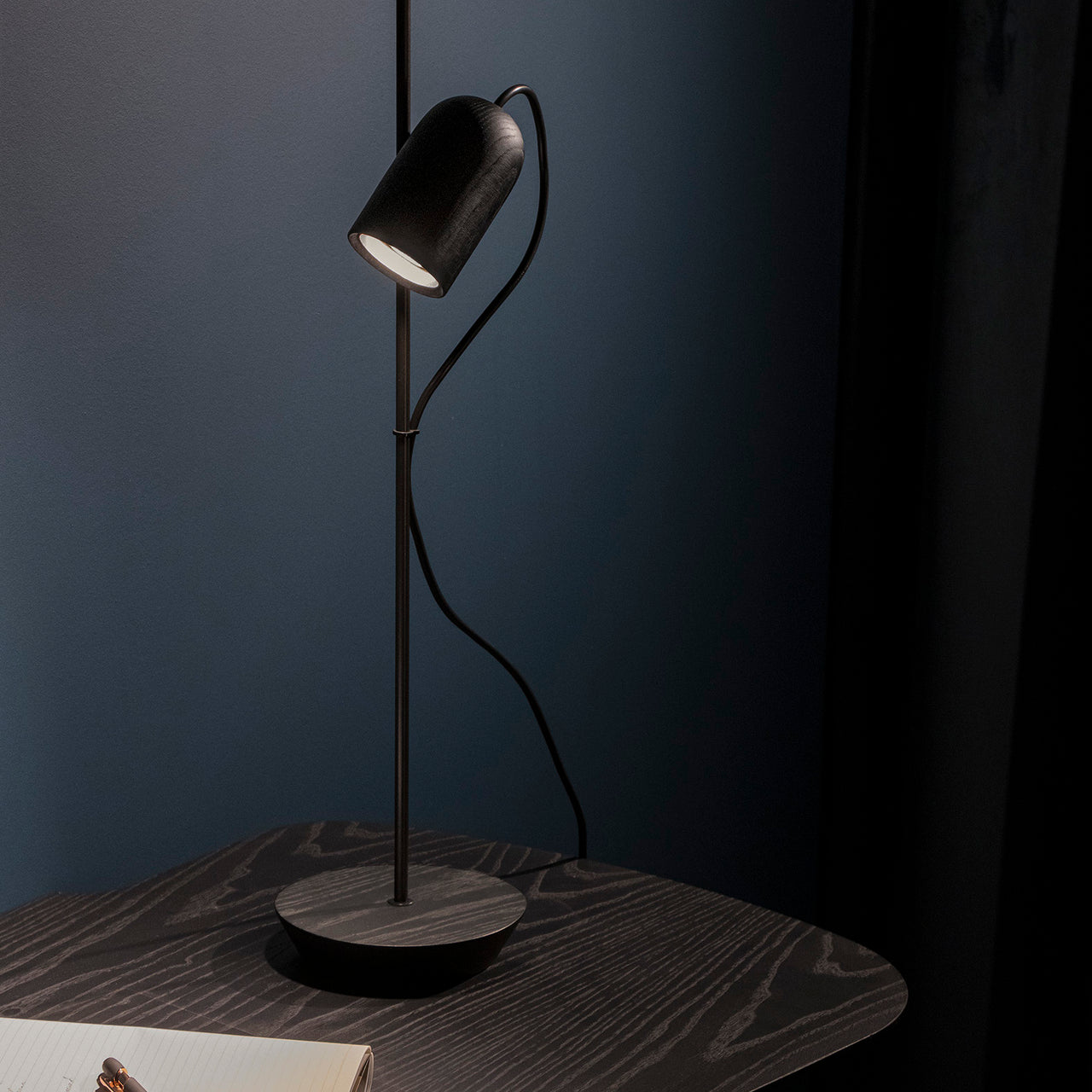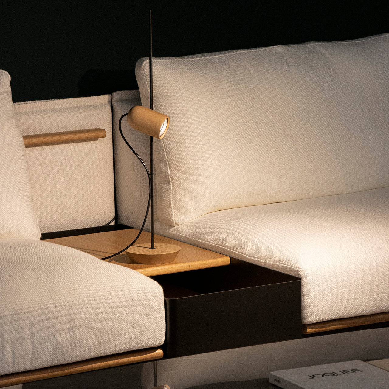 The Onfa Table Lamp combines a metal body in brass or graphite finish with a spotlight and base crafted from walnut, oak, or black ash wood, highlighting the light's natural warmth. An innovative magnetic mechanism allows easy adjustment of the light's direction.