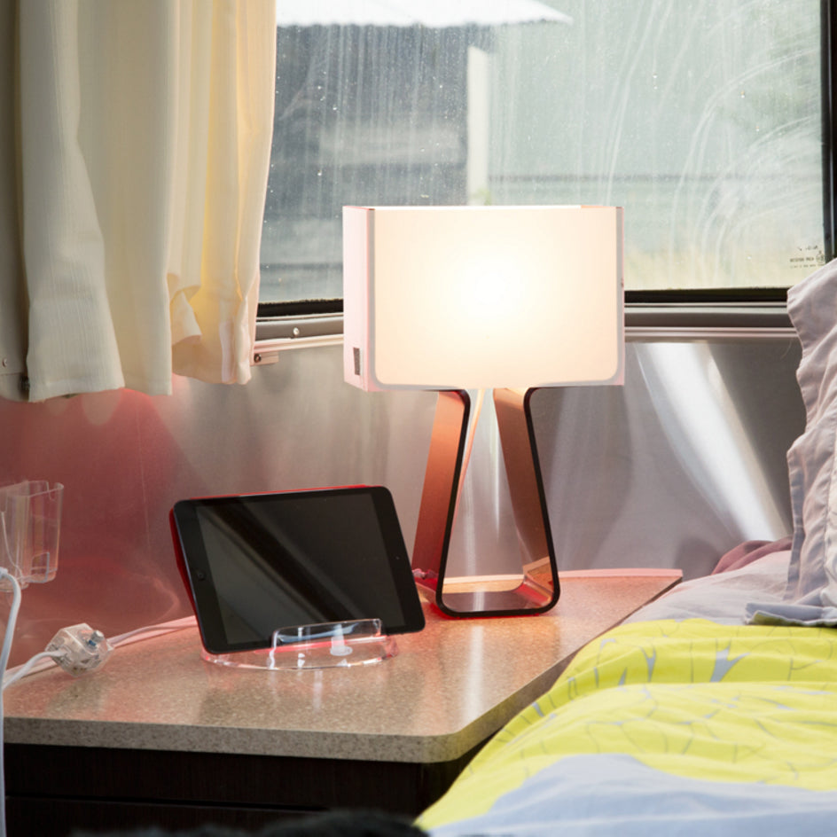 Familiarity breeds inspiration. With his Tube Top Collection for San Francisco-based Pablo, designer Peter Stathis noodles around with the customary shape of a household classic. The table lamp's linear, transparent acrylic base extends to become the framework for this table lamp. Within the clear stand, the striking stretched-mesh squared-off shade appears to float freely, gently tethered by a fabric cord. In the colored acrylic, this minimalist twist takes on a pop spin.