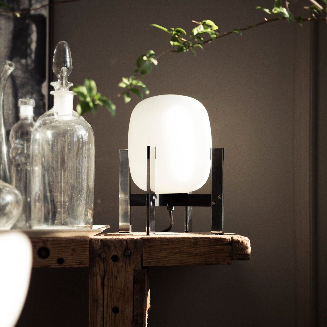 Cesta Metálica is a sleekly updated version of designer Miguel Milá's globe table lamp cradled in a footed stand. In this rendition, the base is fashioned in gleaming stainless steel, available with or without the natural color leather handle. The opal glass lantern is hand-produced by European craftsmen, using traditional mouth-blowing techniques, and brings a diffused glow of dimmable LED illumination in Santa & Cole's eye-catching take on a modernist classic.