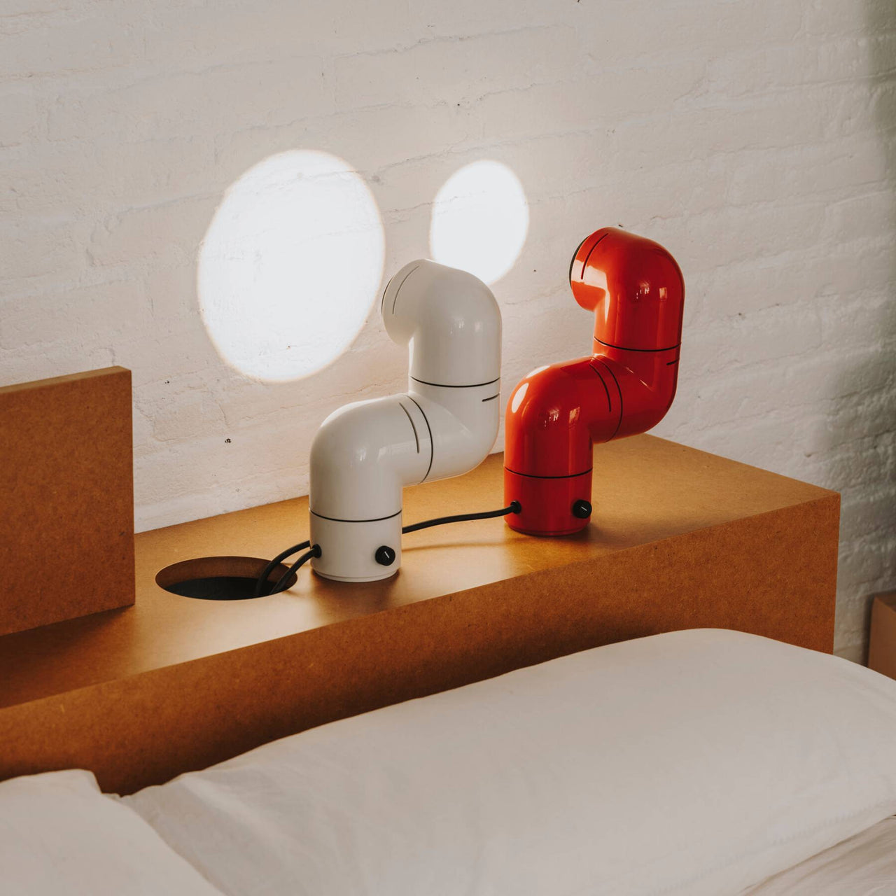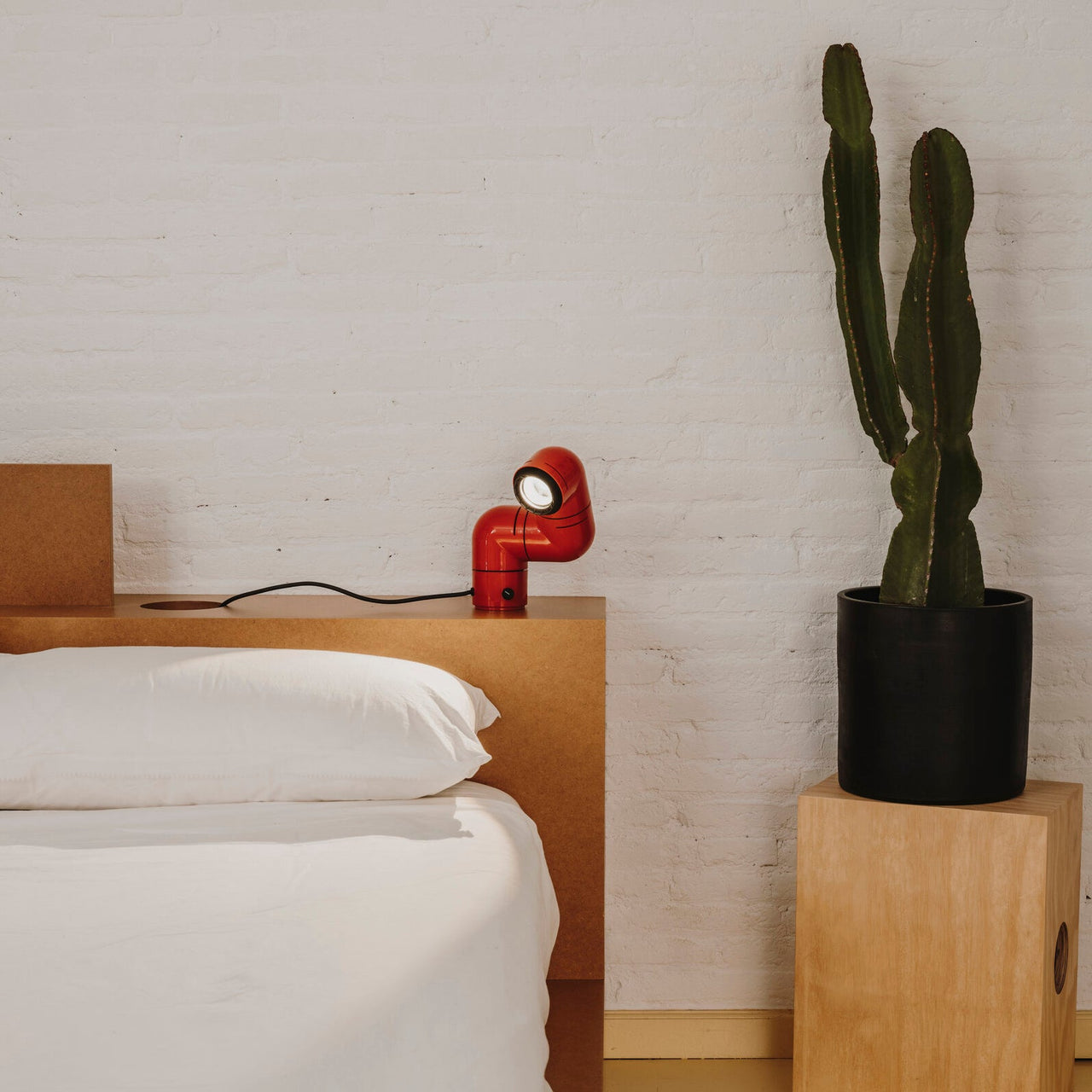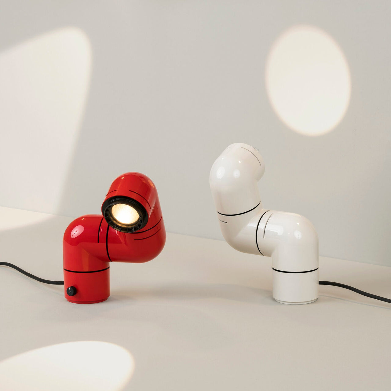 A beloved artifact of Spanish '70s pop culture, Tatu's table version gets a timely update with today's LED technology. Both the light intensity and focal aperture are easily adjustable in André Ricard's now-familiar curling design inspired by its namesake armadillo and the 3 rotatable sections aim the light wherever it is desired. With a built-in dimmable light source, it comes in high-gloss red or white ABS plastic to add a little decorative punch in the bargain.