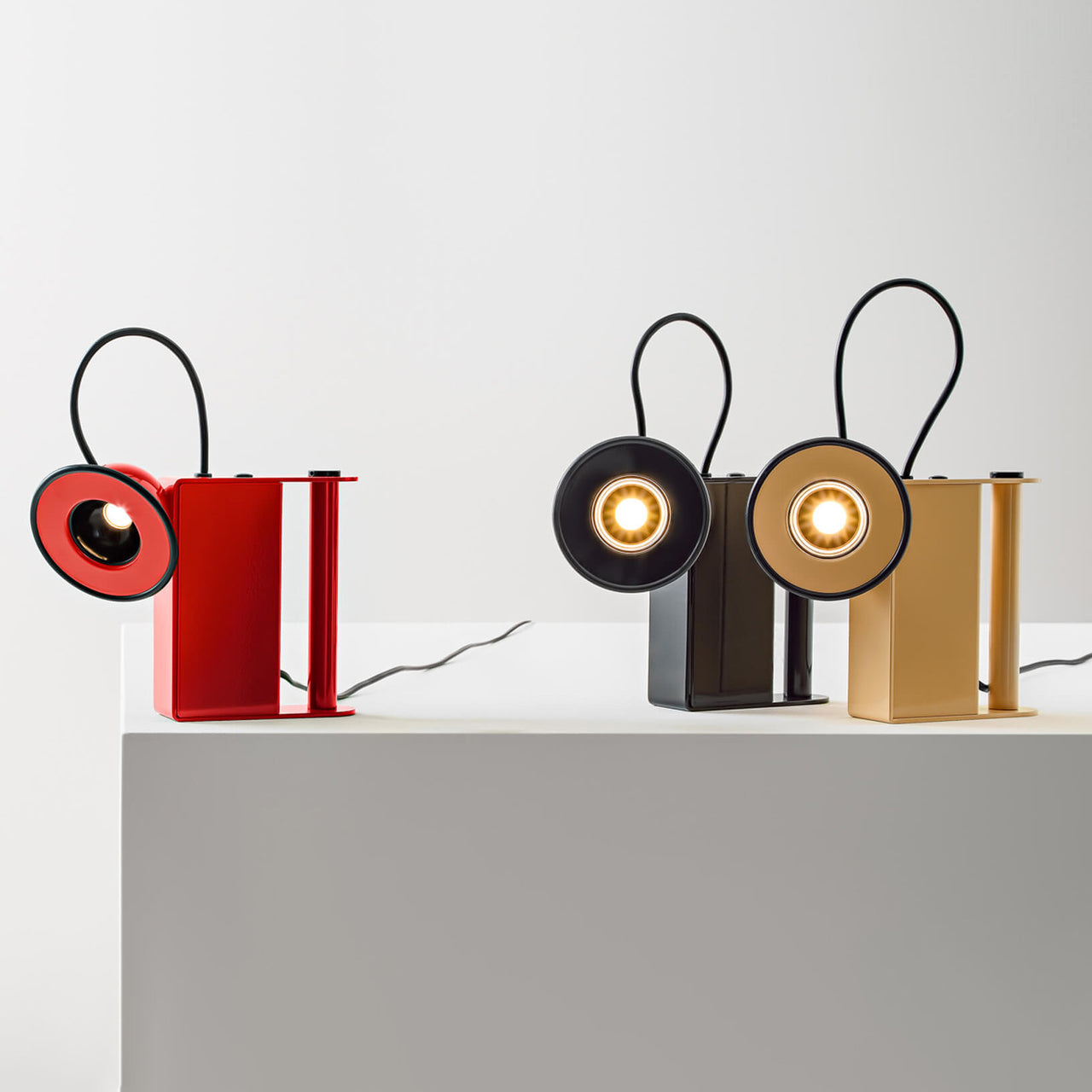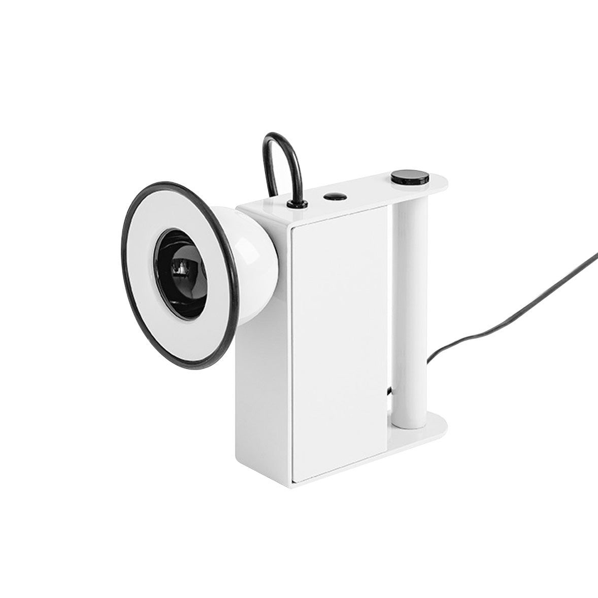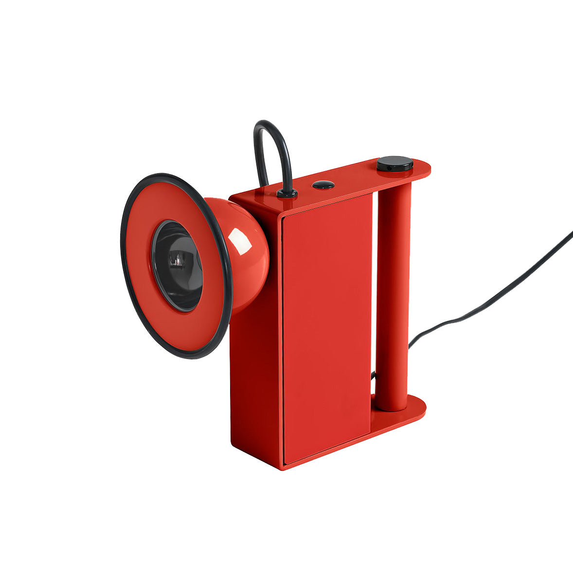 The Minibox Table Lamp by Stilnovo, designed by Gae Aulenti and Piero Castiglioni in 1981, features a metal body, a convenient handle, and a unique luminous head reminiscent of a miner's lamp. Its directable head is magnetically attached, allowing versatile lighting. Available in finishes glossy white, black, coffee, green, and red, it comes with a 10W powerLED light source that emits a warm 3000K glow.