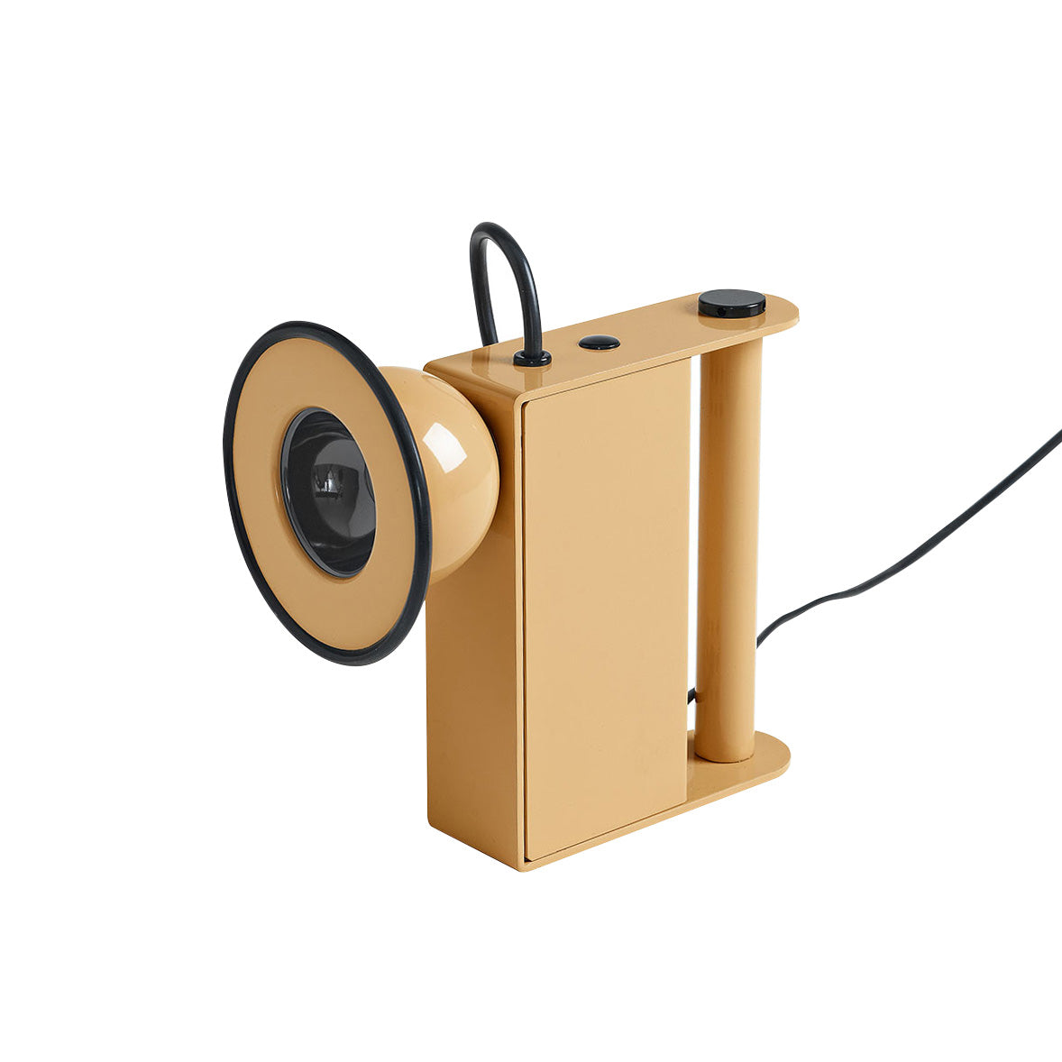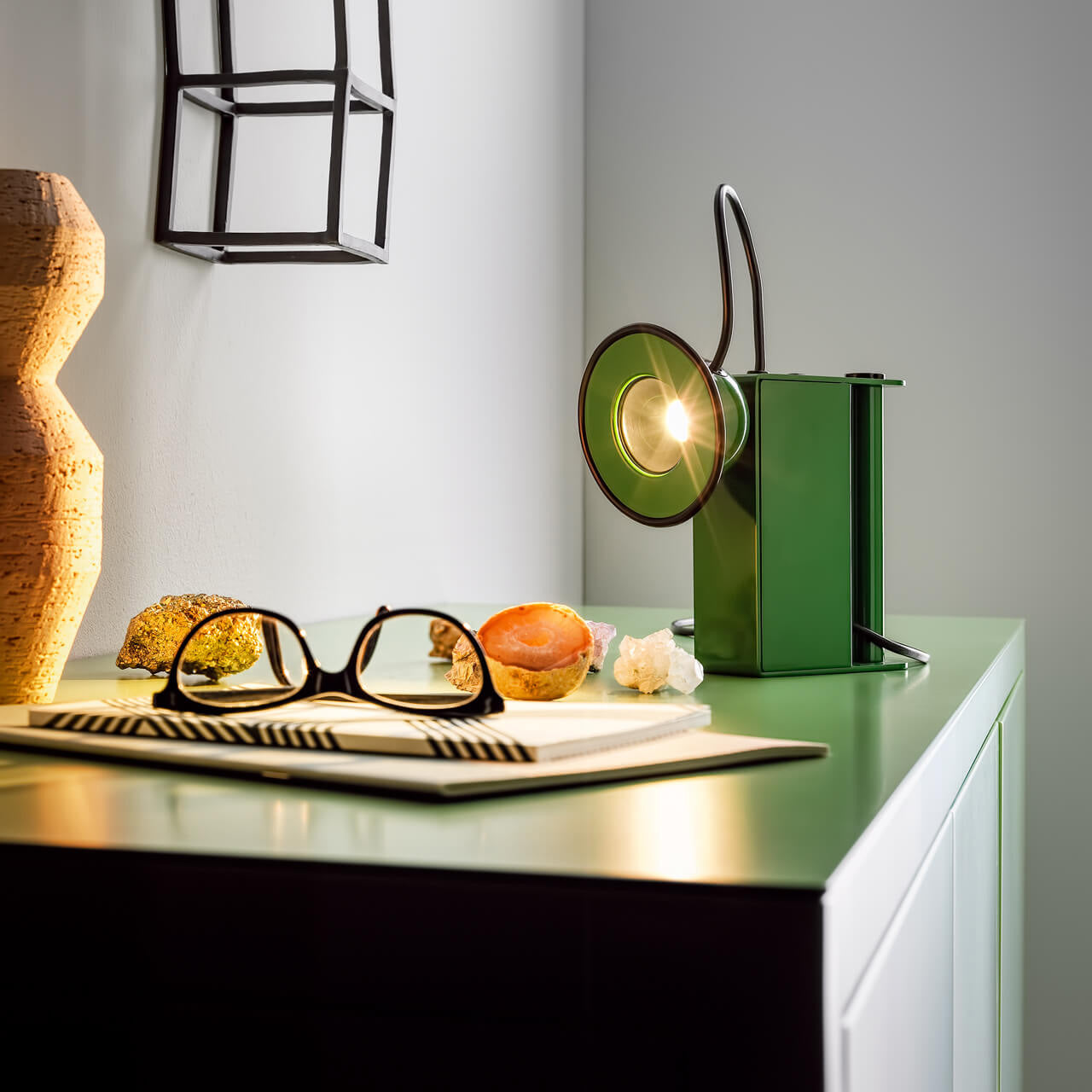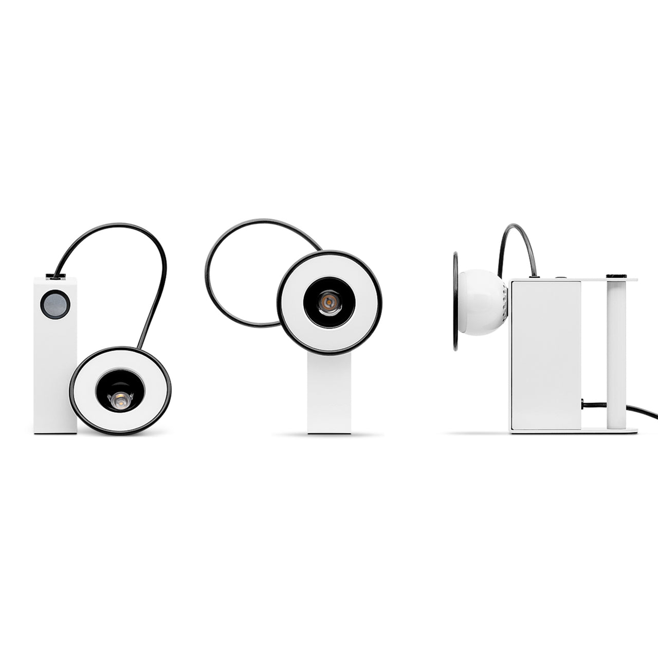 The Minibox Table Lamp by Stilnovo, designed by Gae Aulenti and Piero Castiglioni in 1981, features a metal body, a convenient handle, and a unique luminous head reminiscent of a miner's lamp. Its directable head is magnetically attached, allowing versatile lighting. Available in finishes glossy white, black, coffee, green, and red, it comes with a 10W powerLED light source that emits a warm 3000K glow.