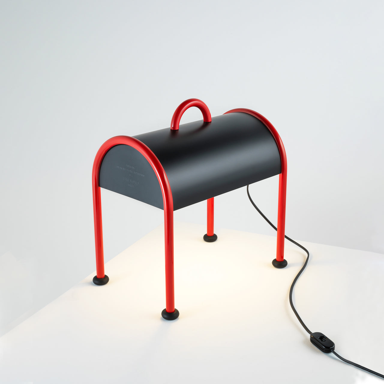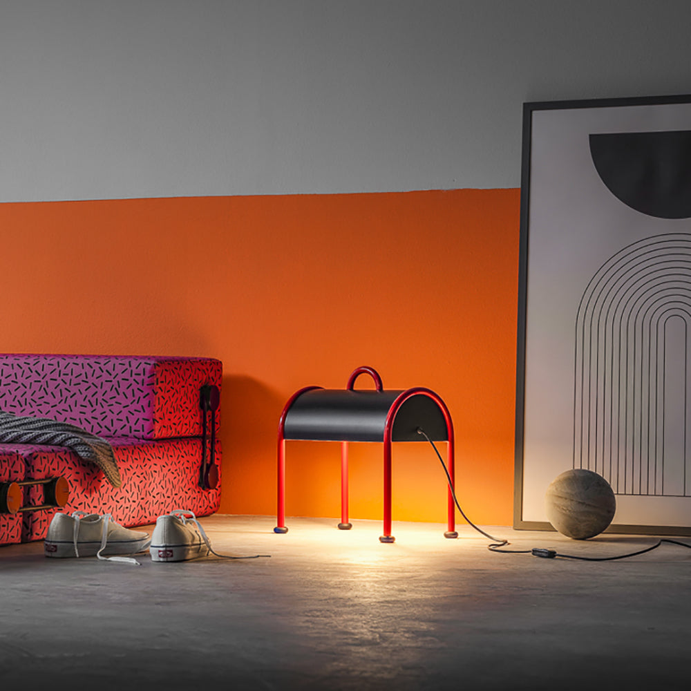 Ettore Sottsass’ 1977 Valigia anticipates the unfettered style of the famed design and architecture collective known as the Memphis Group that he led in the 1980s. To place on a table or the floor, the lamp has distinctive dual arches and a handle in glossy red-painted metal and a vaulted metal shade—matte black on the outside and white on the inside to gently reflect the light from the LED bulb.