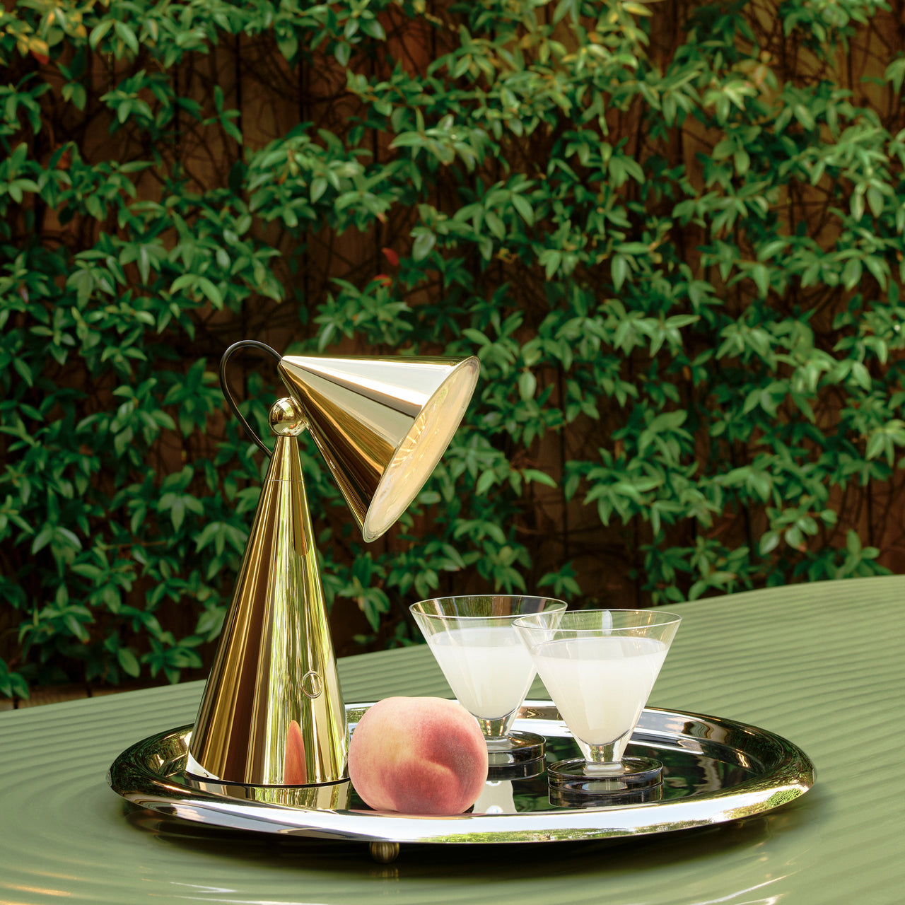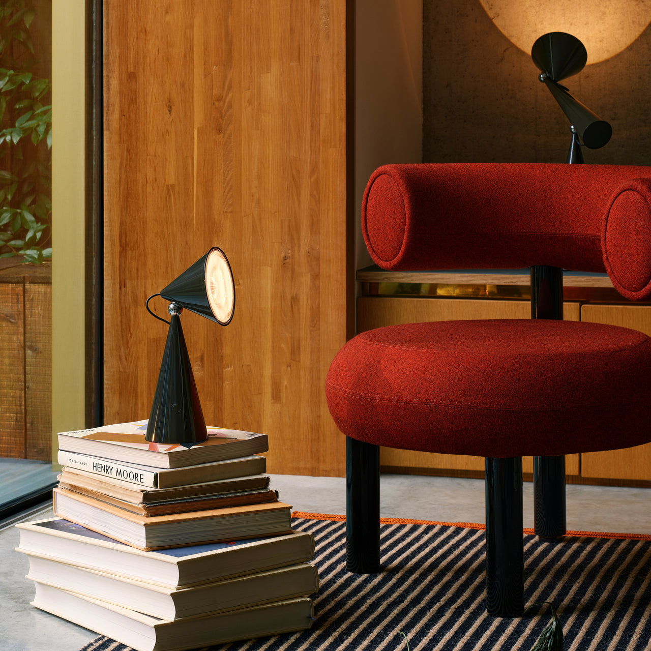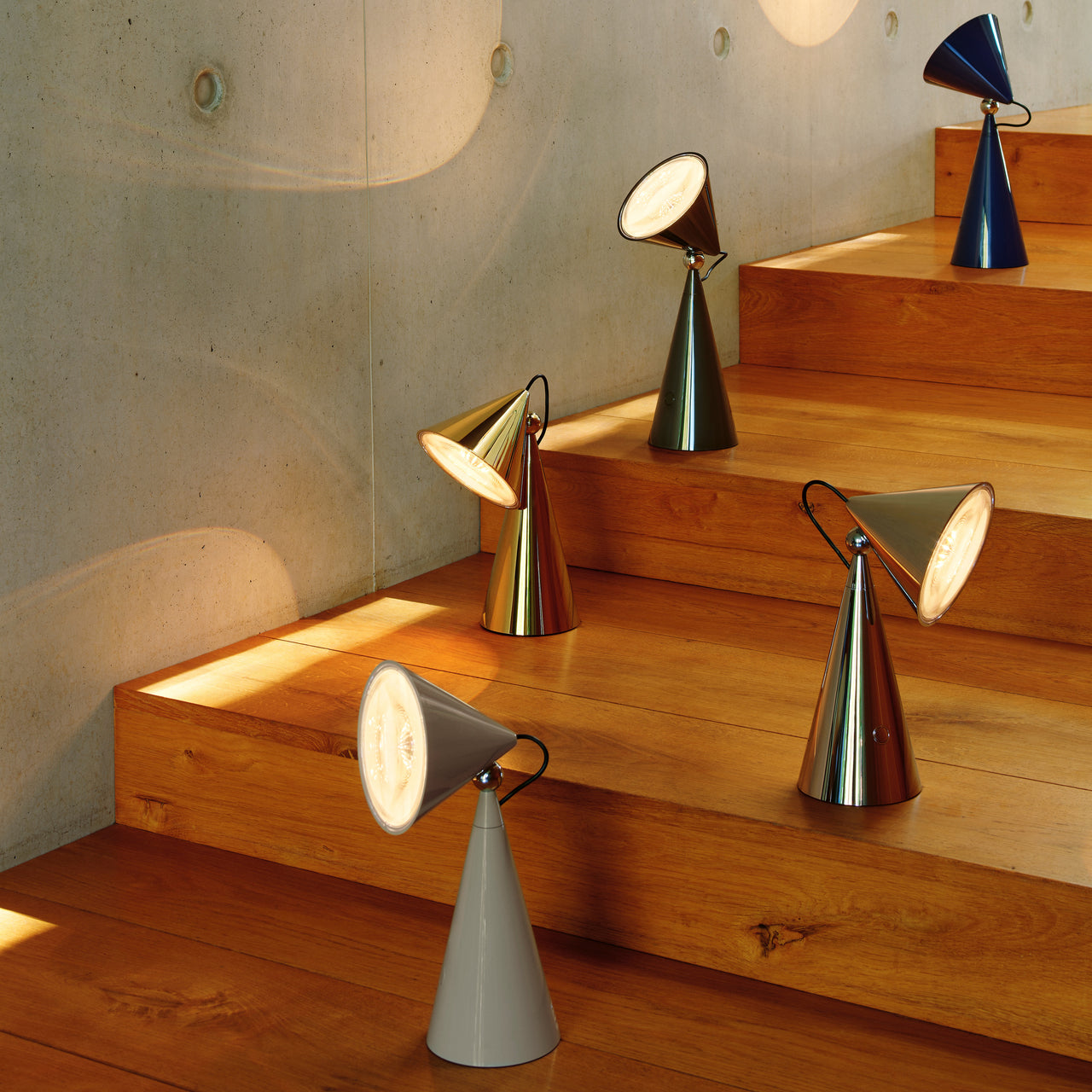 The Pose Portable Lamp features a Fresnel lens, inspired by lighthouse technology, to emit a sharp, precise beam. This compact, rechargeable lamp offers two warm light settings, adjustable via a touch-sensitive button, and charges through a magnetic USB cable. Available in Gold, Silver, Indigo, Putty, and Kelp.