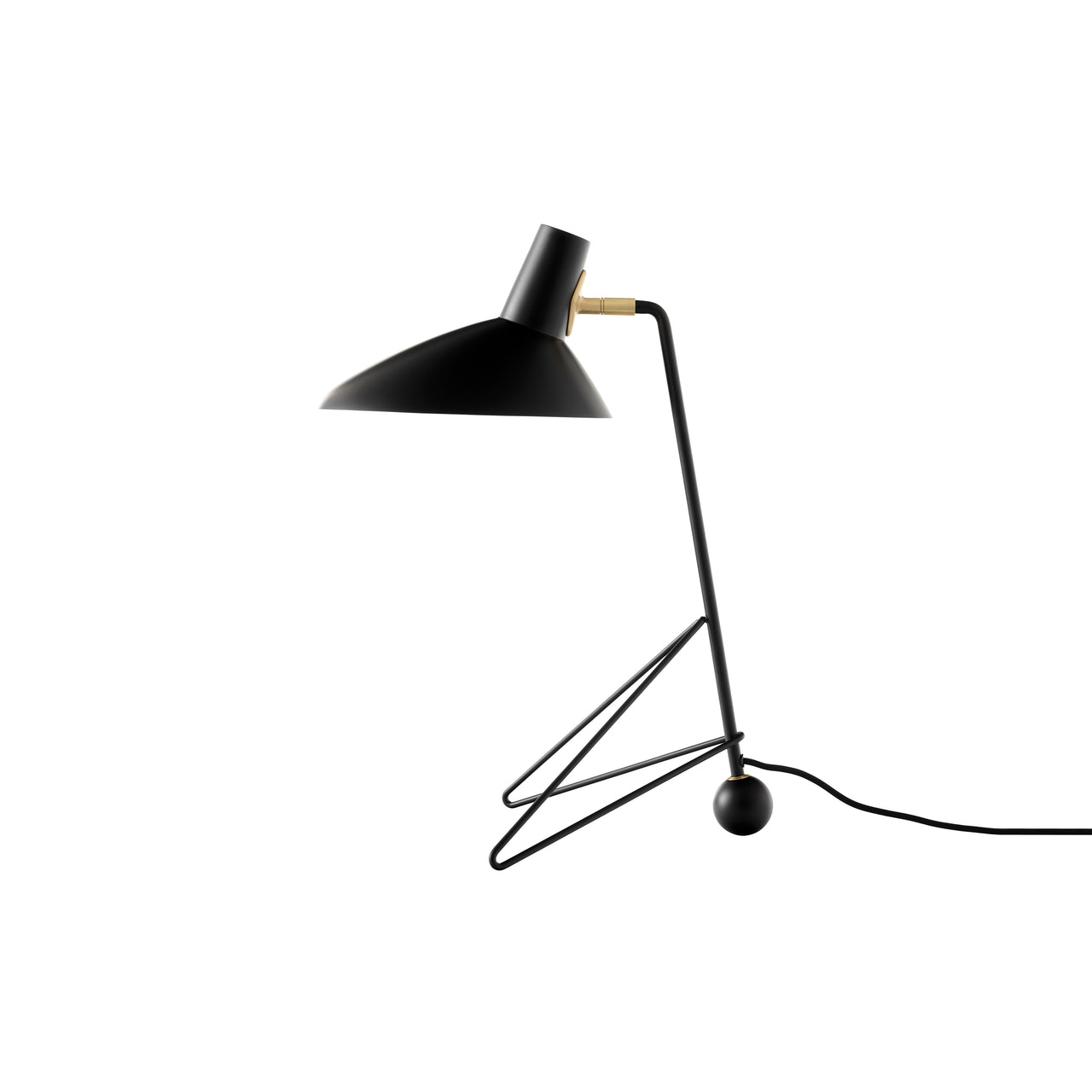 In the shadow of its floor lamp, &Tradition has expanded Tripod to include a table model with the same timeless design. Fashioned from powder-coated steel tubing with brass details and the shade spun from a single piece of aluminum, it reflects the crisp minimalism of midcentury duo Hvidt & Mølgaard. The scaled-down table version is available in black, maroon or moss with a lacquered matte-satin finish.