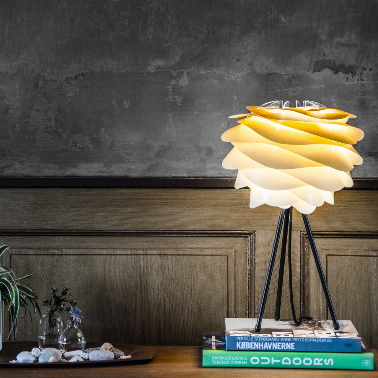 Choose a pop of color or a soothing neutral in a whirl of gradient tones or go for pure white in Caramina's table lamp. Inspired by the wavy dunes at Denmark's coastline, designers Anders Klem and Sřren Ravn Christensen conceived a spiraling polypropylene shade that contrasts with the classic 3-legged metal base. Both a colorful accent and a diffused warm light, its apropos on a sideboard, end table or bedroom nightstand.