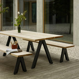 Angled steel table legs prove an invigorating contrast to the tactile plank surface of Overlap. Apropos indoors and out, the dining table from design studio TAF features long-wearing construction, with the steel electro-galvanized with zinc under the anthracite powder-coat finish. Left to the elements, the Western Red Cedar tabletop naturally turns a weathered silvery grey.