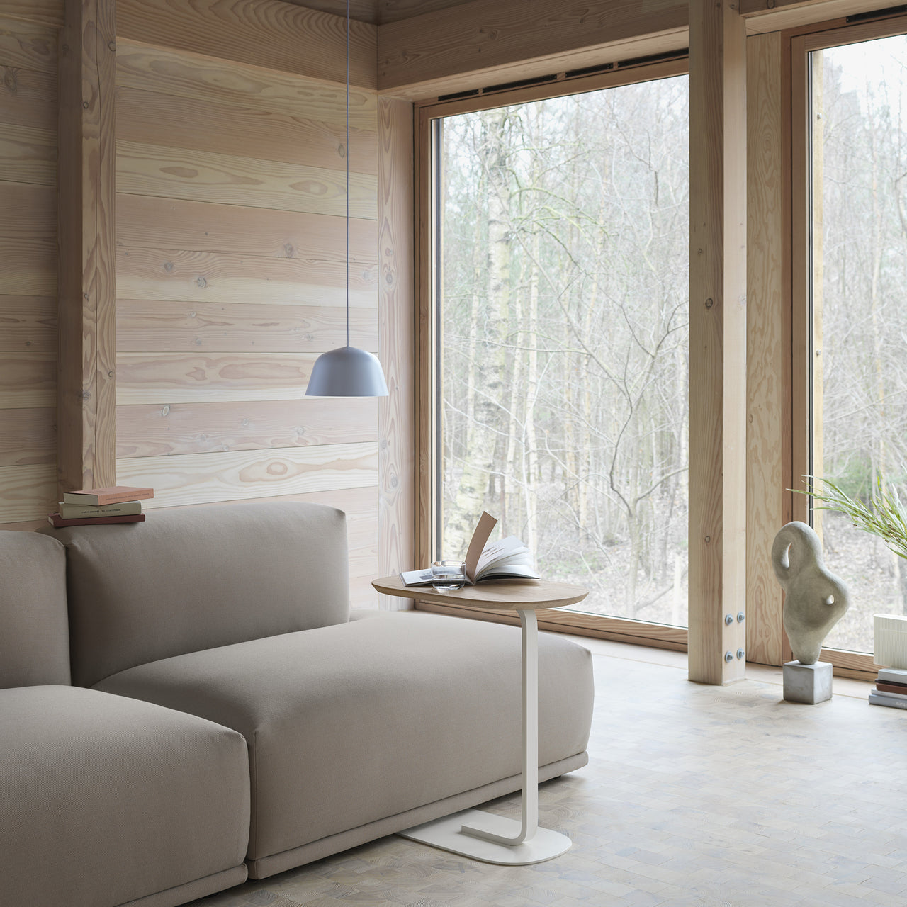 Swedish designers Gabriella Gustafson and Mattias Ståhlbom of TAF Architects specified the suspension cord be color-matched to the hand-painted shade to play up the contrast between linear and rounded shapes. In press-spun aluminum, the shade's interior is painted a soft white for a tonal contrast to the Nordic palette—and to provide maxim illumination. Danish maker Muuto once again brings its hallmark "new perspective" to light.