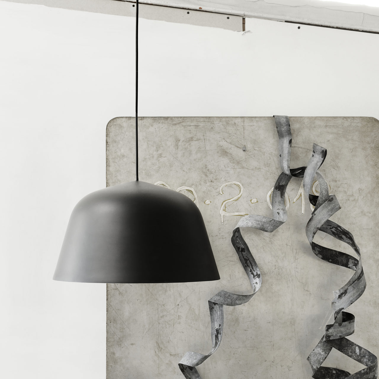 Swedish designers Gabriella Gustafson and Mattias Ståhlbom of TAF Architects specified the suspension cord be color-matched to the hand-painted shade to play up the contrast between linear and rounded shapes. In press-spun aluminum, the shade's interior is painted a soft white for a tonal contrast to the Nordic palette—and to provide maxim illumination. Danish maker Muuto once again brings its hallmark "new perspective" to light.