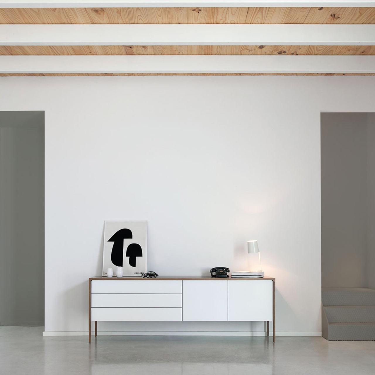 The Tactile Sideboard needs but a gentle touch to open the doors or drawers via push-latches. From Spanish maker Punt and noted British designer Terence Woodgate, the cabinetry has a seamless effect with no handles to clutter the view. A choice of wood veneers appears to curve around the recessed front in a contrasting glossy black or white finish. In a range of sizes, the Tactile Sideboard was recognized by Wallpaper magazine as a best in class design.