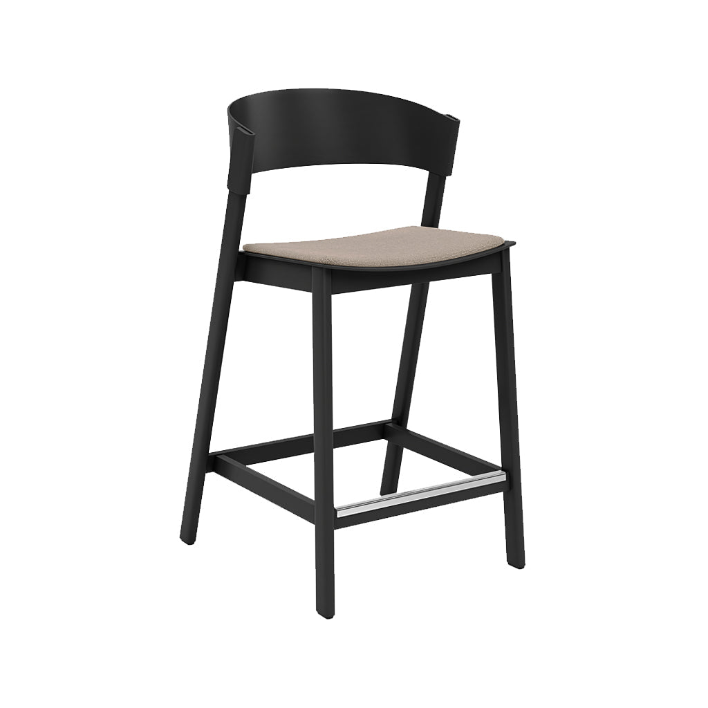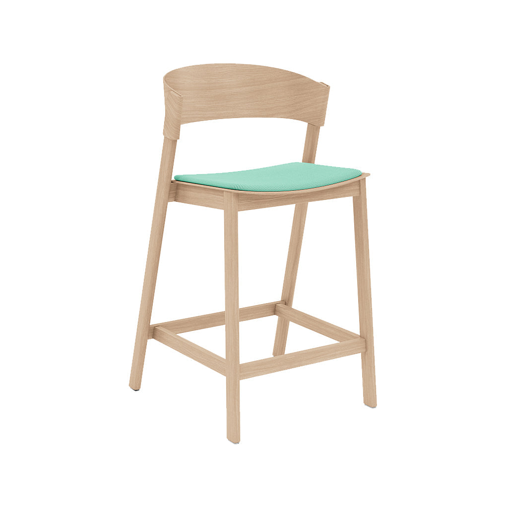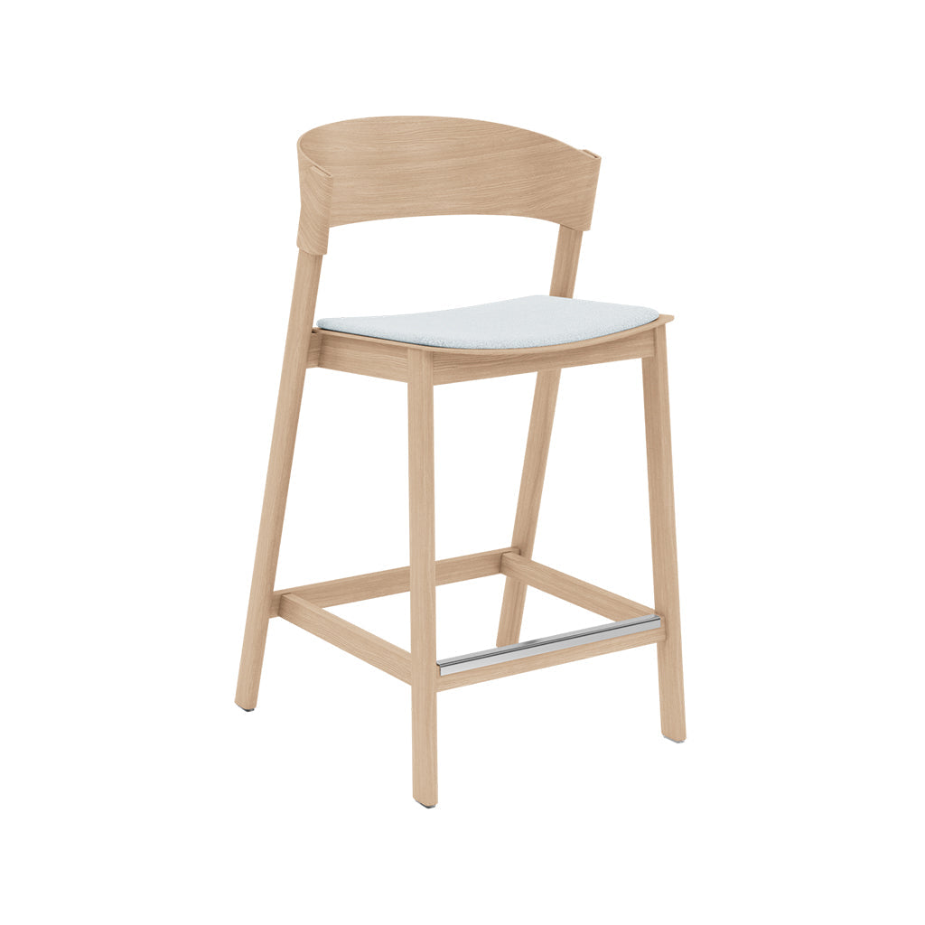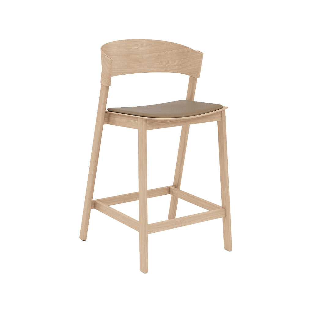 In natural lacquered oak with a buttery cognac-colored leather seat, Muuto offers an fine upholstered version of Thomas Bentzen's wood counter stool. Form-pressed veneer gets a graceful Scandinavian interpretation in the curve of Cover's backrest that folds around the rear legs with elegant simplicity. A similarly cradling rounded seat and integrated footrest assure hours of comfort at mealtime, when entertaining or even at a workplace counter desk.