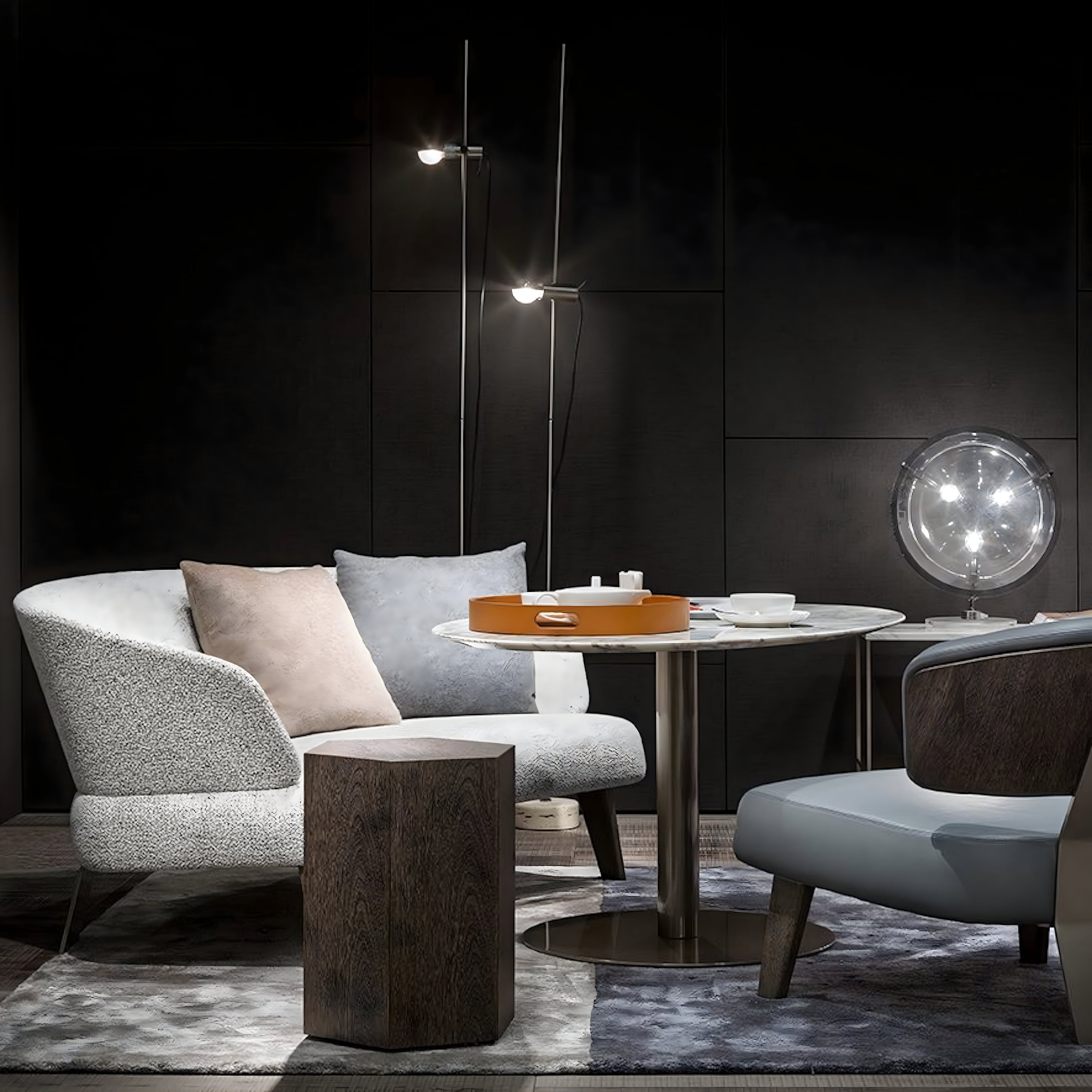 The Agnoli Floor Lamp, designed by Tito Agnoli in 1954 for Oluce, is considered a pioneering example of minimalist design. This lamp features a sleek nickel-plated stem with a height-adjustable reflector mounted on a sliding mechanism, offering precise direct lighting. A distinctive element is its base, crafted from travertine stone, adding a subtle touch of elegance to the otherwise utilitarian design.