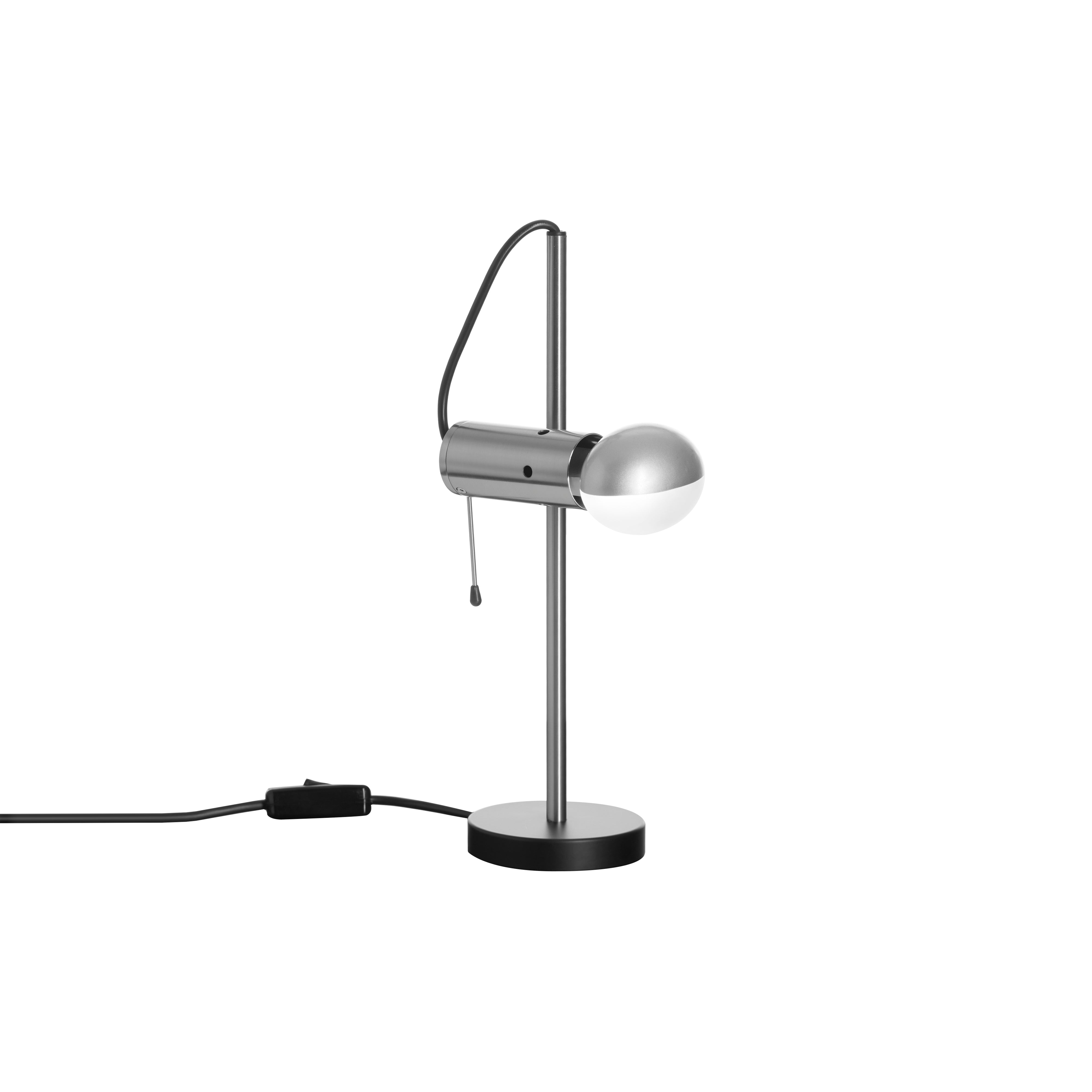 A slender, matte nickel-plated stem, available in two finishes, supports an adjustable reflector. Mounted on a sliding mechanism, the reflector allows for precise light direction.
