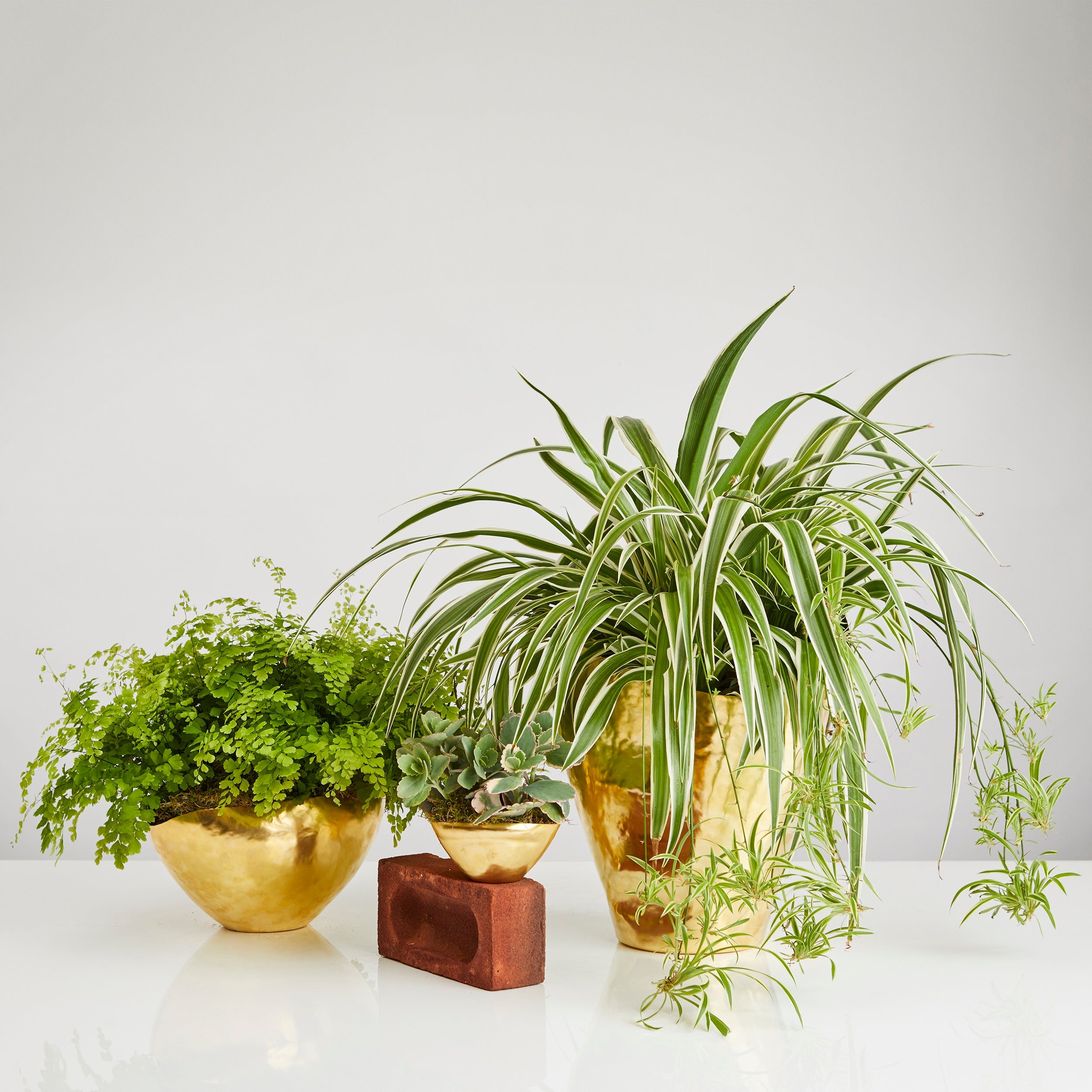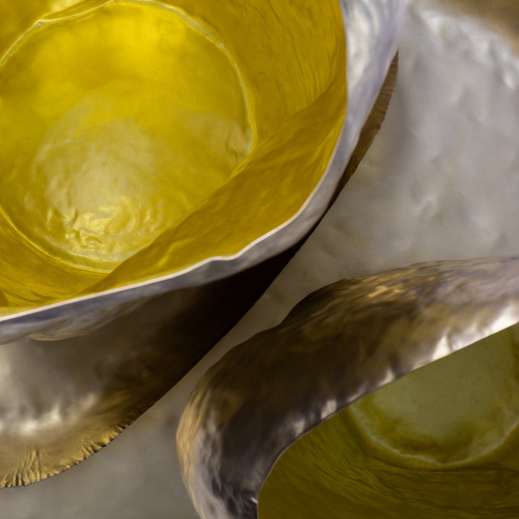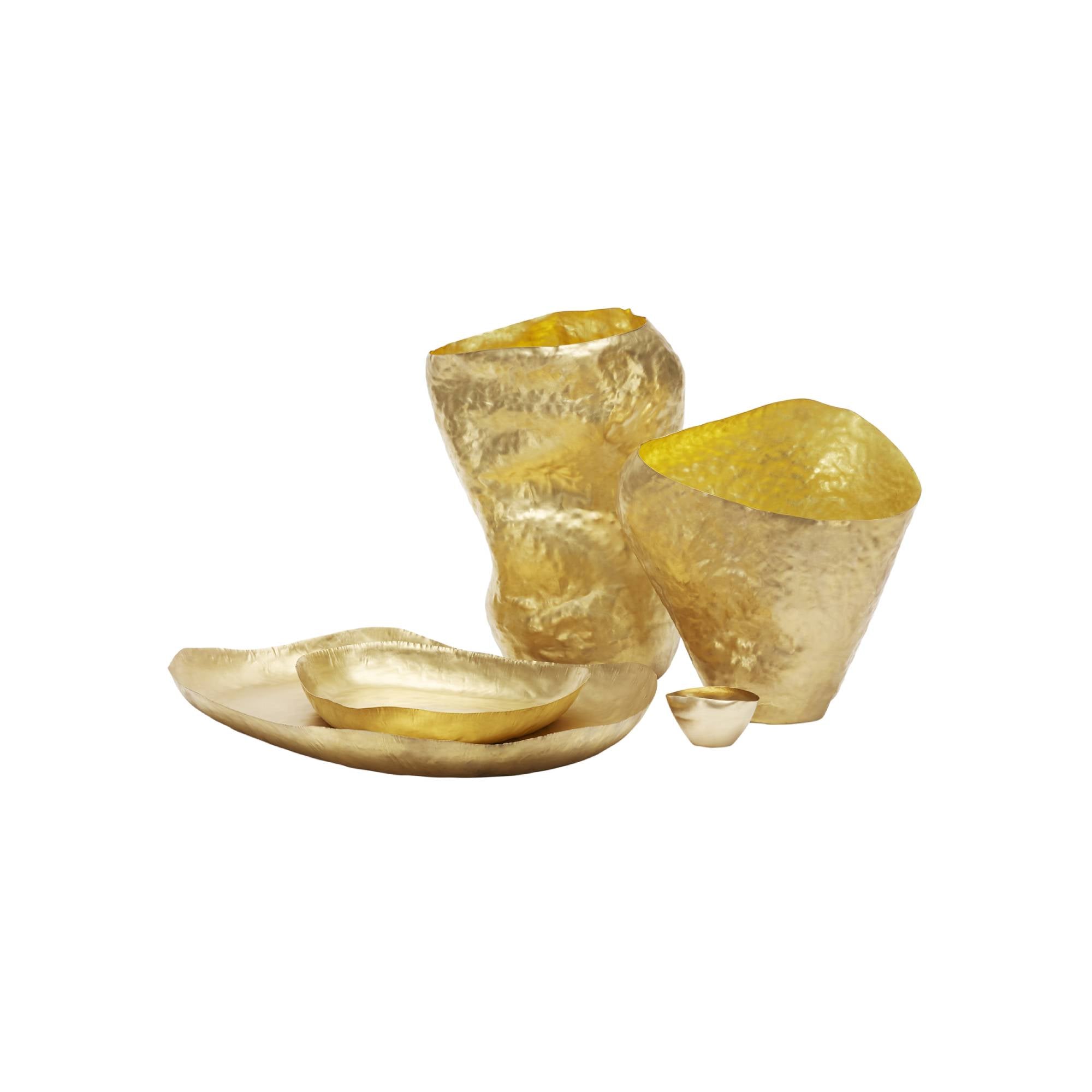There’s an appealing spontaneity in this Bash crimped and hammered wide brass vessel. Each one bears the unique imprint of the craftsman and is fashioned from a single sheet of metal. Surprisingly delicate in appearance, the final product gets a wash for a matte finish but will develop a fine oxidized patina over time.
