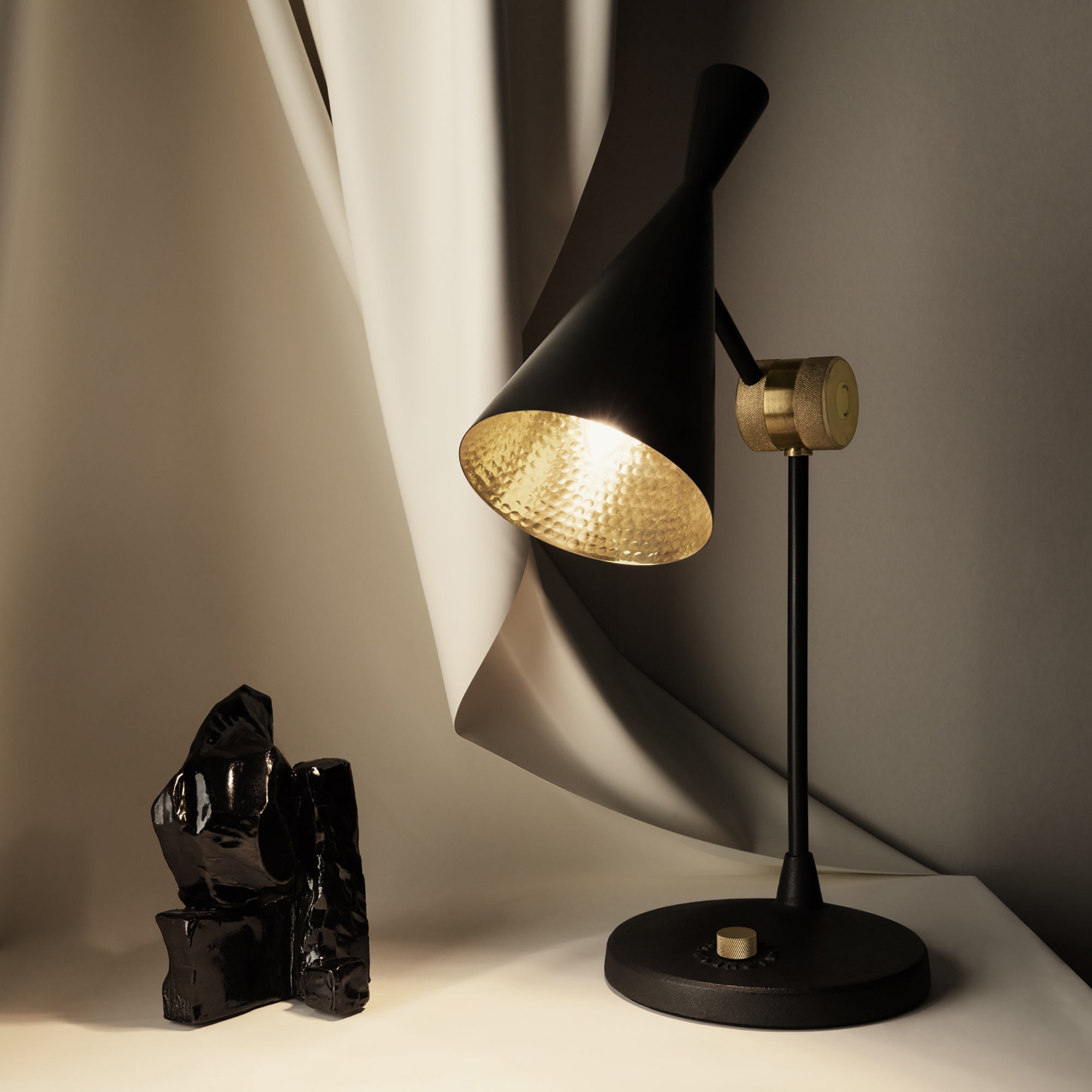 A variation on British designer Tom Dixon's signature Beat Collection, this table or desk lamp features a slender articulated arm that can be adjusted to direct the light beam. Handcrafted in solid brass with a sand-cast iron base, the series is distinguished by its beaten and brushed brass shade. Inspired by traditional Indian water vessels, the silhouette remains just as timeless today.
