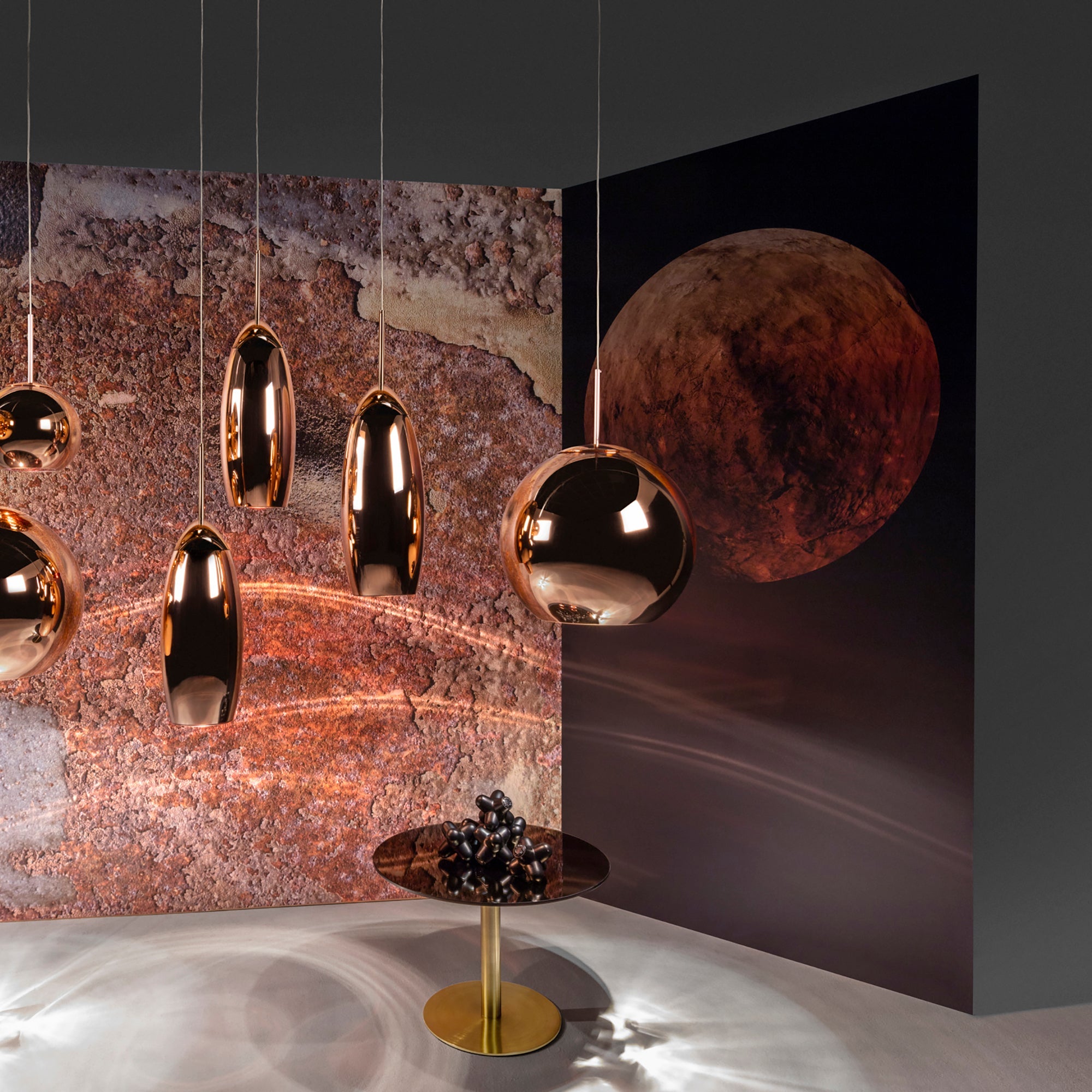 Translating a fondness for disco glam to the home front, designer Tom Dixon's Flash range of tables brings a lively gleam in any setting. As a cocktail or side table, the round model combines a metallic mirror surface in dark bronze with an antique-brass spool base. Dramatic as a singular addition or pump up the volume by clustering with the other multilevel tables in the series.