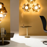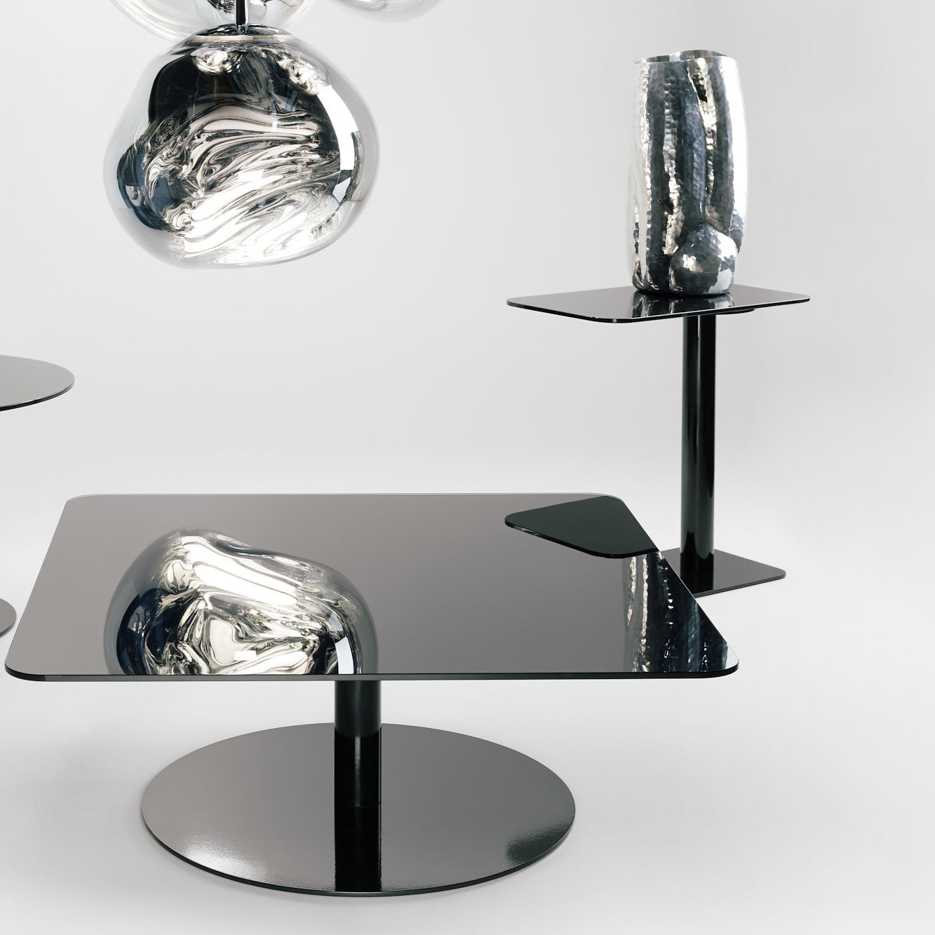 The rectangular version of Brit designer Tom Dixon's Flash Table makes for an eye-catching metallic side table that can also cantilever over a sofa. Putting a spark of glam rock into room decor, the tabletop glimmers in dark-bronze mirror. It's set off-center on the antiqued brass base- so the piece can readily be positioned close at hand to seating.