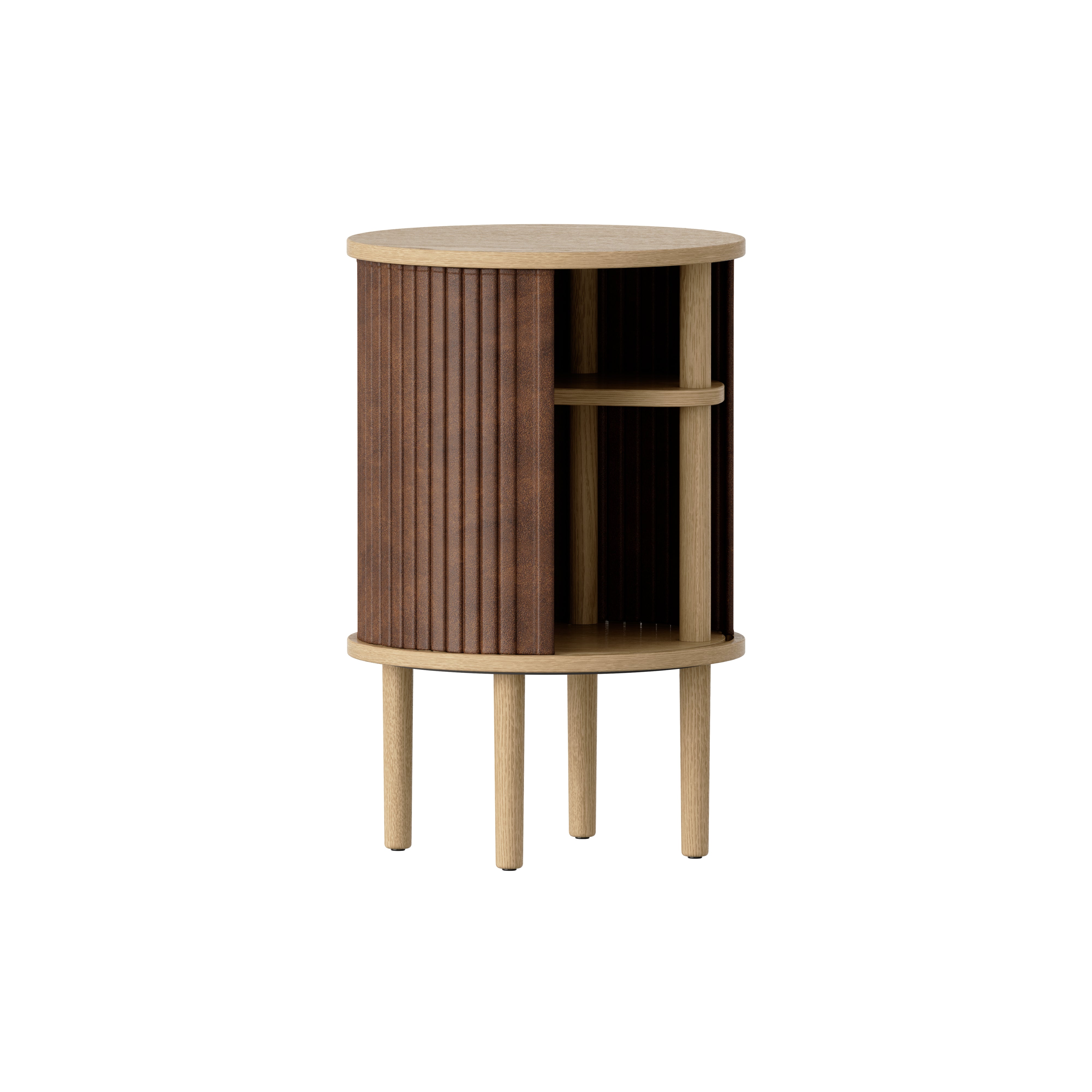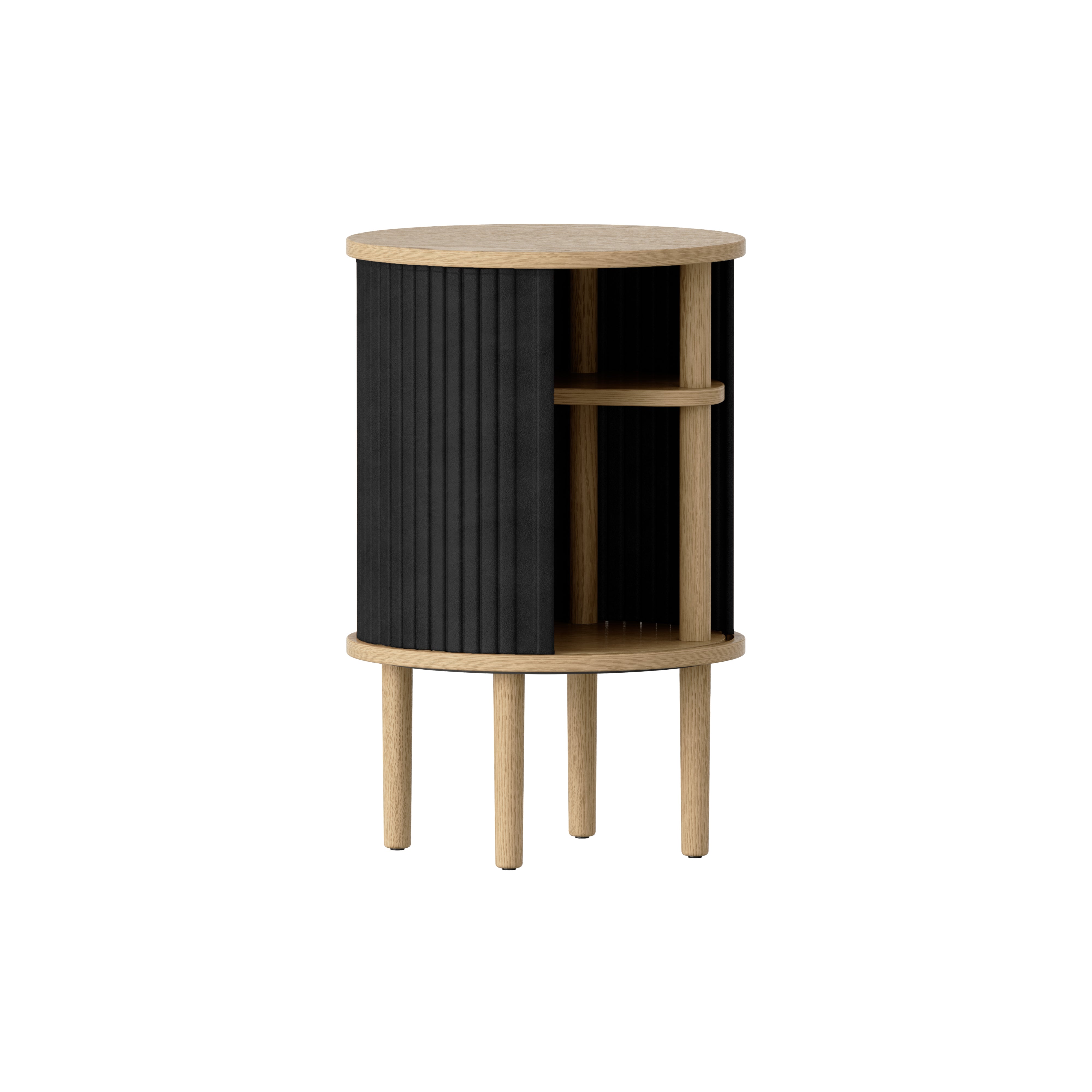 In a compact version, Audacious’ striking rounded dimensions make for a perfect bedside or sofa table. Designer Jonas Søndergaard’s unique paneled-motif cabinet has special tambour doors that slide around the edge to open, leaving as much or as little of the interior as desired to be displayed. Inside, the table contains a hidden multi recharging hub with 4 USB outlets and a micro-USB. An inside shelf is shaped with a cutaway section for accommodating items of varied heights.