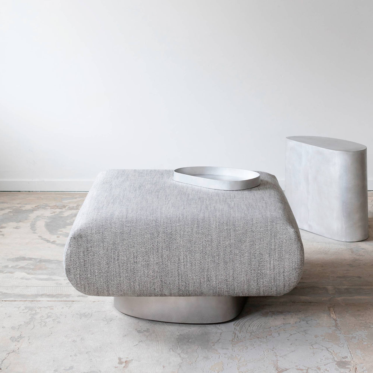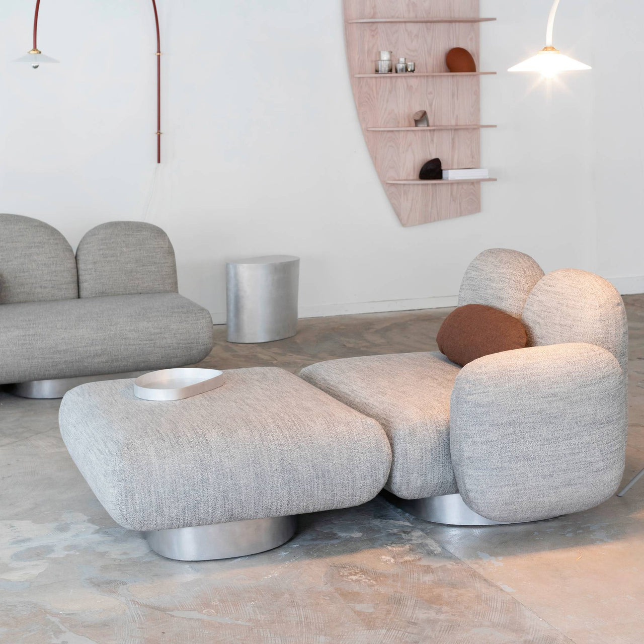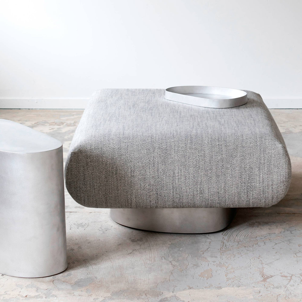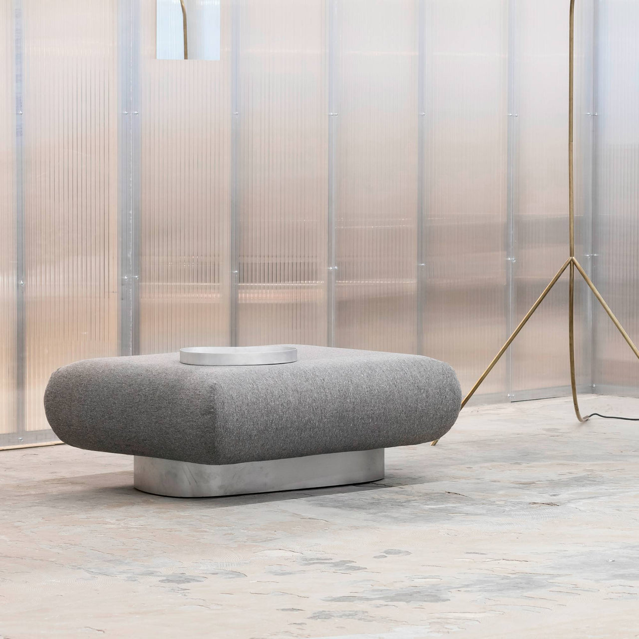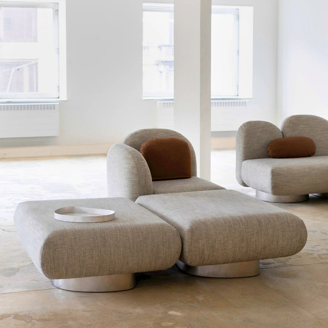 Assemble adds a versatile ottoman that can serve as an armless sofa extension or as a freestanding sitting perch or footstool. Alongside the companion upholstered modules from Valerie Objects’ seating range by studio Destroyers/Builders, the foam-fill components were developed to be neither too firm, nor very soft. With a choice of fabrics, the ottoman also rests on the distinctive rounded base clad in silvery aluminum, a unifying motif of the collection.